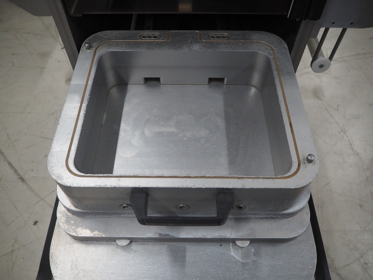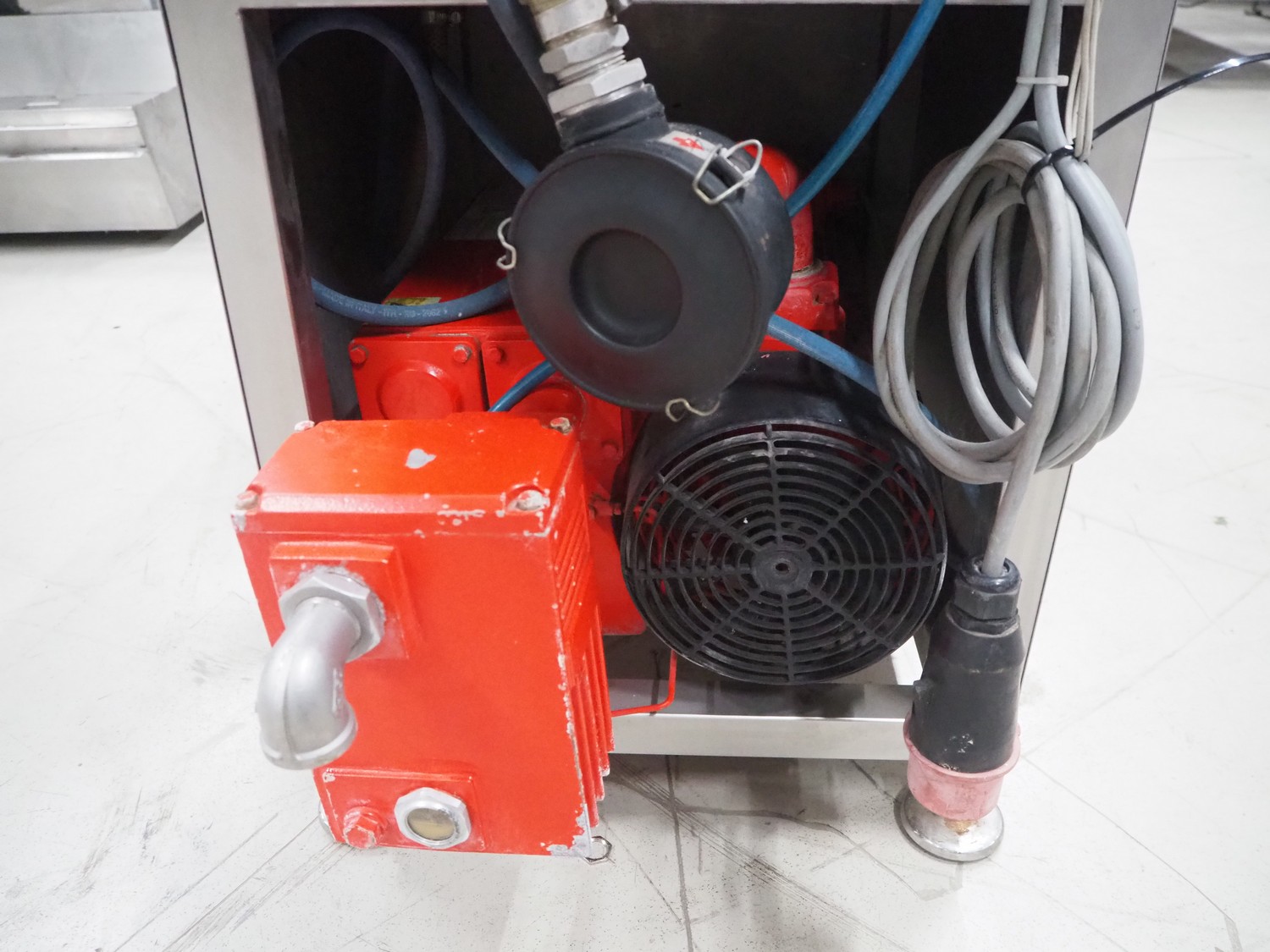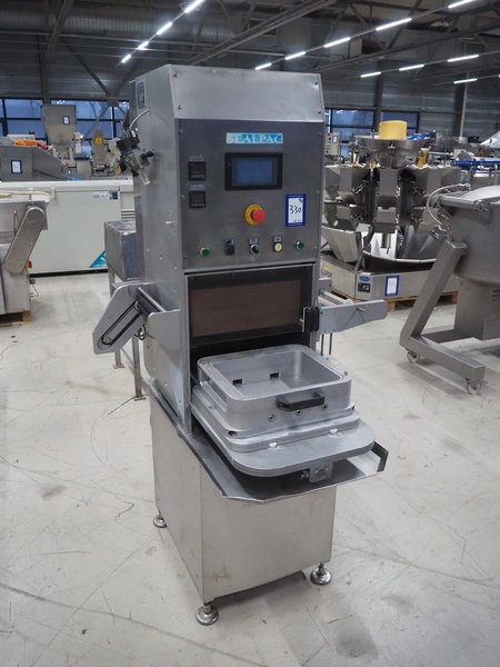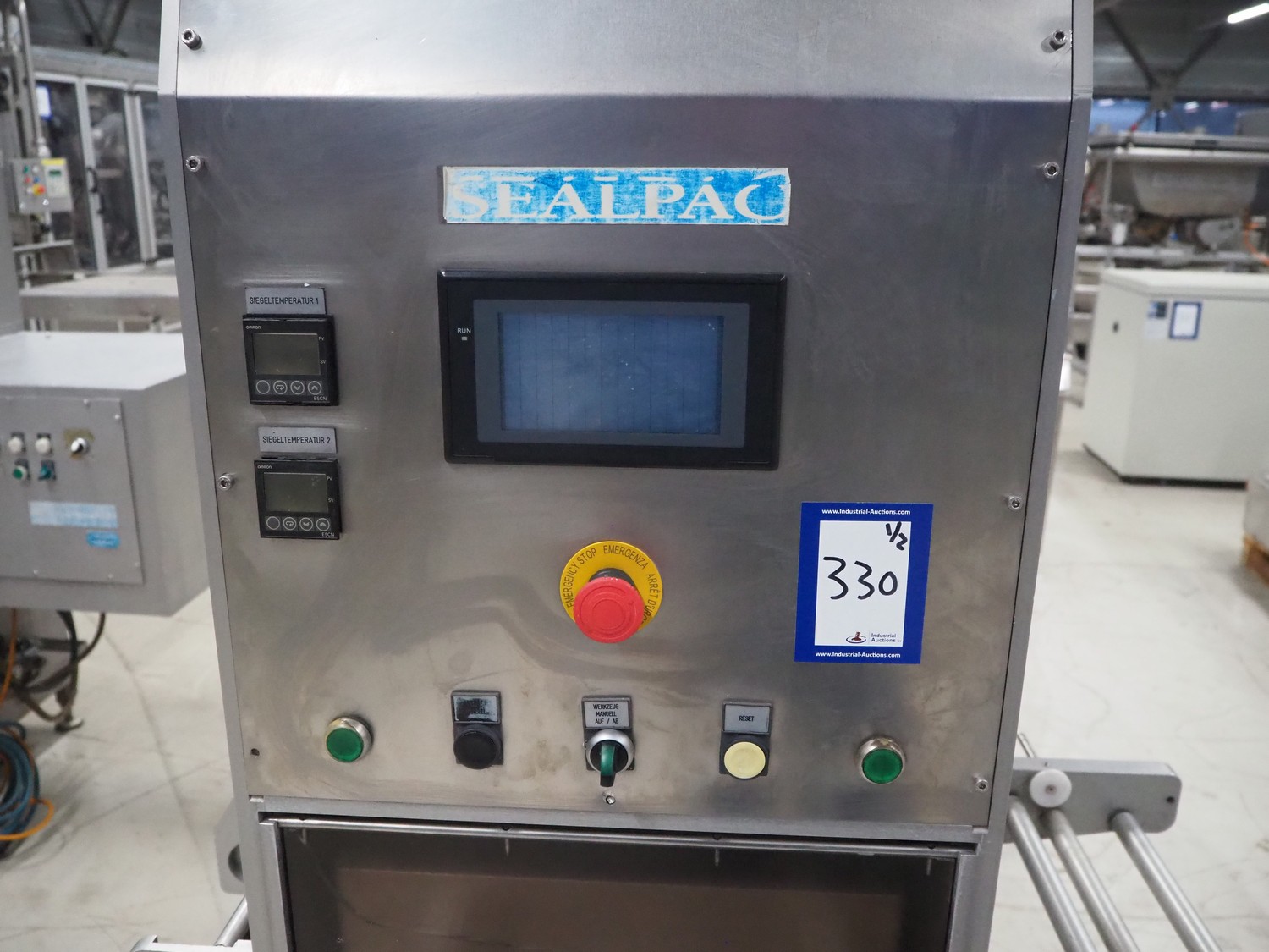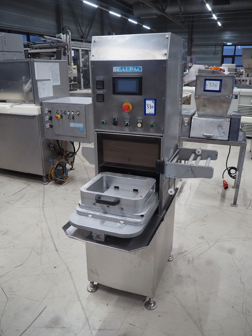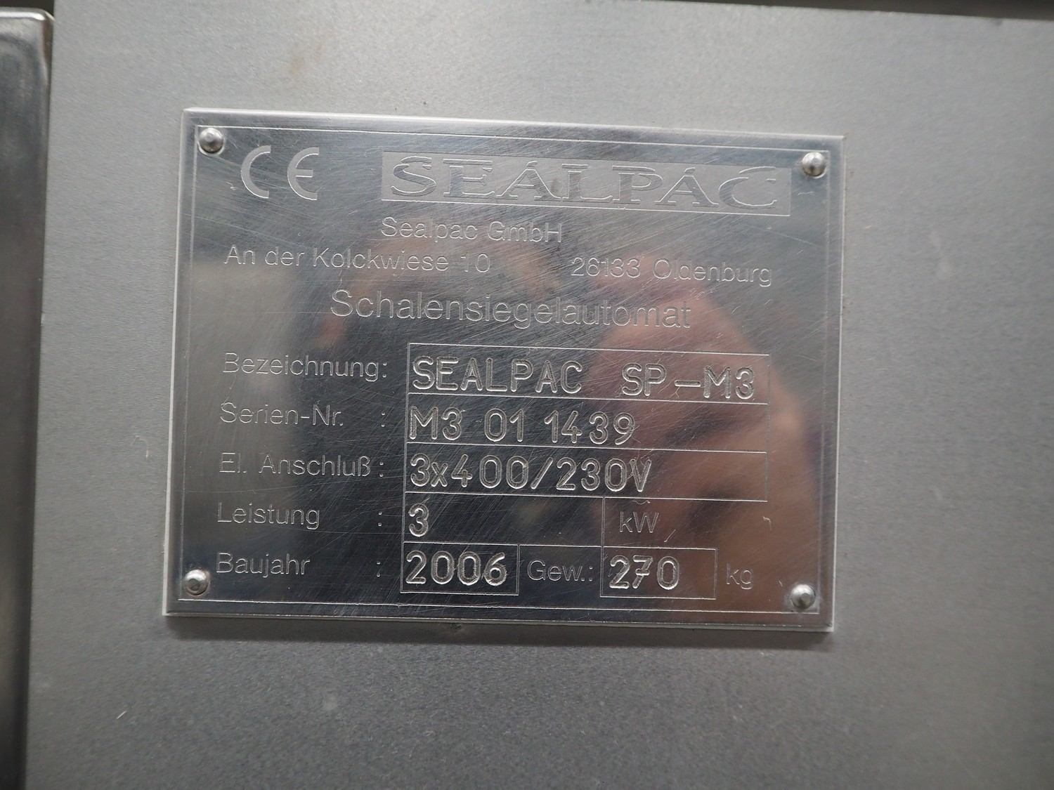 Sealpac traysealer, model: SP-M3, serial number: M3 01 1439, year of construction: 2006, 400/230 V, 3 Ph, 3 kW, 270 kg, dimensions dye: 315 mm x 265 mm, Busch vacuum pump, typer: RC 0063 E, capacity: 63 m³ per hour, total dimensions: 950 mm x 1200 mm x 1770 mm.