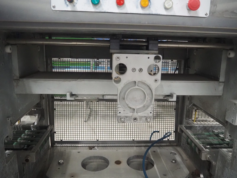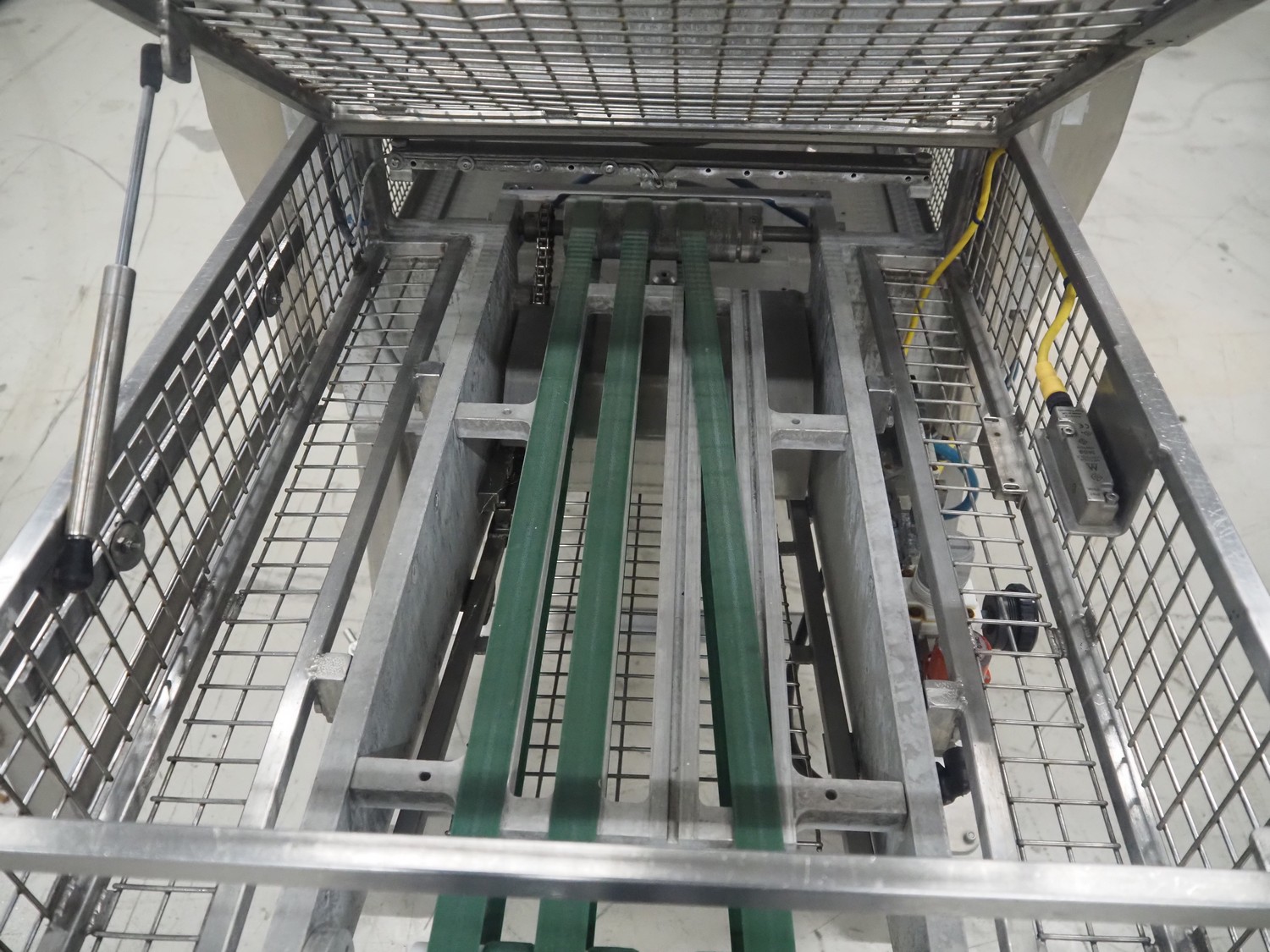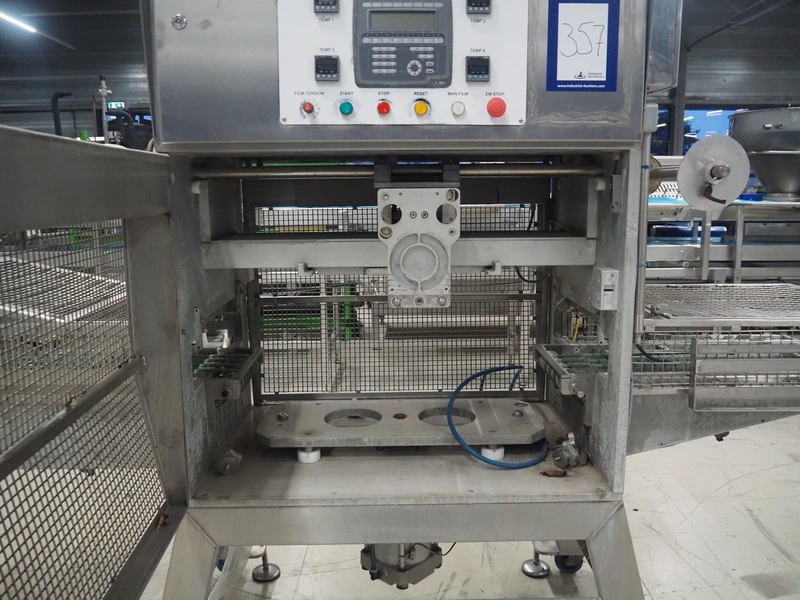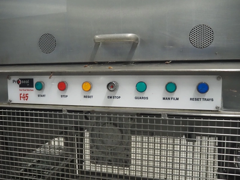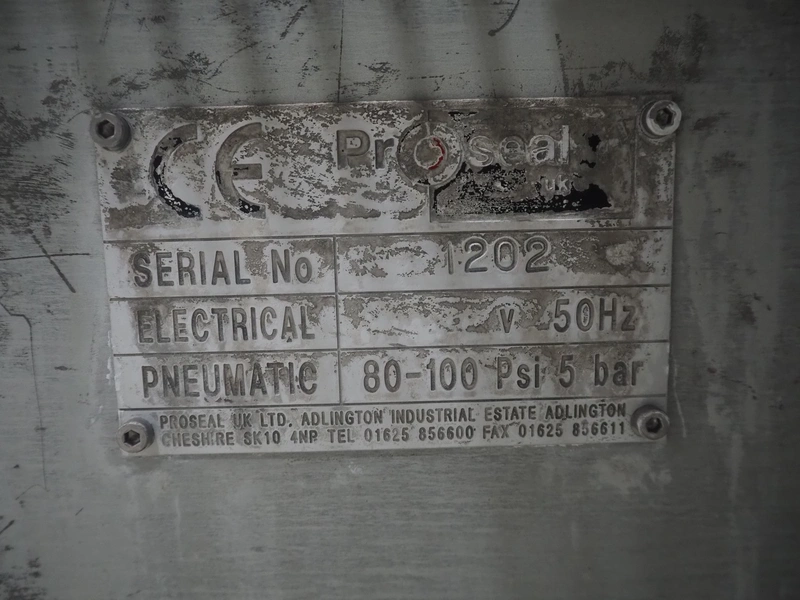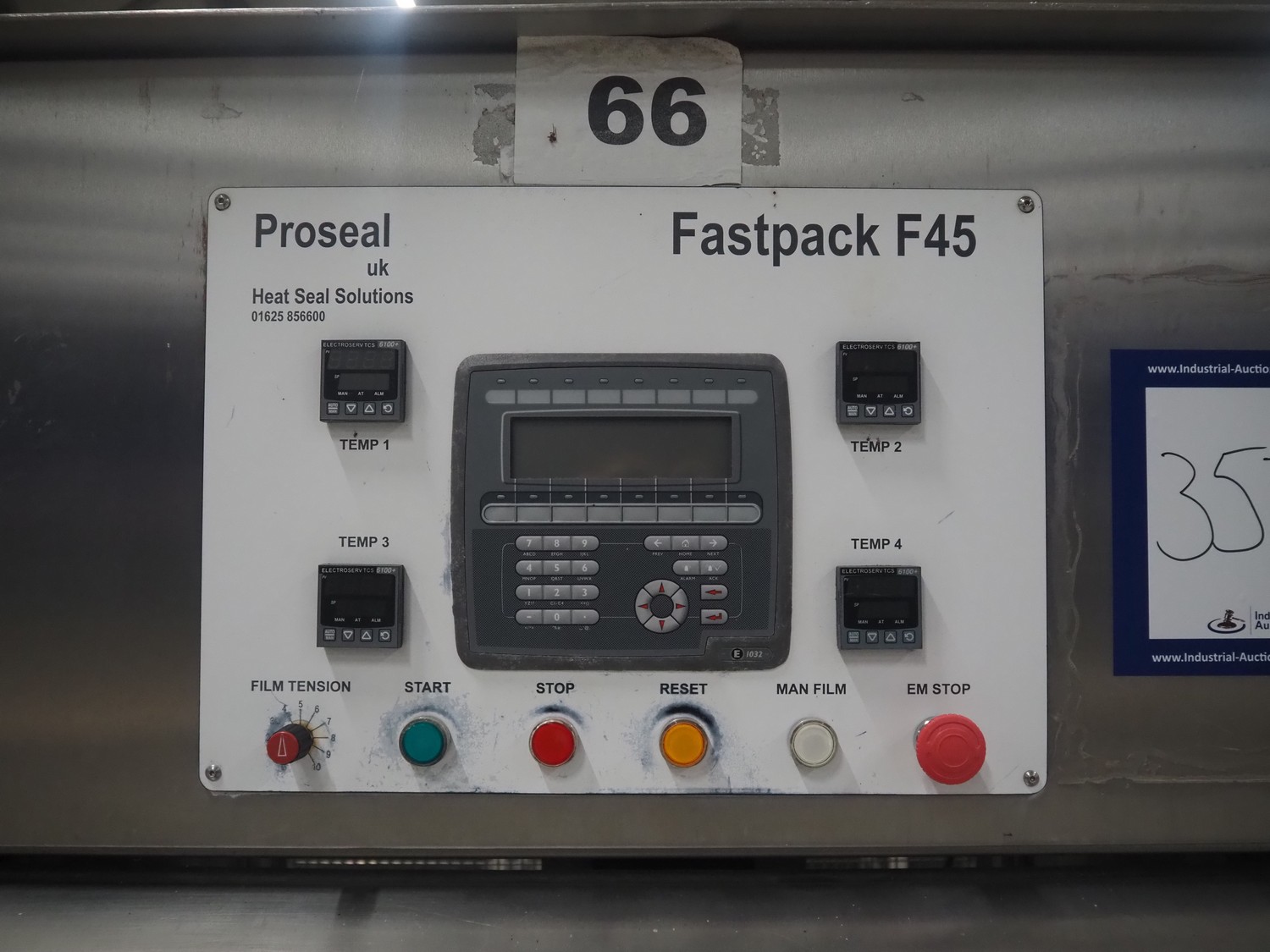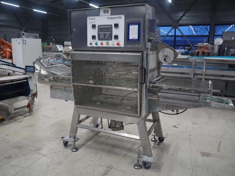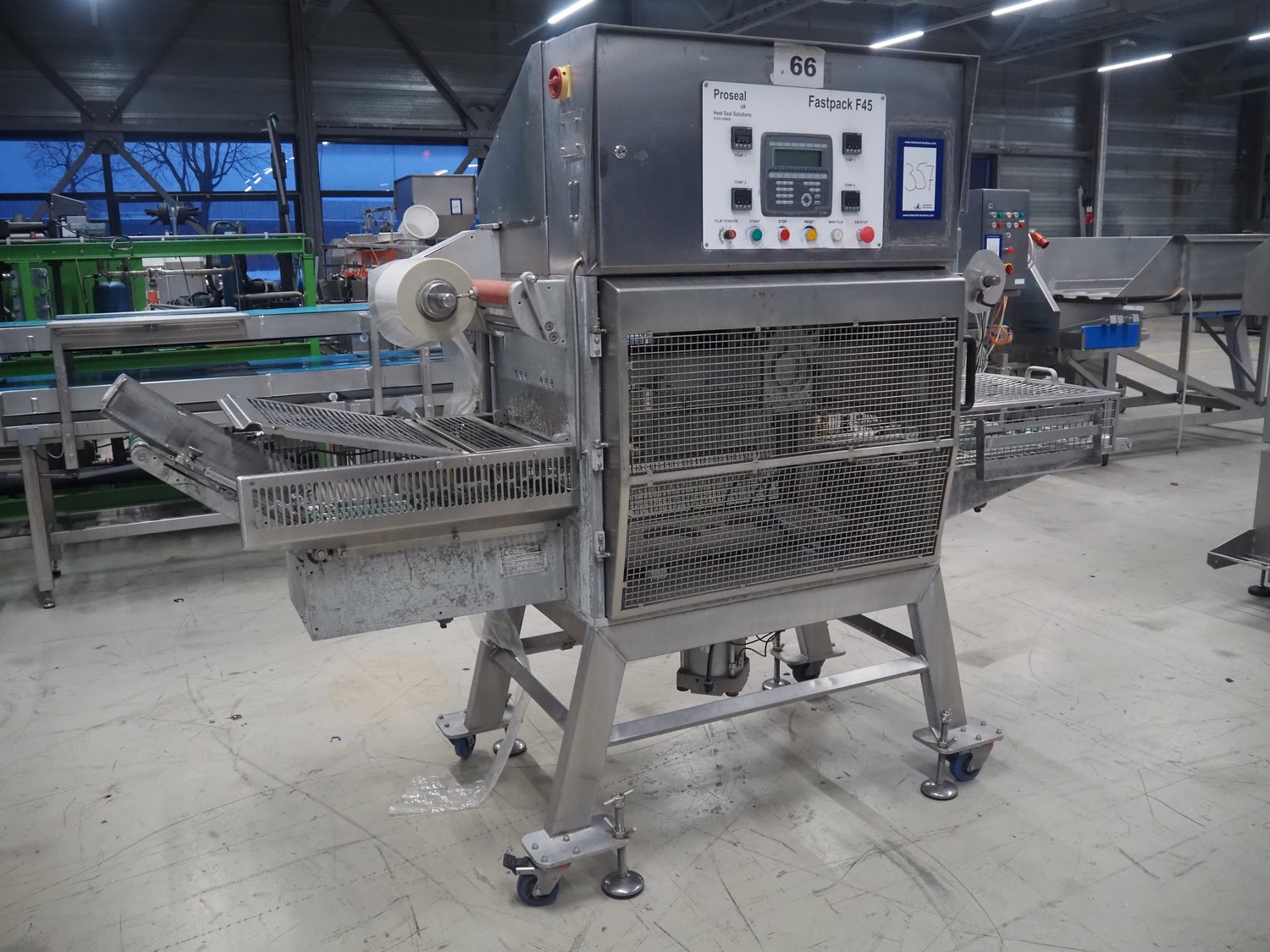 Proseal traysealer, type: Fastpack F45, serial number: 1202, 50 Hz, wire belt, belt width: 175 mm, film width: 215 mm, total dimensions: 2980 mm x 850 mm x 1950 mm. Incomplete, missing dye.
