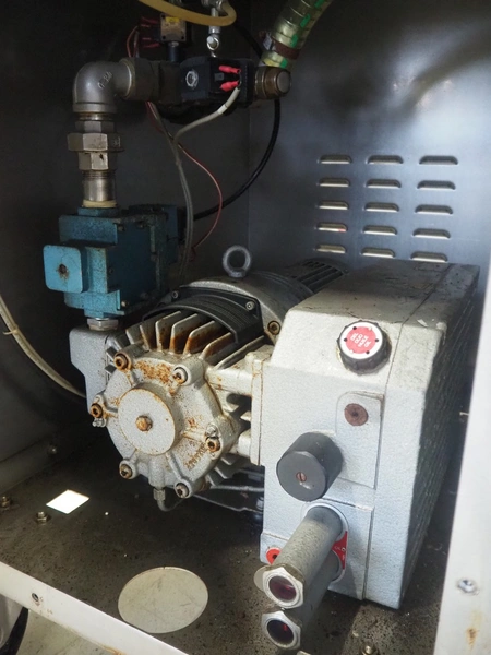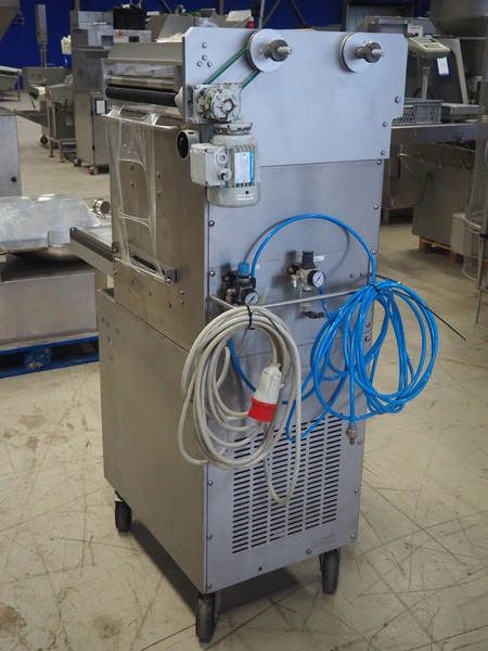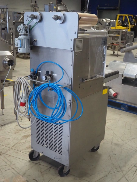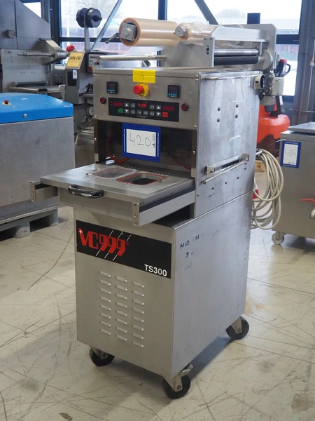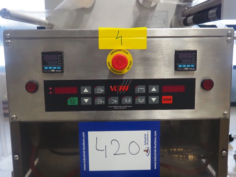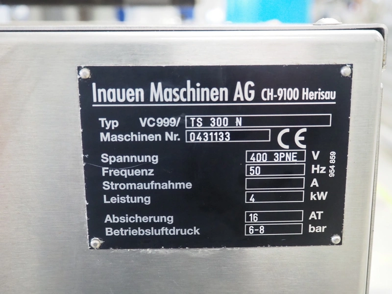 Inauen Maschinen AG mobile traysealer, model: VC999/TS 300 N, serial number: 0431133, 400 V, 3 Ph, 50 Hz, 16 A, dye: (2x) 185 mm x 135 mm, operating air pressure: 6–8 bar, Rietschle vacuum pump, type: VCA 40 (00), number: 602608440003, year of construction: 2004, capacity: 10 m³ per hour, total dimensions: 1120 mm x 600 mm x 1610 mm.