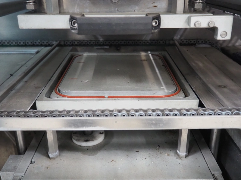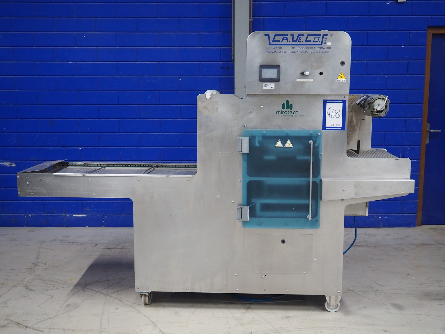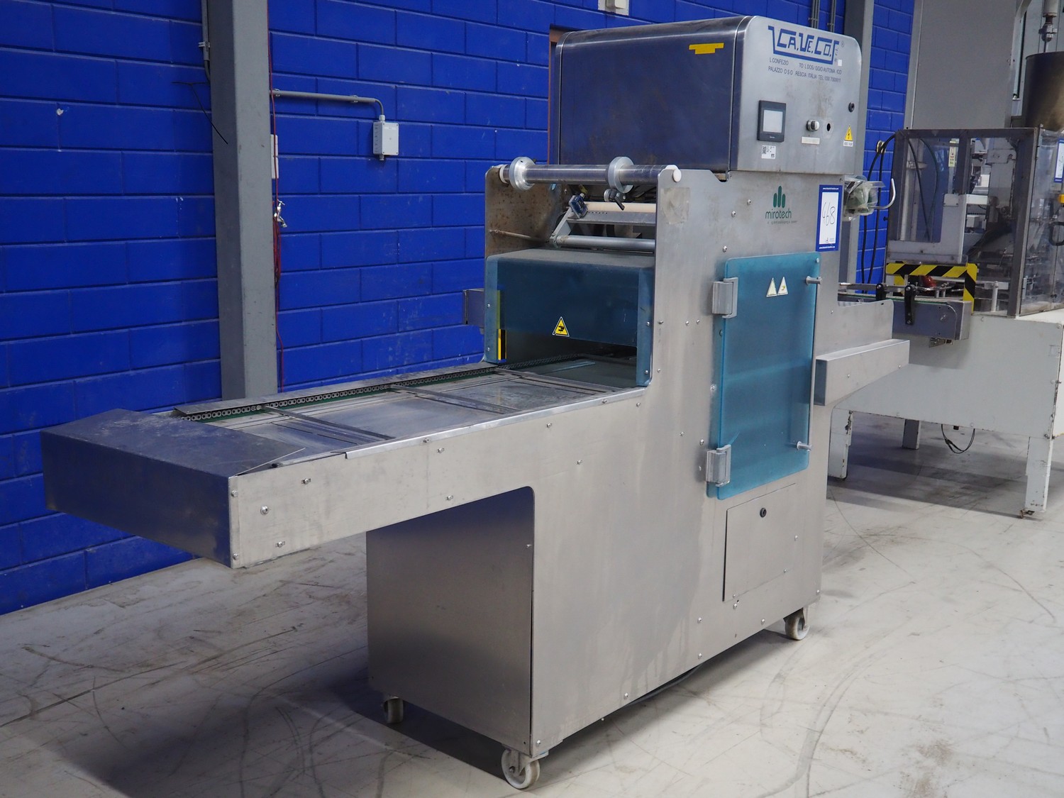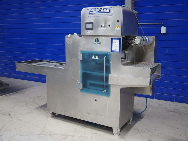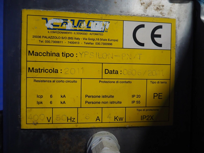 Ca.Ve.Co mobile traysealer, type: Ypsilon-PN/T, serial number: 2011, year of construction: 0606/2011, 400 V, 50 Hz, 6 A, 4 kW, chain-pin conveyor, belt width: 470 mm, distance between dividers: 370 mm, divider height: 25 mm, total dimensions: 2600 mm x 850 mm x 1870 mm.