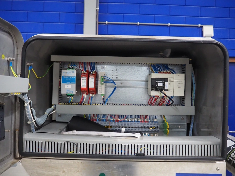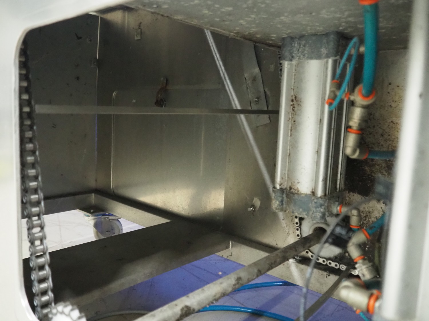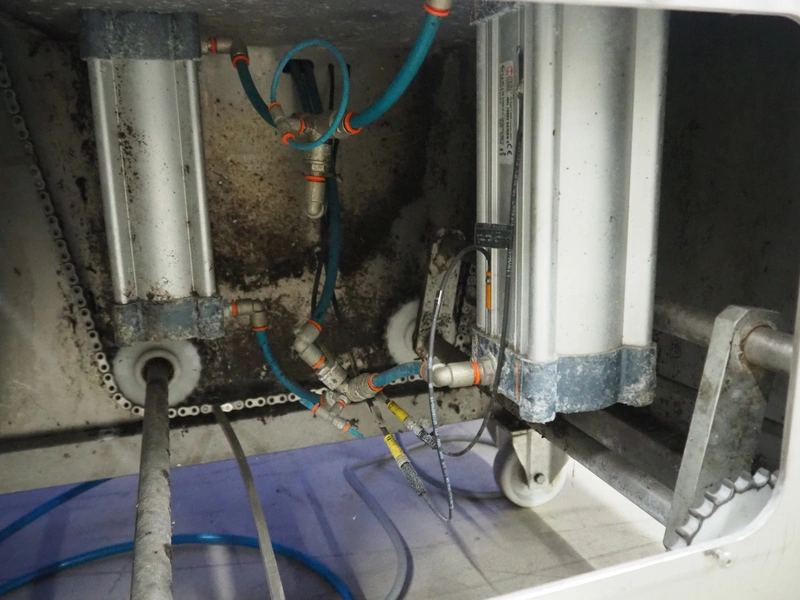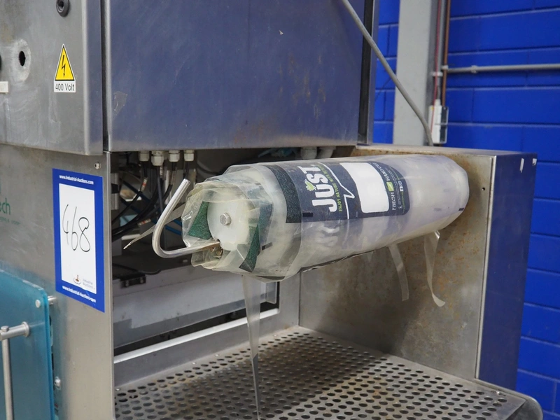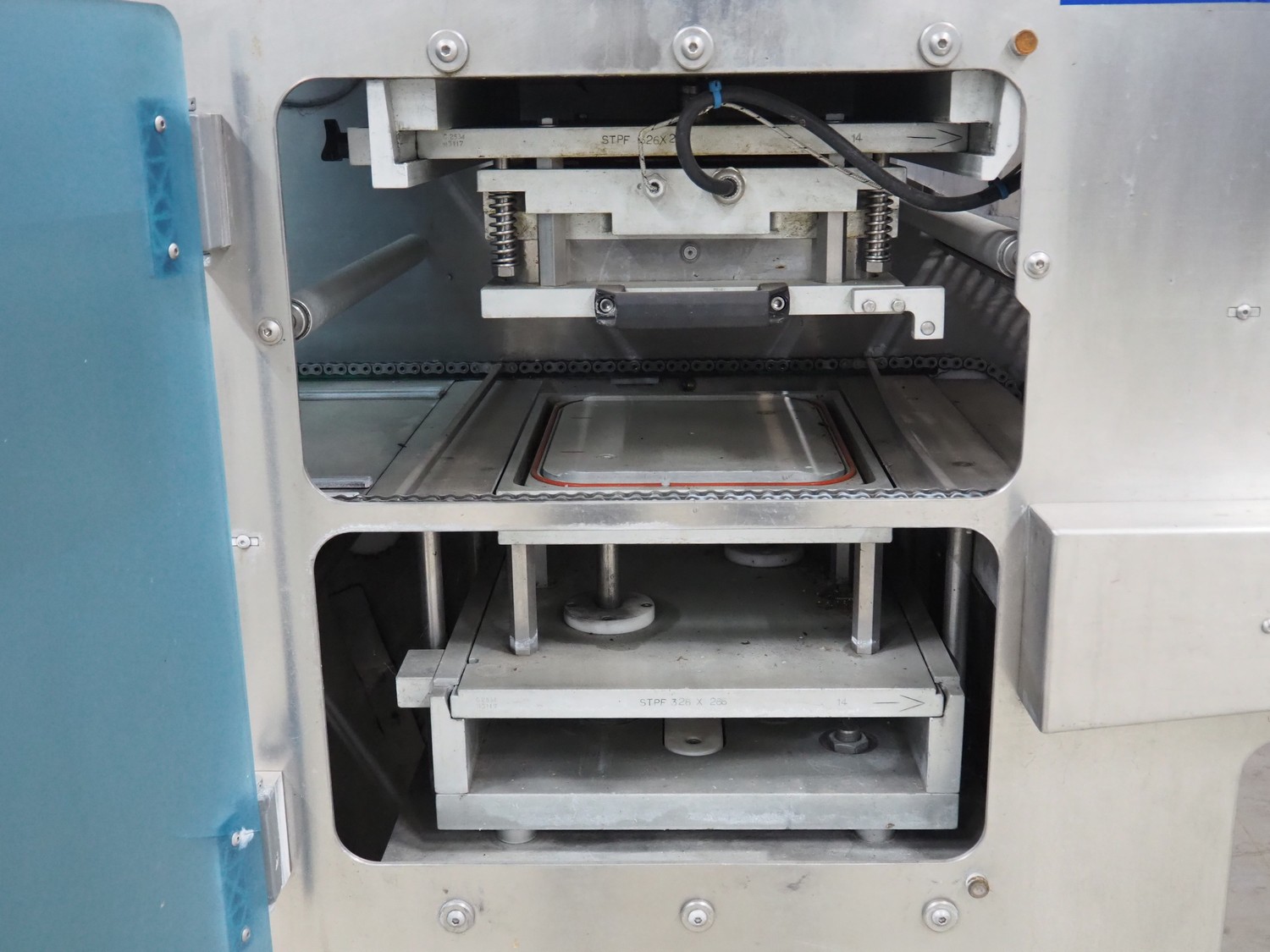 Ca.Ve.Co mobile traysealer, type: Ypsilon-PN/T, serial number: 2011, year of construction: 0606/2011, 400 V, 50 Hz, 6 A, 4 kW, chain-pin conveyor, belt width: 470 mm, distance between dividers: 370 mm, divider height: 25 mm, total dimensions: 2600 mm x 850 mm x 1870 mm.