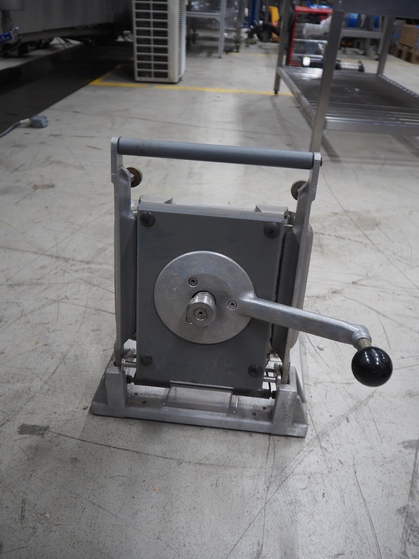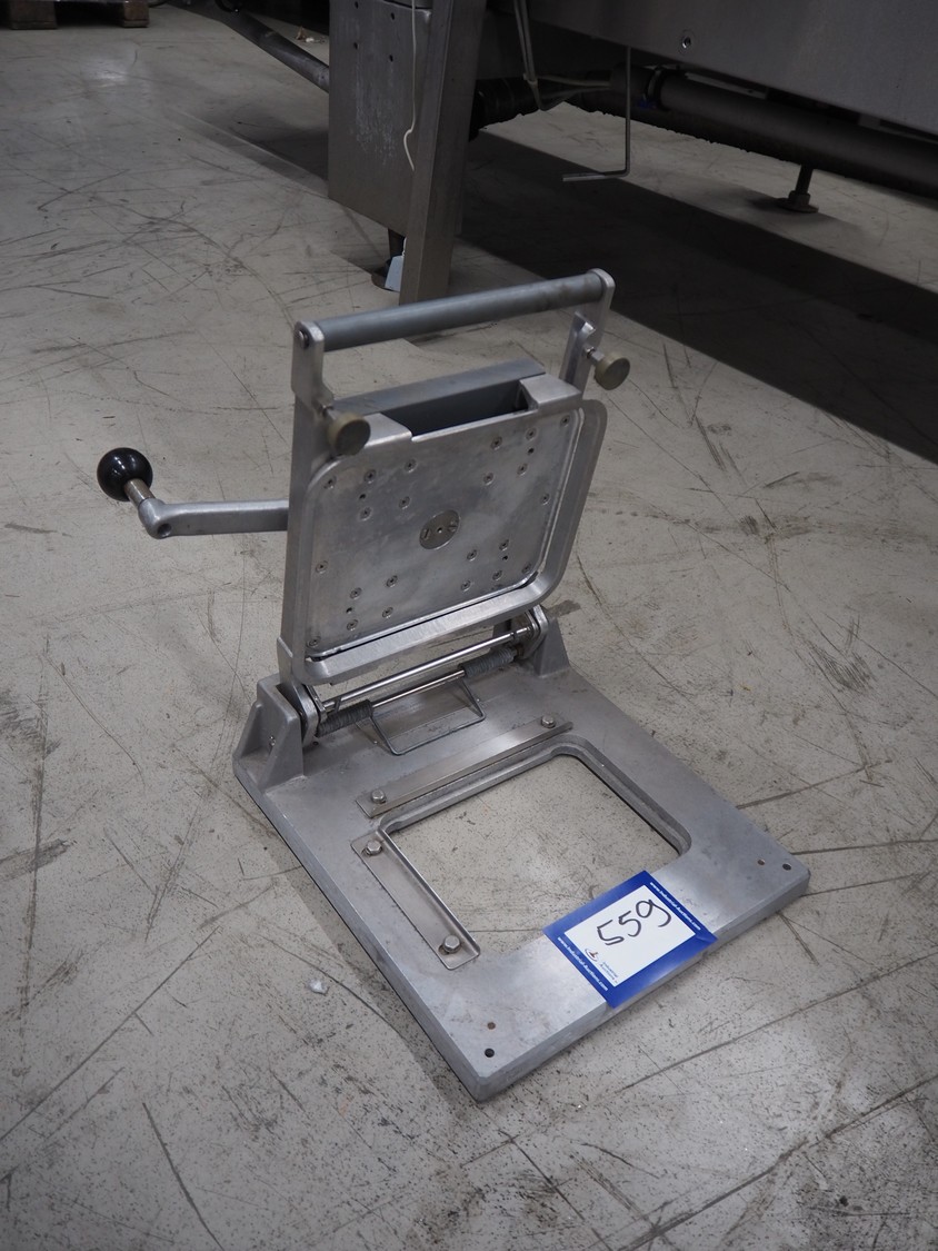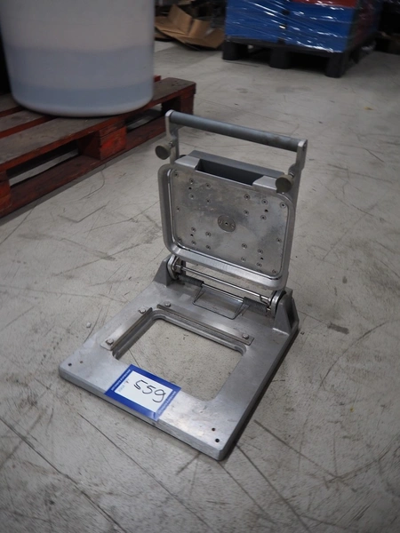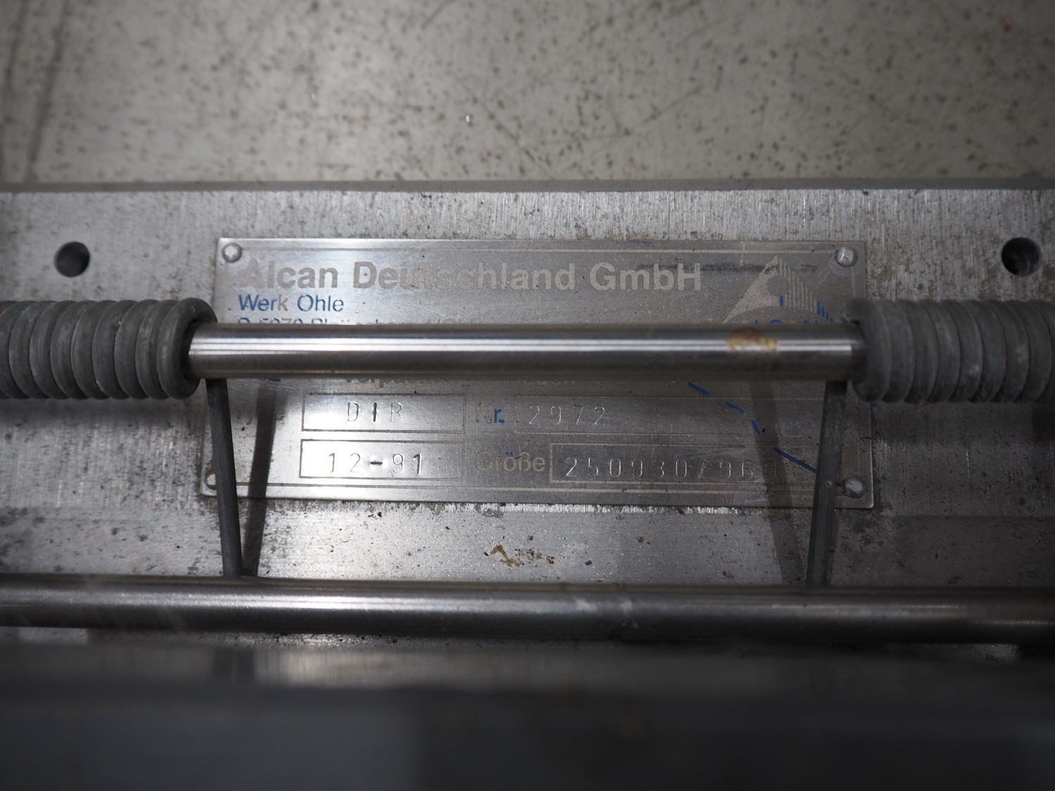 Alcan traysealer, type: DIB, number: 2972, year of construction: 12-91, dye: 205 mm x 145 mm, total dimensions: 380 mm x 350 mm x 230 mm.
