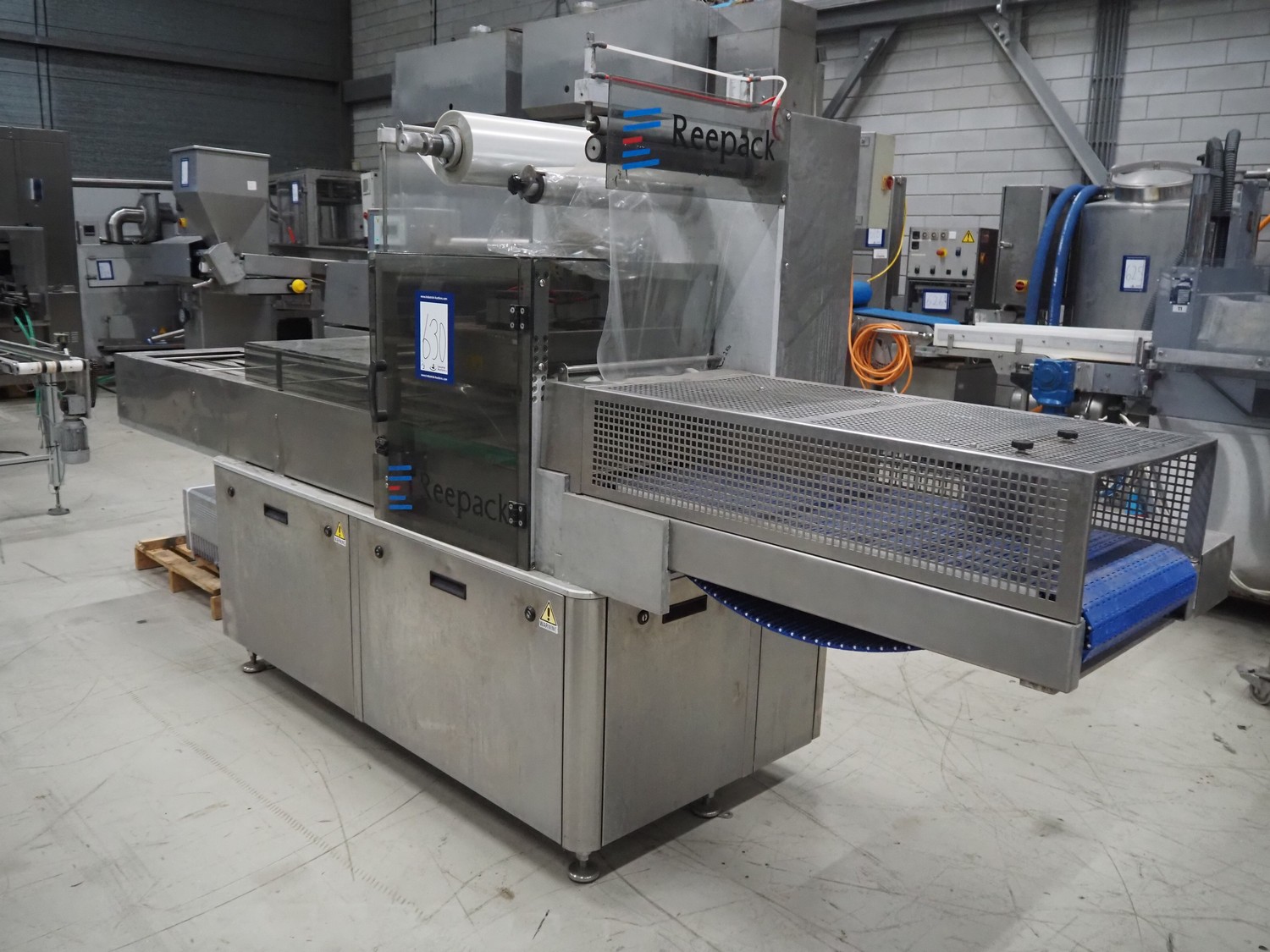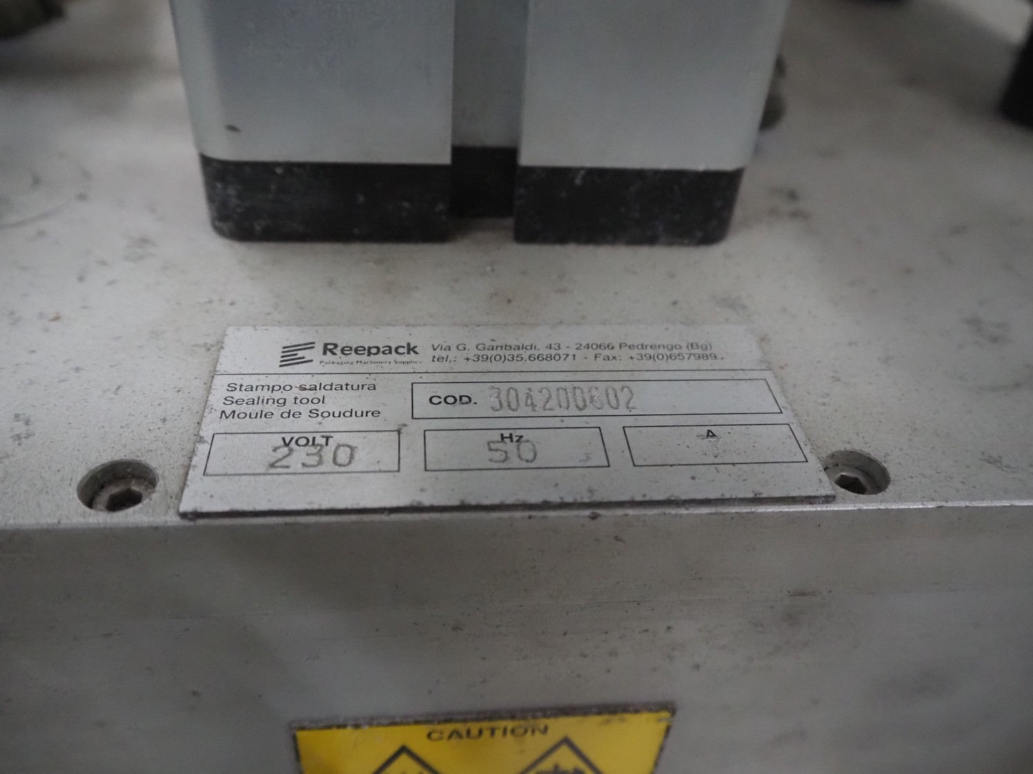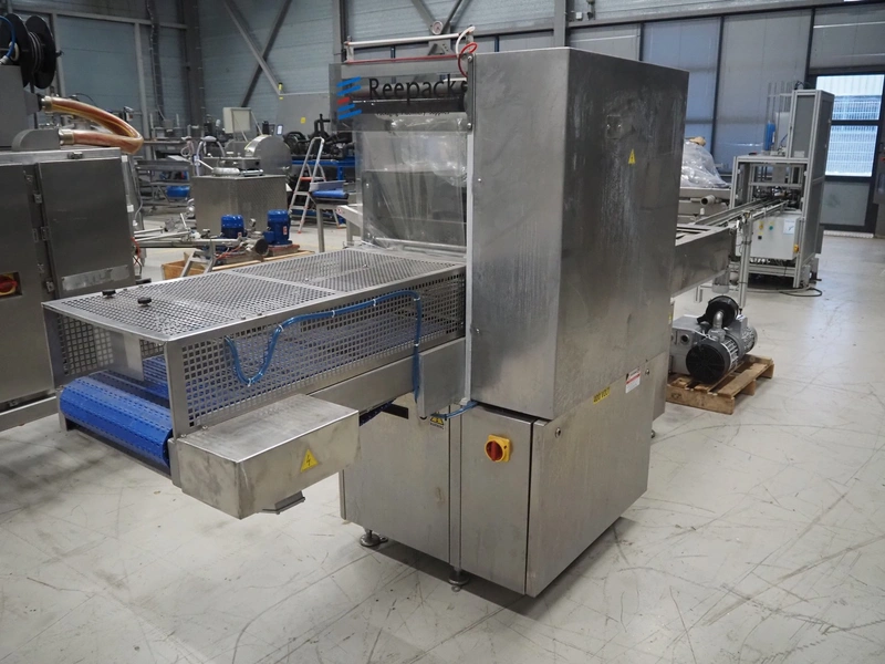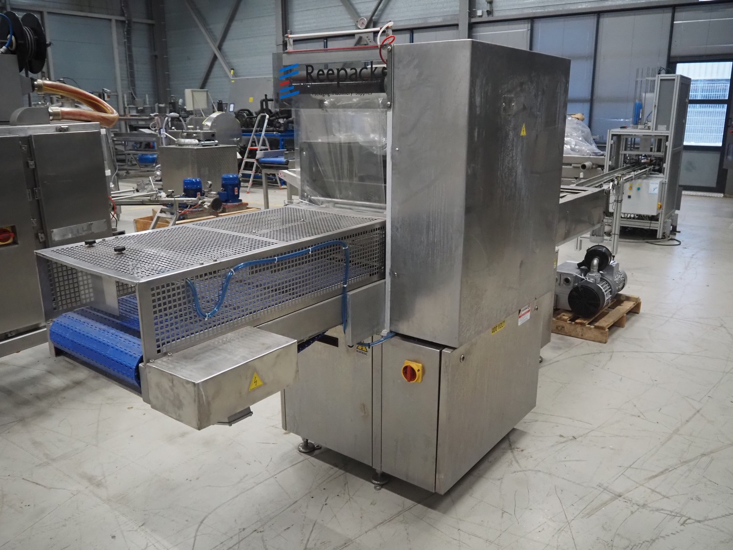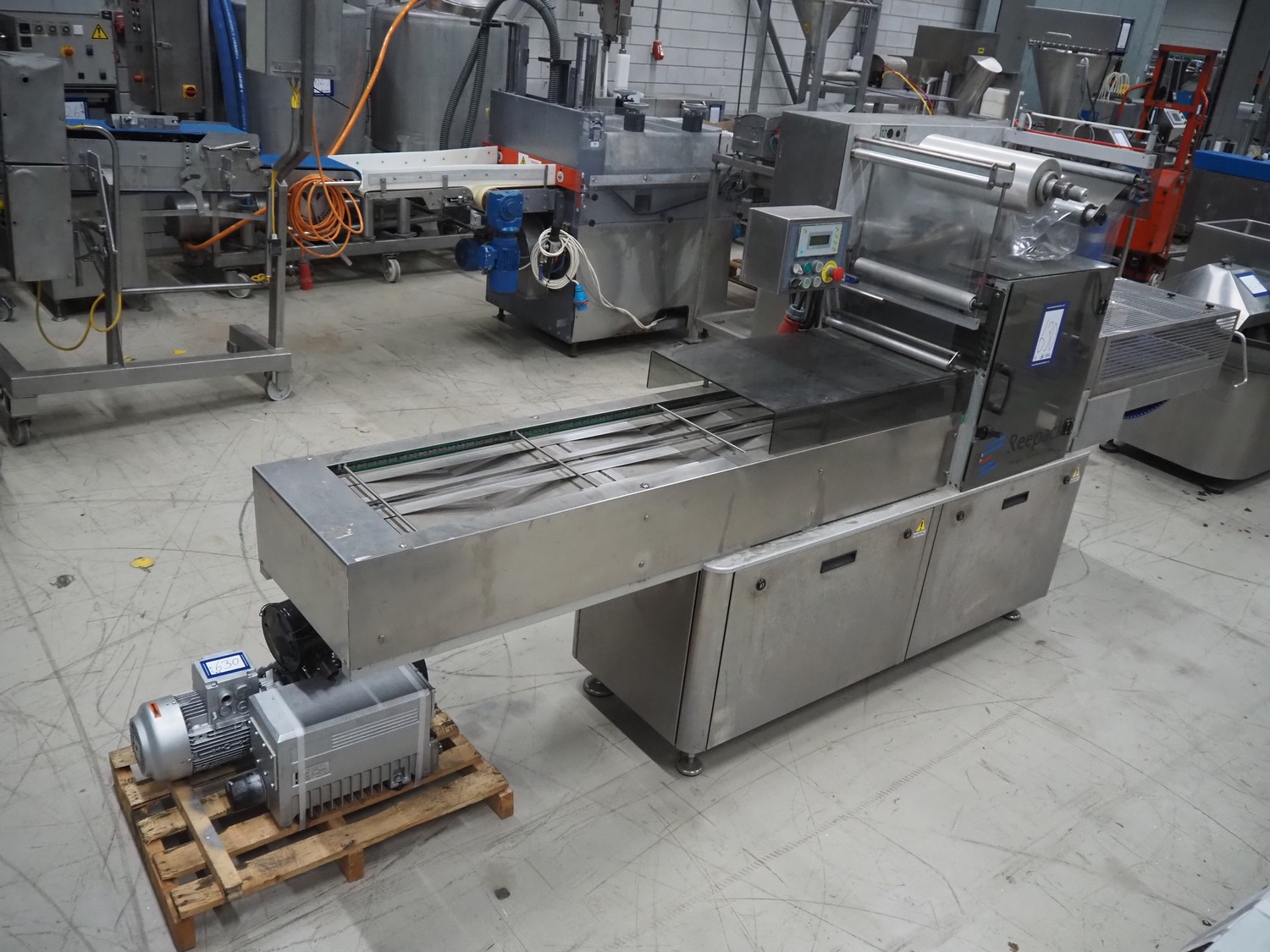 Reepack traysealer, model: Reeflex, serial number: 0402025, year of construction: 2002, 400 V, 3 Ph, 50 Hz, 21 A, s/s chain and pin conveyor, belt width: 360 mm, distance between dividers: 440 mm, divider height: 20 mm, 2 lanes, lane width: 140 mm, film width: 400 mm, dimensions dyes: (2x) 220 mm x 140 mm, plastic outfeed belt, belt width: 420 mm, total dimensions: 3550 mm x 900 mm x 1750 mm. With additional dye, dimensions dye: (2x) 220 mm x 140 mm, and Busch vacuum pump, type: RA 0100 E 503, number: 03018852.