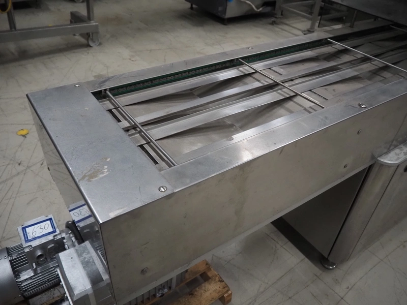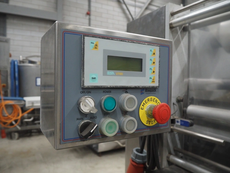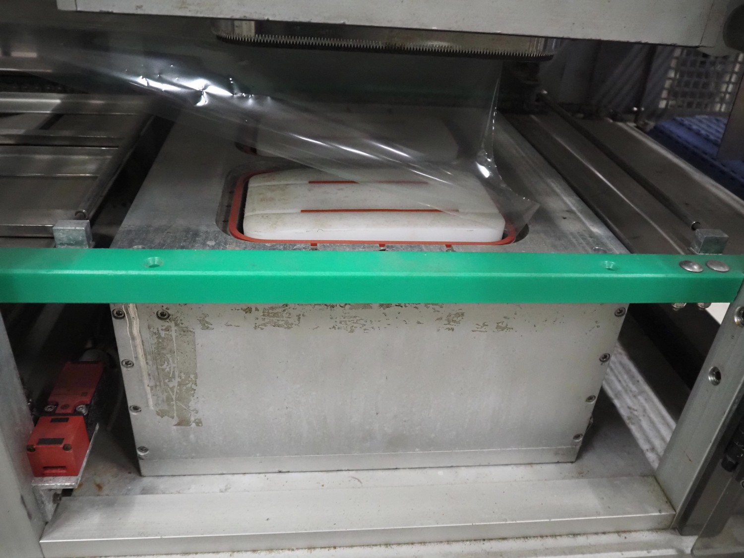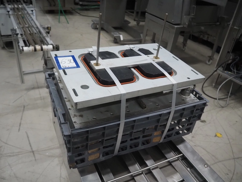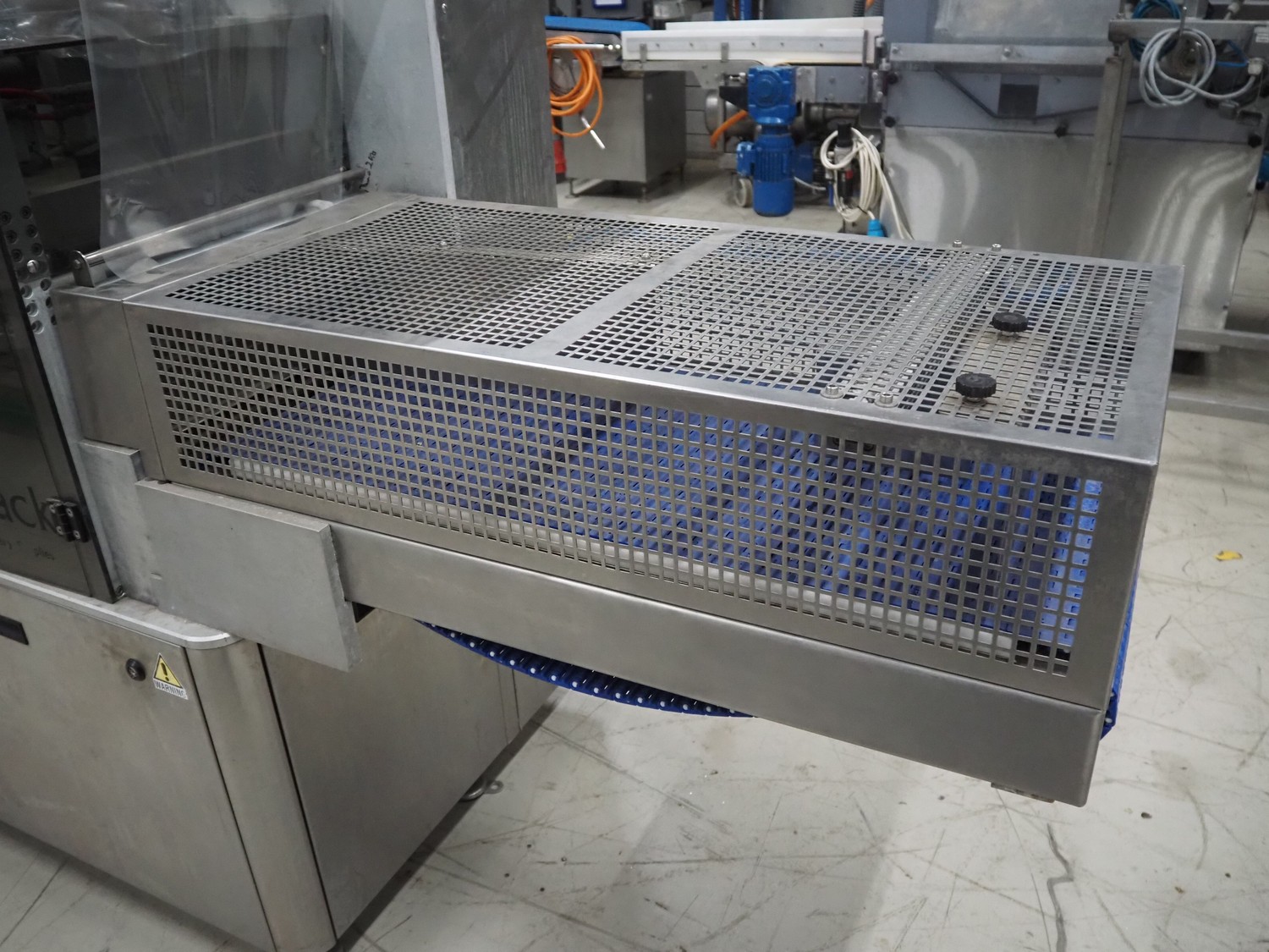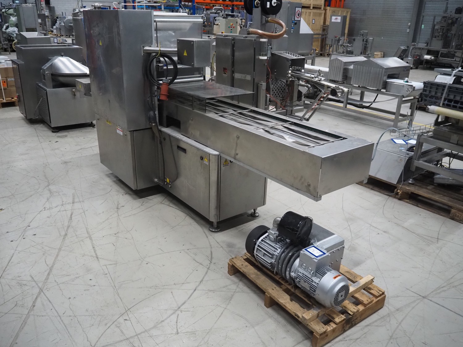 Reepack traysealer, model: Reeflex, serial number: 0402025, year of construction: 2002, 400 V, 3 Ph, 50 Hz, 21 A, s/s chain and pin conveyor, belt width: 360 mm, distance between dividers: 440 mm, divider height: 20 mm, 2 lanes, lane width: 140 mm, film width: 400 mm, dimensions dyes: (2x) 220 mm x 140 mm, plastic outfeed belt, belt width: 420 mm, total dimensions: 3550 mm x 900 mm x 1750 mm. With additional dye, dimensions dye: (2x) 220 mm x 140 mm, and Busch vacuum pump, type: RA 0100 E 503, number: 03018852.