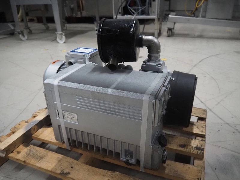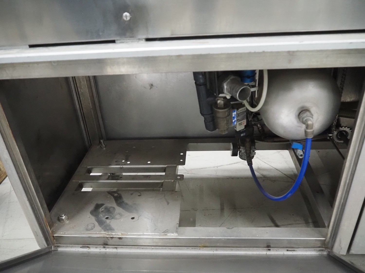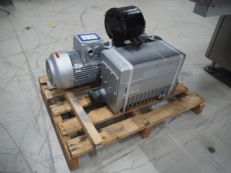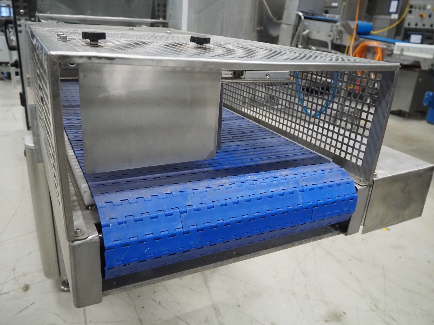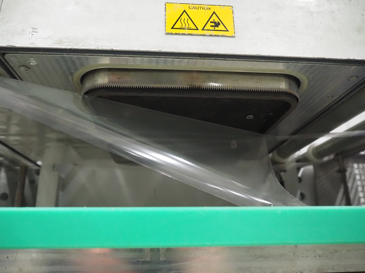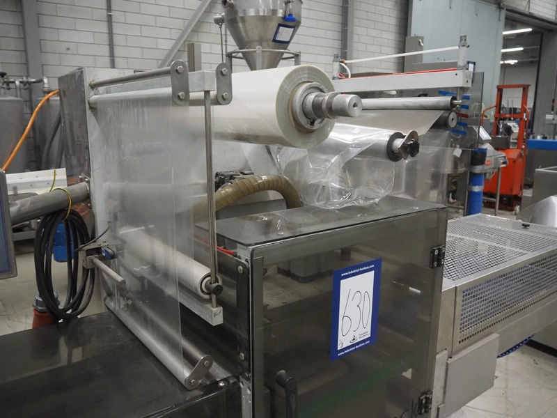 Reepack traysealer, model: Reeflex, serial number: 0402025, year of construction: 2002, 400 V, 3 Ph, 50 Hz, 21 A, s/s chain and pin conveyor, belt width: 360 mm, distance between dividers: 440 mm, divider height: 20 mm, 2 lanes, lane width: 140 mm, film width: 400 mm, dimensions dyes: (2x) 220 mm x 140 mm, plastic outfeed belt, belt width: 420 mm, total dimensions: 3550 mm x 900 mm x 1750 mm. With additional dye, dimensions dye: (2x) 220 mm x 140 mm, and Busch vacuum pump, type: RA 0100 E 503, number: 03018852.