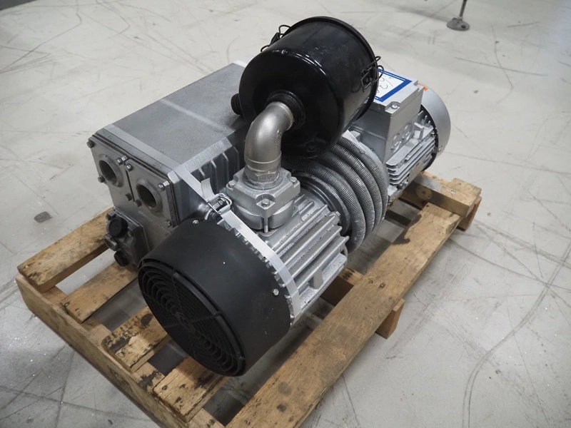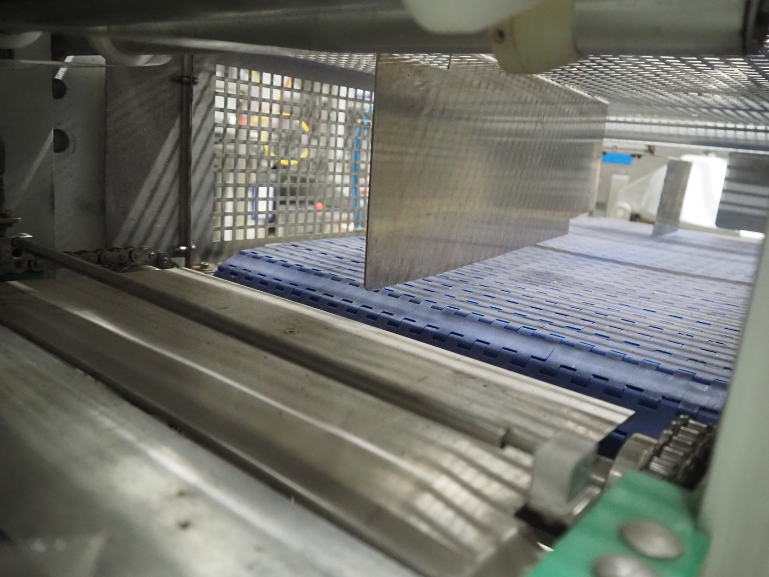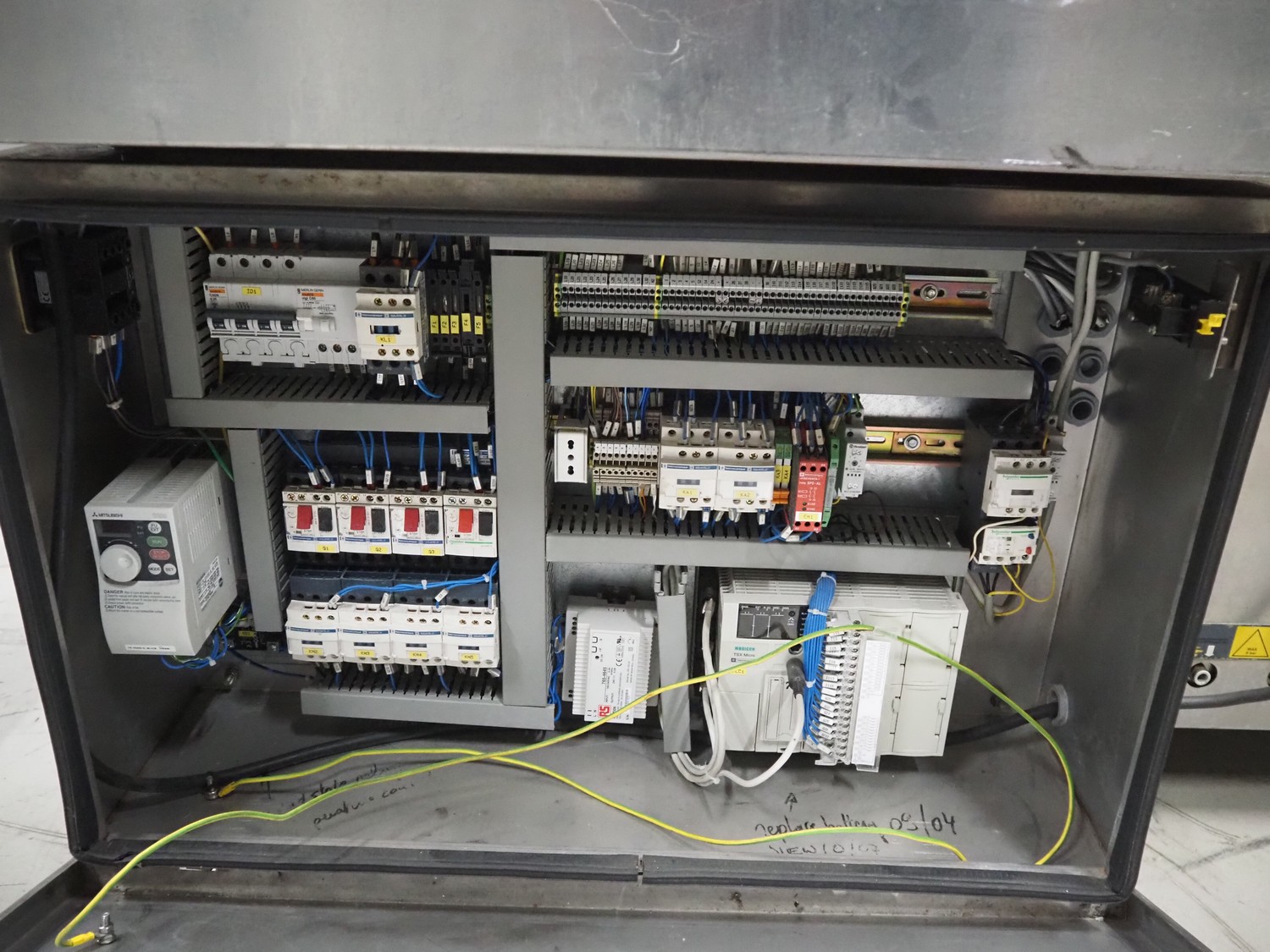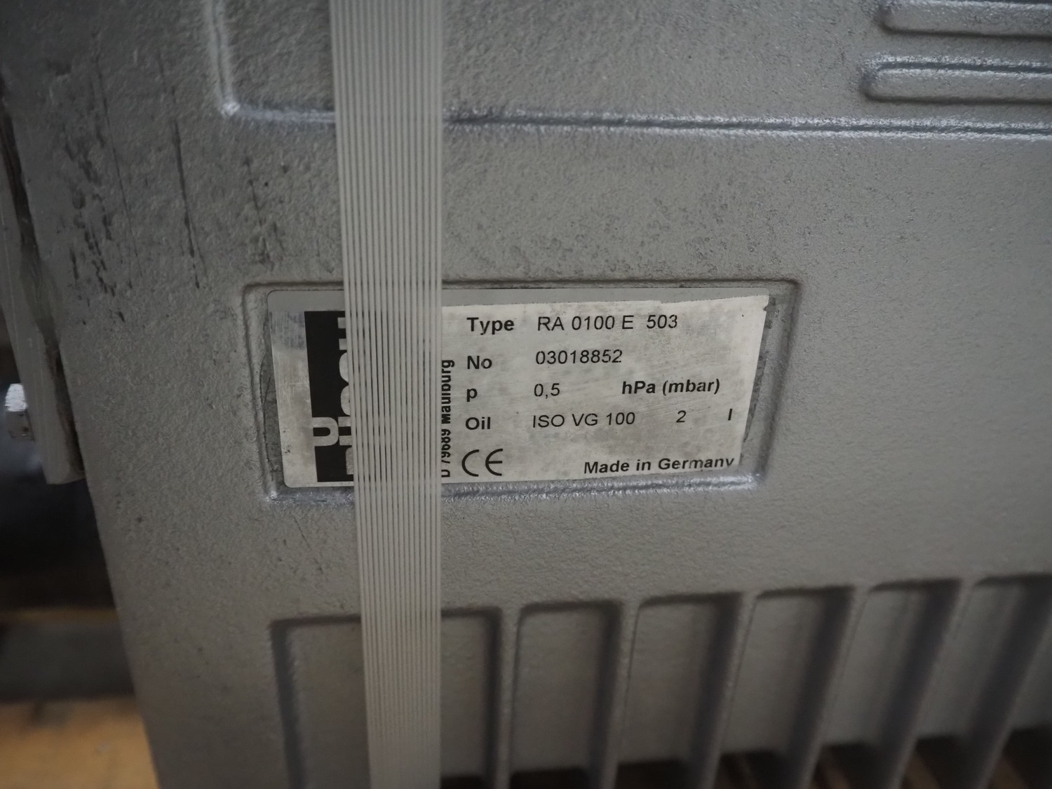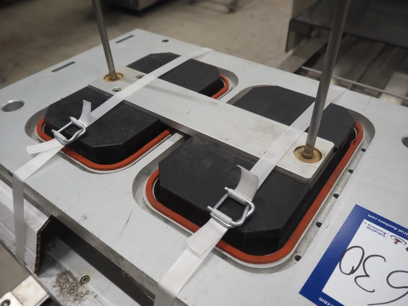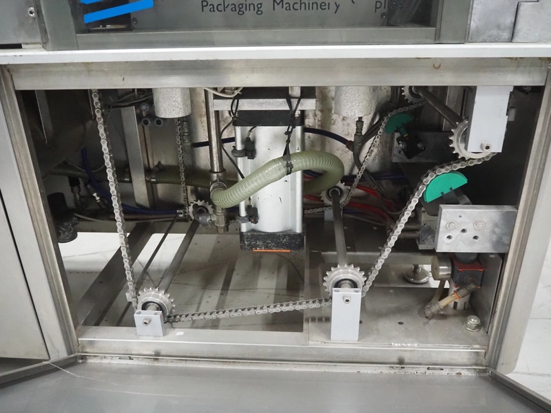 Reepack traysealer, model: Reeflex, serial number: 0402025, year of construction: 2002, 400 V, 3 Ph, 50 Hz, 21 A, s/s chain and pin conveyor, belt width: 360 mm, distance between dividers: 440 mm, divider height: 20 mm, 2 lanes, lane width: 140 mm, film width: 400 mm, dimensions dyes: (2x) 220 mm x 140 mm, plastic outfeed belt, belt width: 420 mm, total dimensions: 3550 mm x 900 mm x 1750 mm. With additional dye, dimensions dye: (2x) 220 mm x 140 mm, and Busch vacuum pump, type: RA 0100 E 503, number: 03018852.