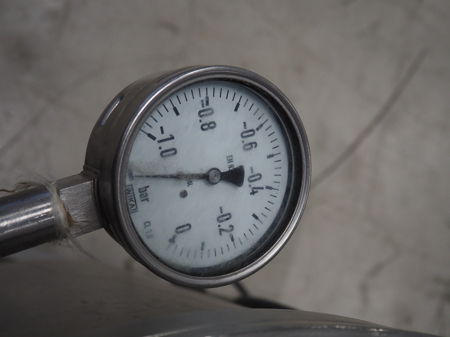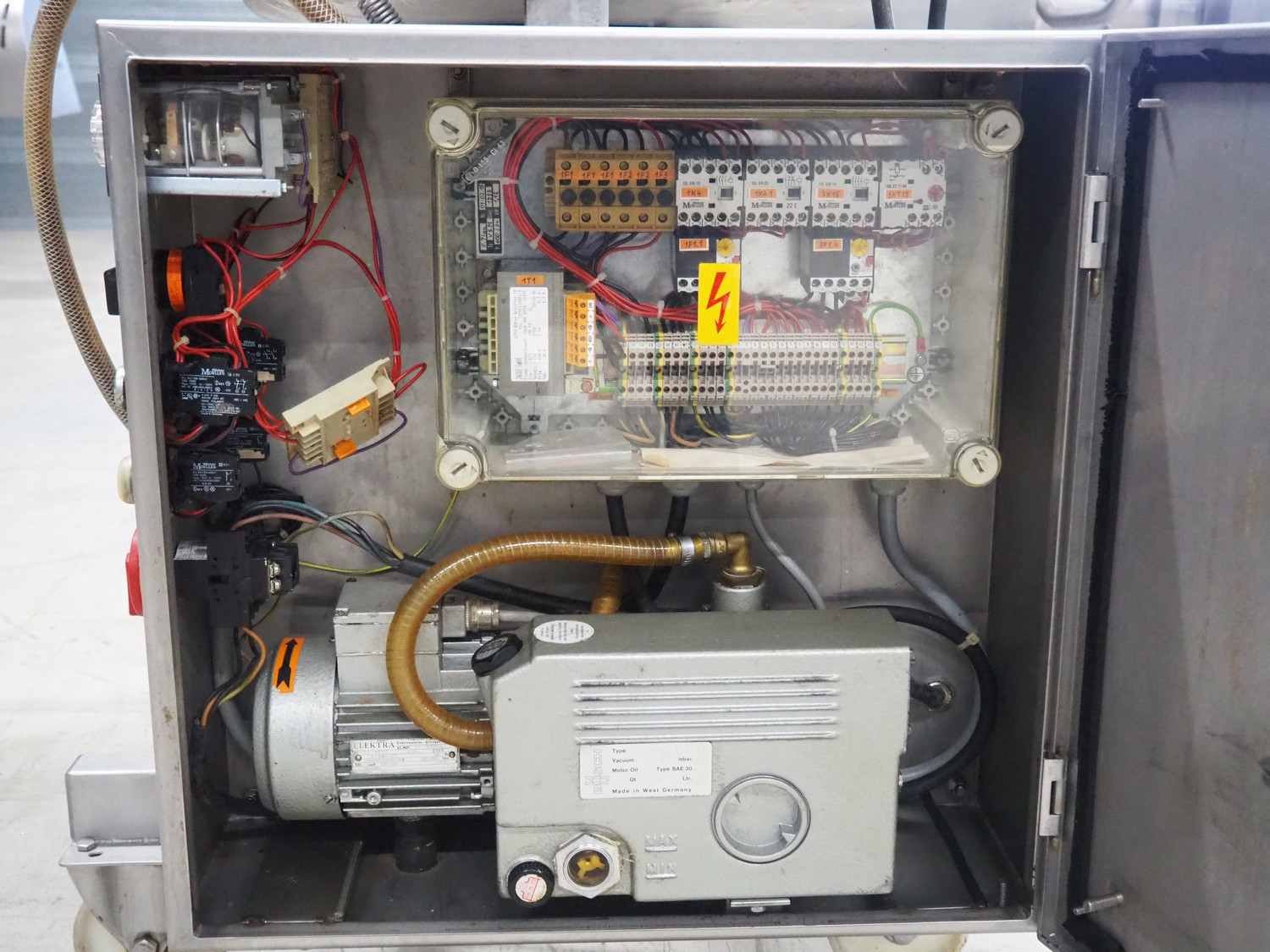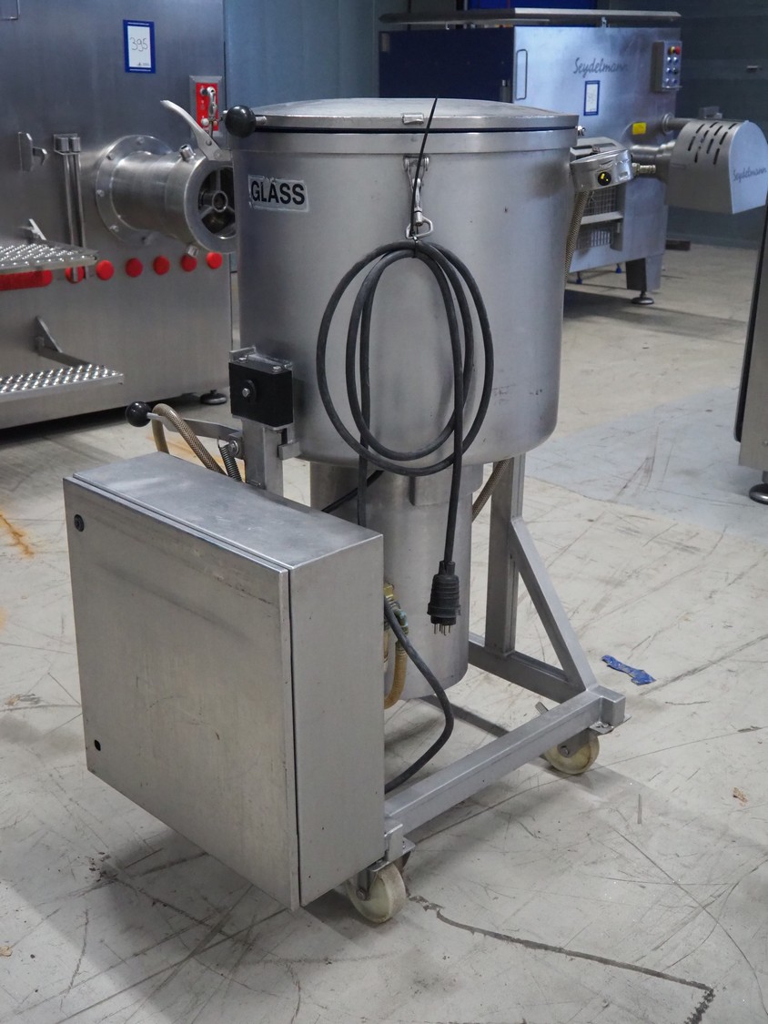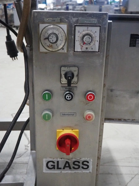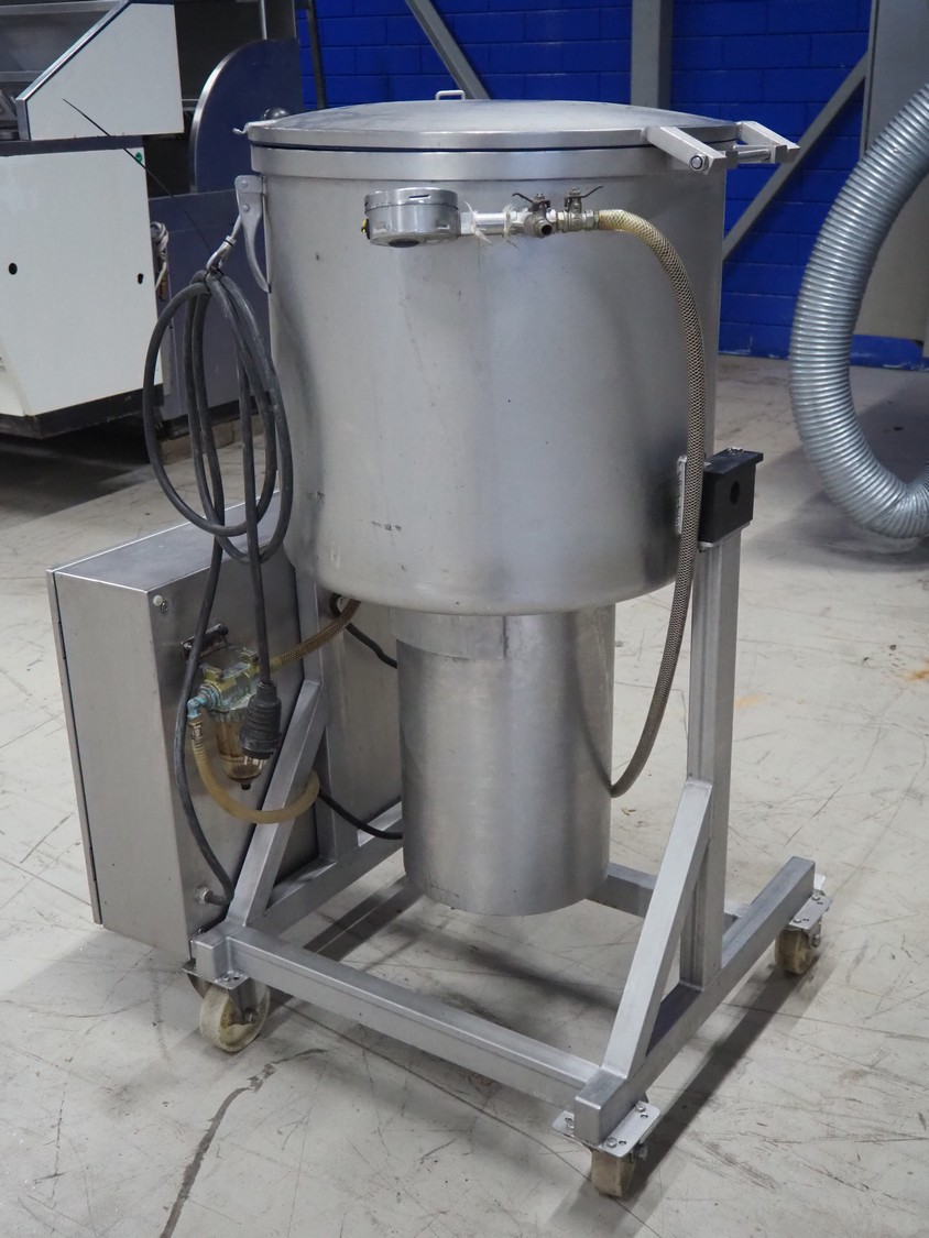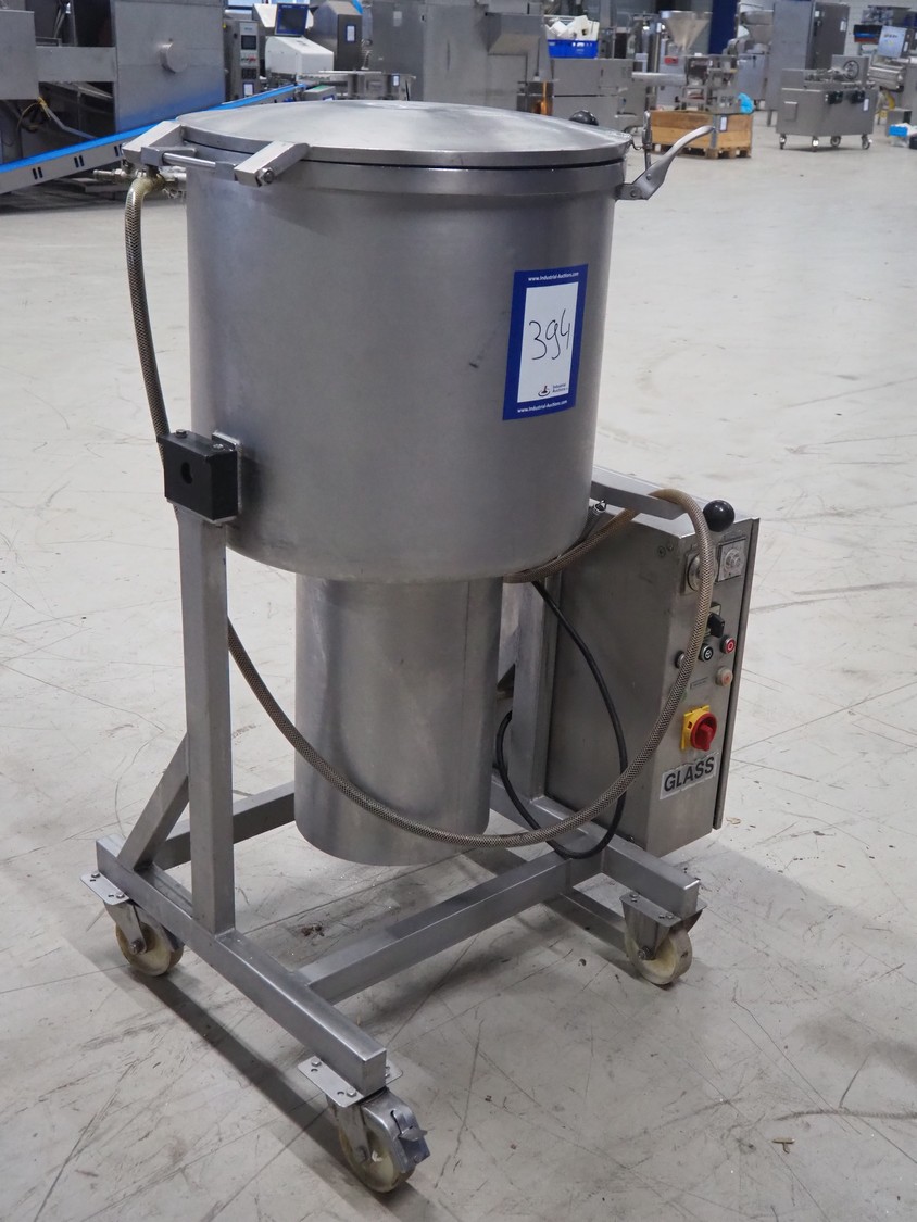 H.Glass mobile vacuum tumbler, type: VSM 150, machine number: 2065, year of construction: 1999, 220/380 V, 1 Ph, 50 Hz, 1.12 kW, volume: 150 liter, Busch vacuum pump, type: 016-116, number: 343191, capacity: 16 m³ per hour, total dimensions: 950 mm x 750 mm x 1400 mm.