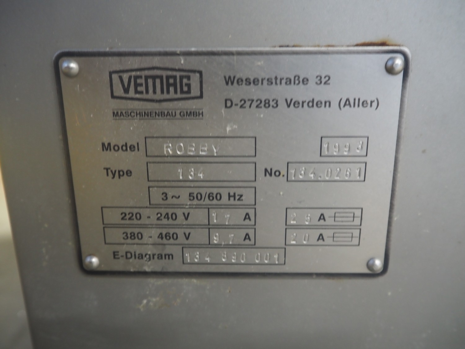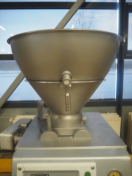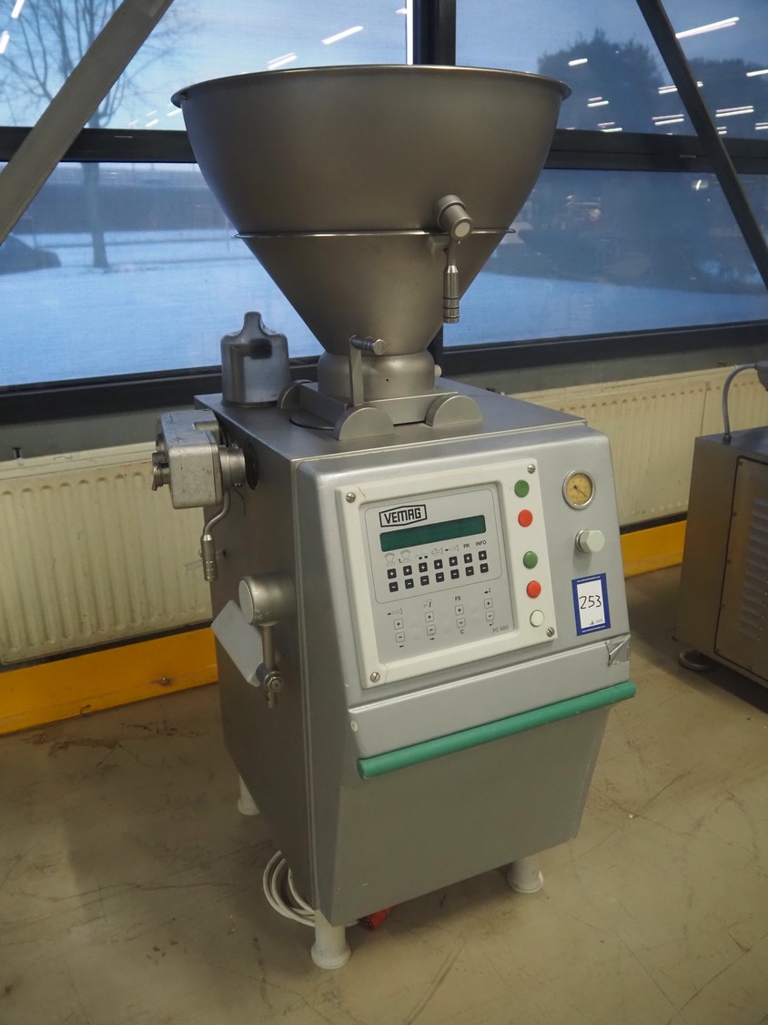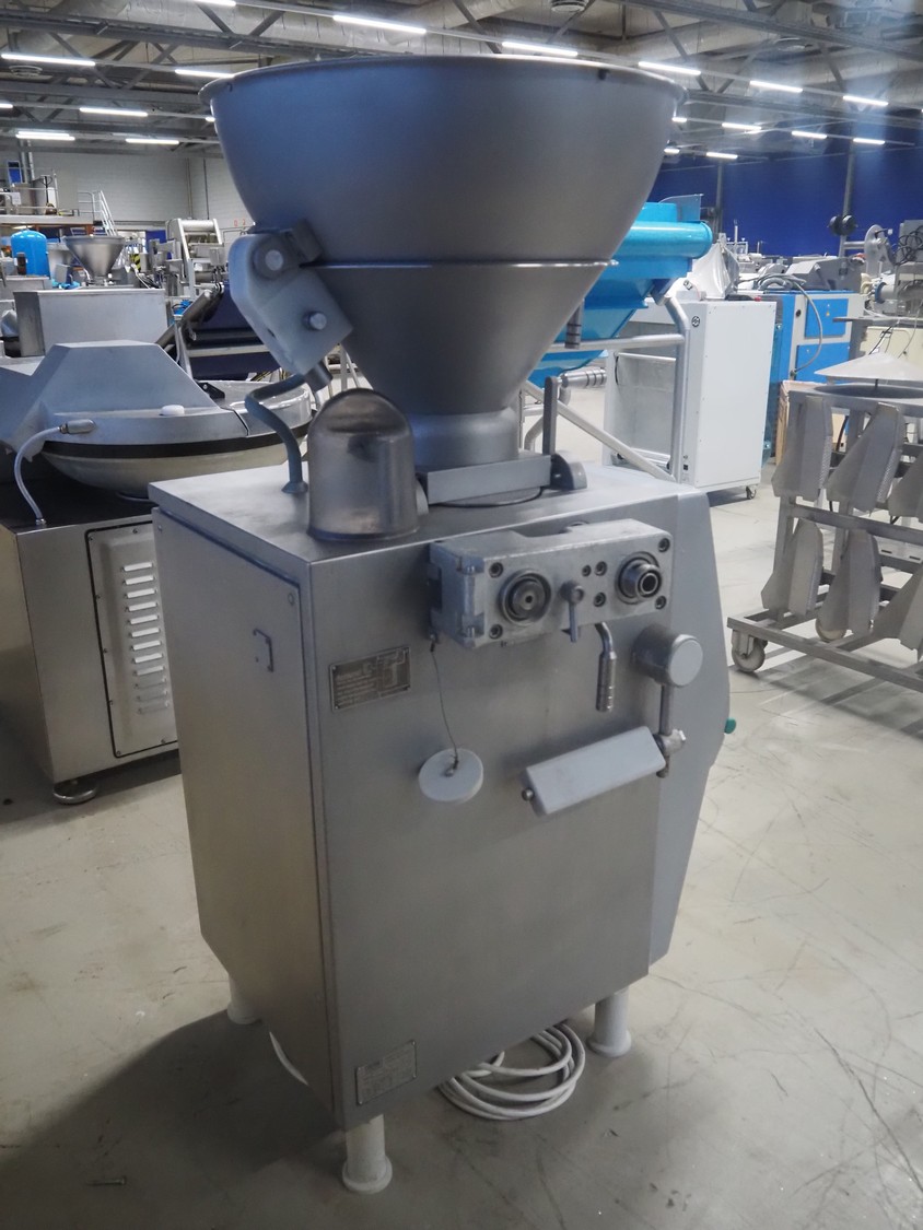 Vemag vacuum filling machine, model: Robby, type: 134, number: 134.0261, year of construction: 1993, 220-240/380-460 V, 3 Ph, 50/60 Hz, 25/20 A, dimensions: 950 mm x 900 mm x 1700 mm.