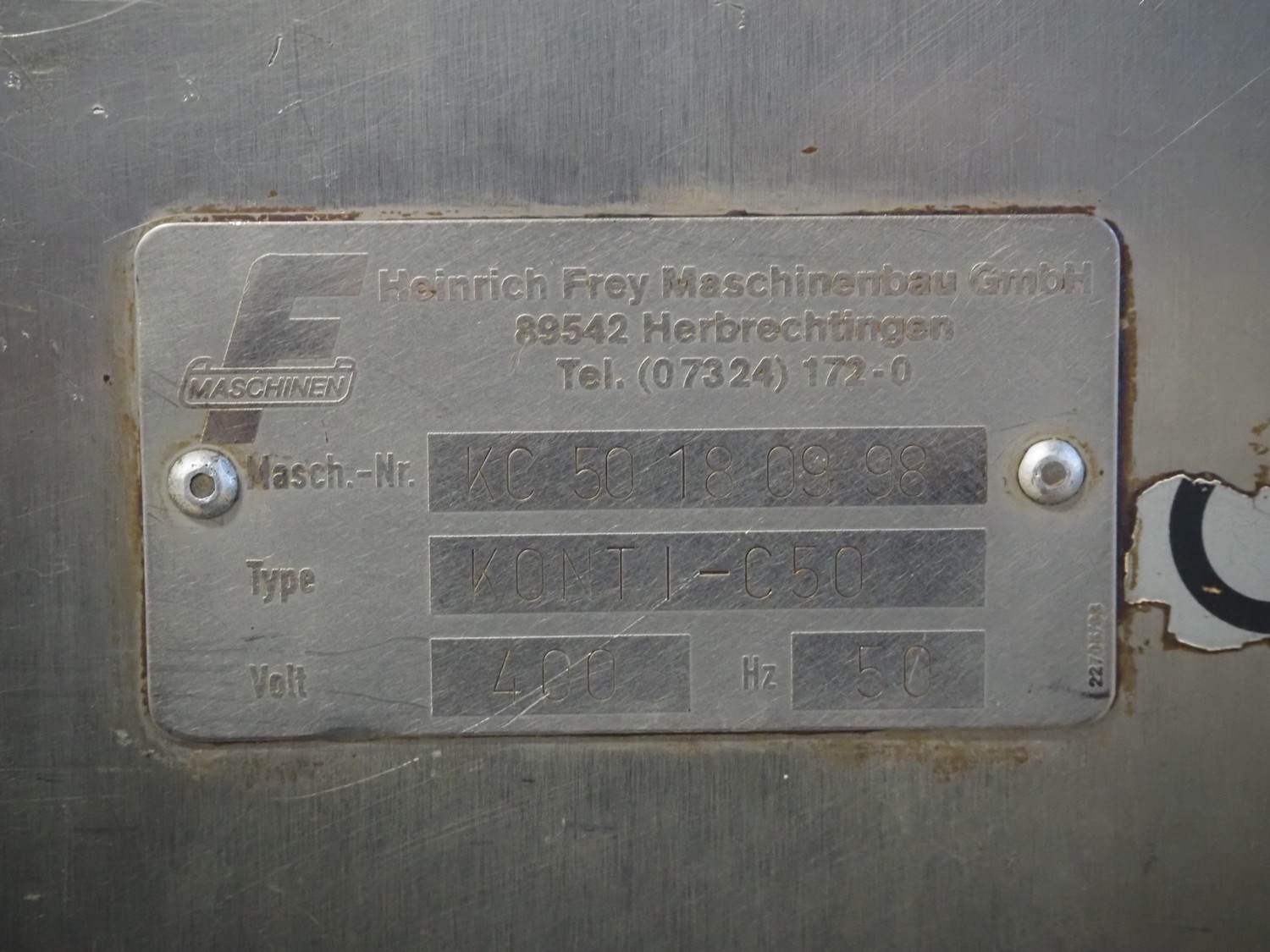 Frey vacuum filling machine, type: KONTI-C50, machine number: KC 50 18 09 98, 400 V, 50 Hz, dimensions: 900 mm x 650 mm x 1610 mm.