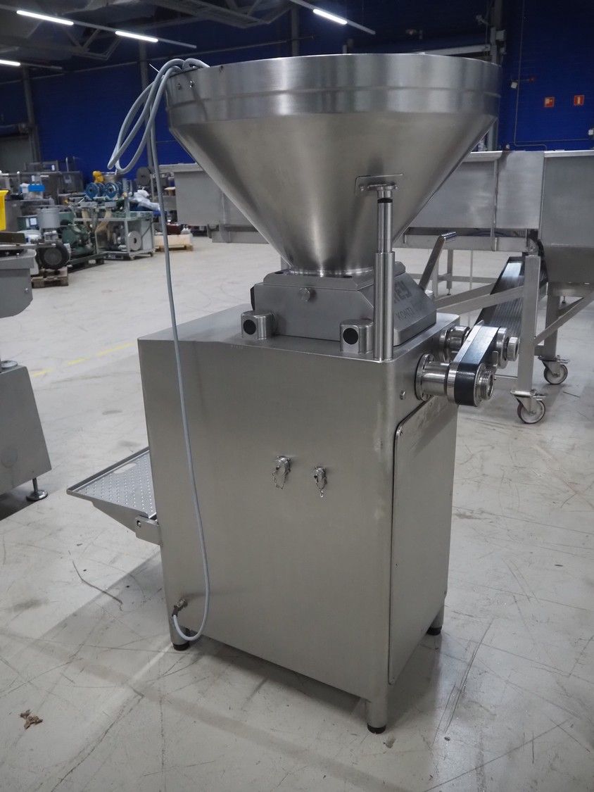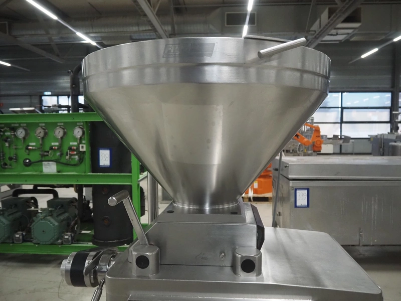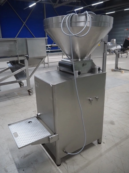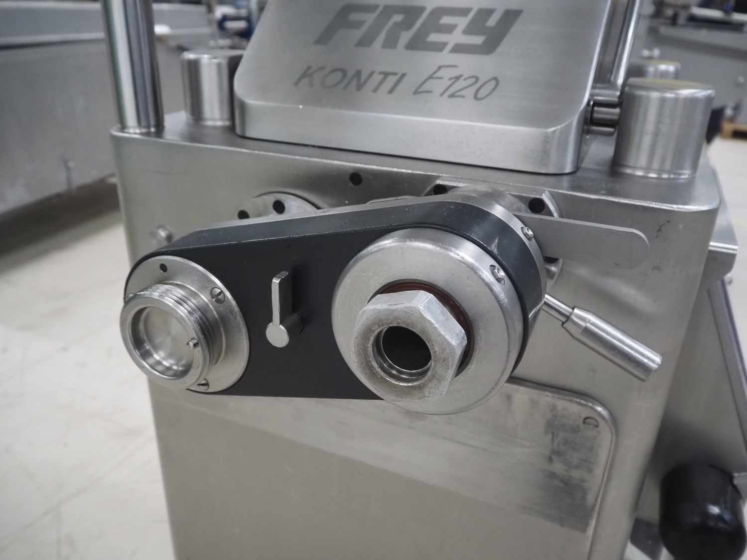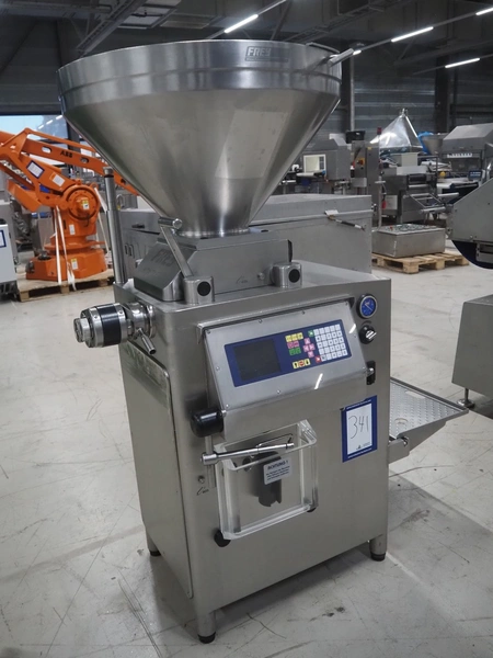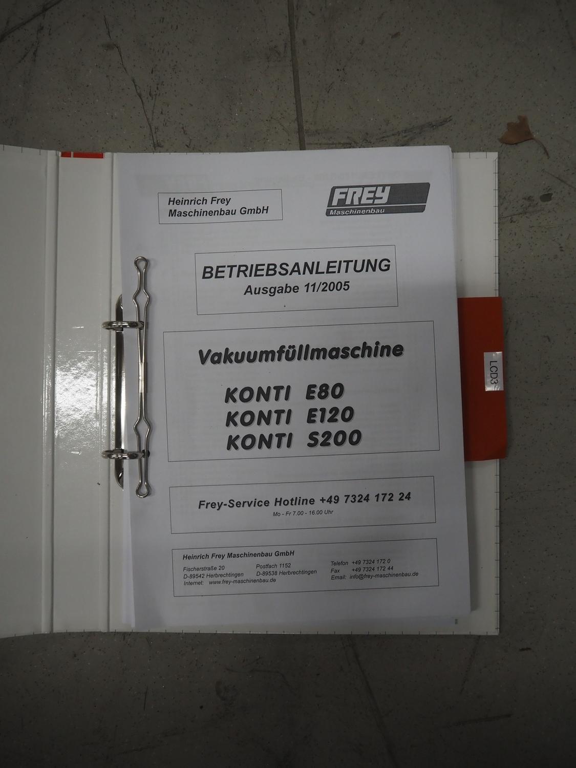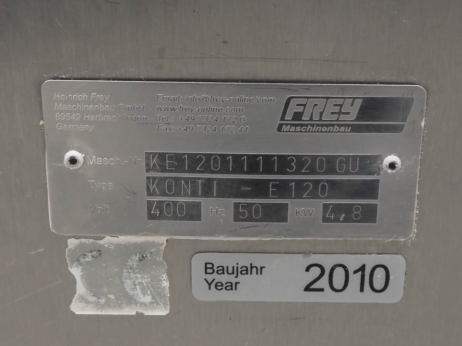 Frey vacuum filling machine with linking attachment, type: Konti-E120, machine number: KE1201111320GU, year of construction: 2010, 400 V, 50 Hz, 4.8 kW, Busch vacuum pump, operating hours: 28406, dimensions: 950 mm x 700 mm x 1620 mm.