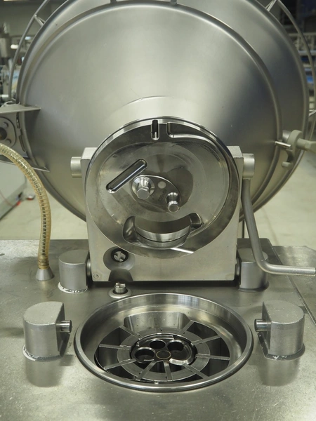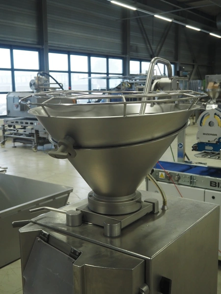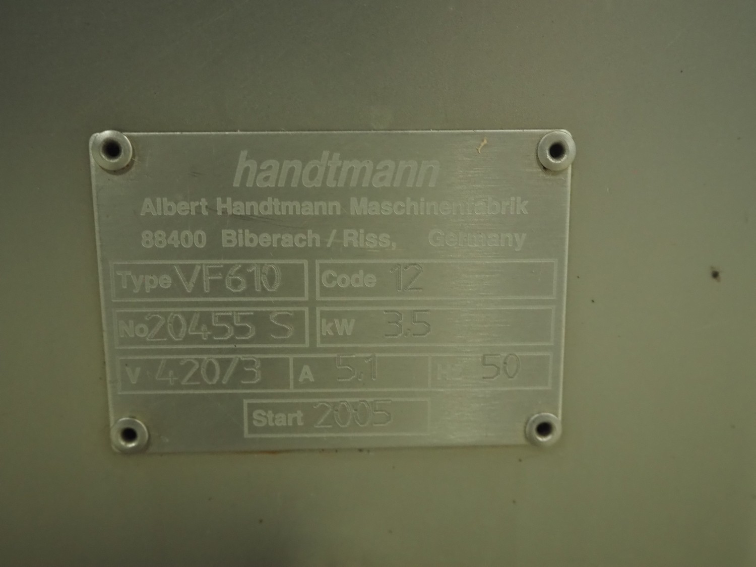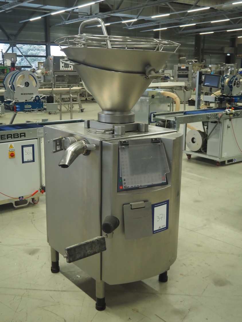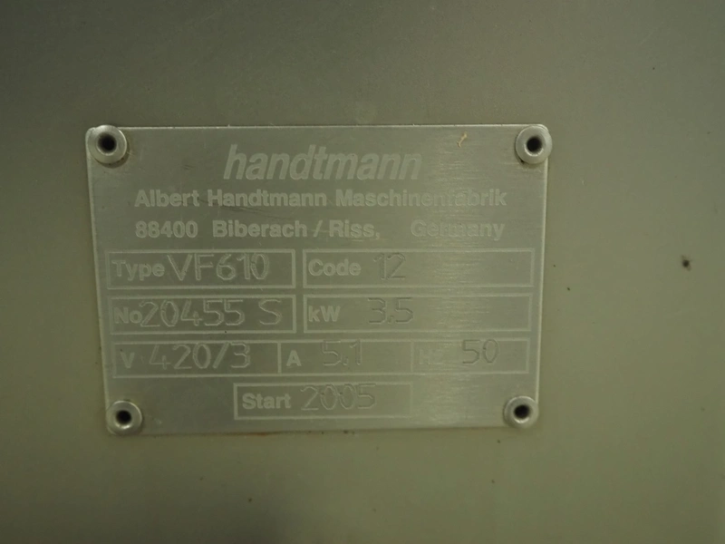 Handtmann vacuum filling machine, type: VF610, number: 20455S, year of construction: 2005, 420 V, 3 Ph, 50 Hz, 5.1 A, 3.5 kW, dimensions: 800 mm x 850 mm x 1750 mm. Missing vacuum pump.