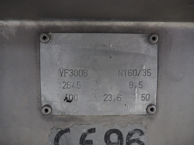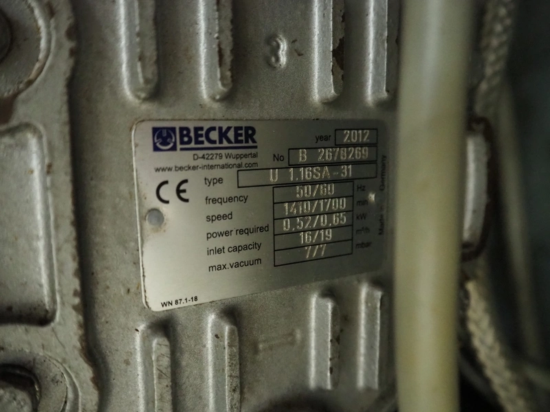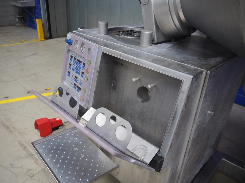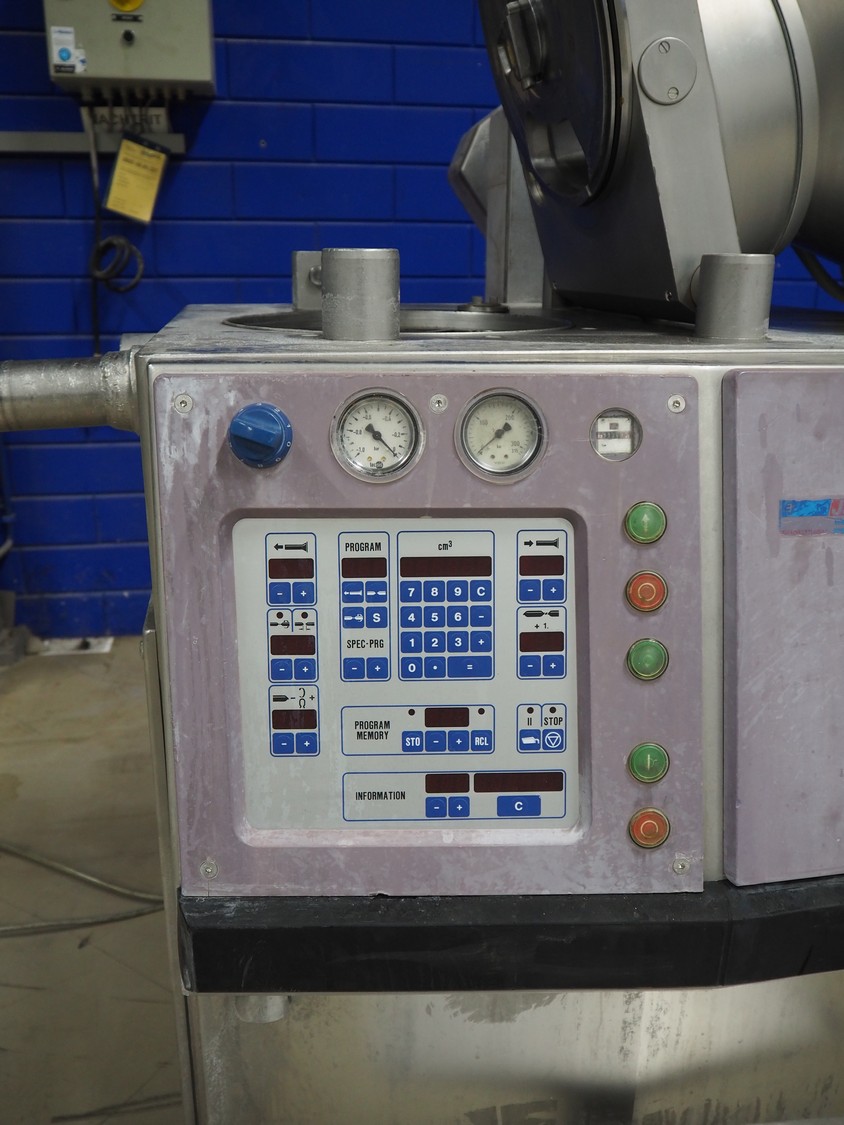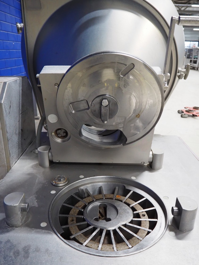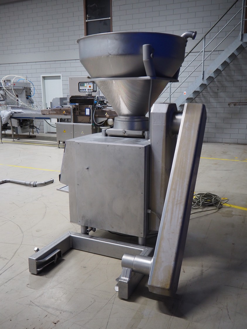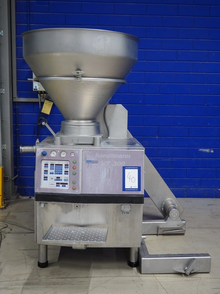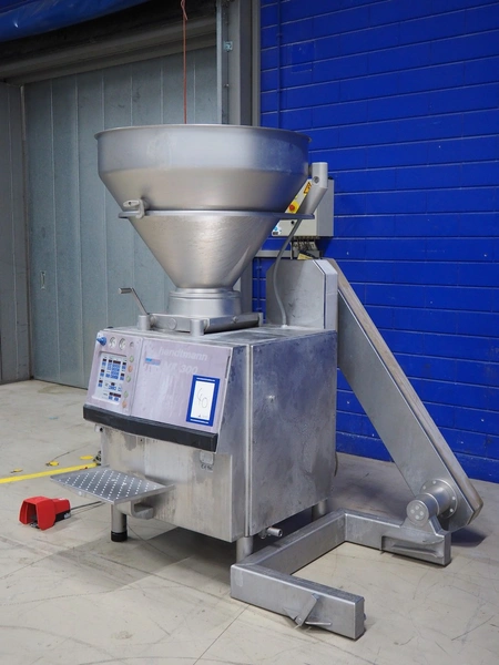 Handtmann vacuum filling machine with lifter for meat bins, type: VF300B, number: 2645, 400 V, 50 Hz, 23.6 A, 9.5 kW, Becker vacuum pump, type: U 1.16SA-31, number: B 2678255, year of construction: 2012, capacity: 16 m³ per hour, dimensions: 1700 mm x 1400 mm x 1970 mm.