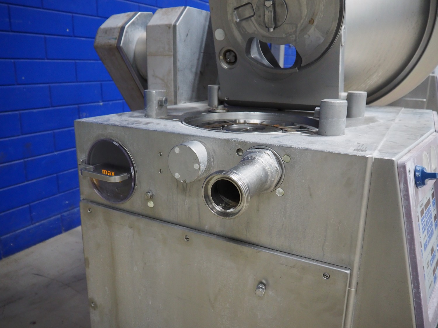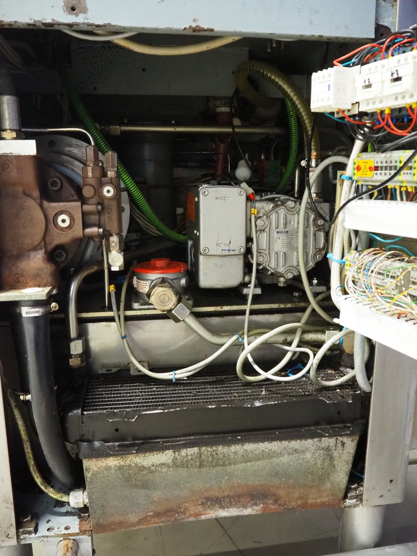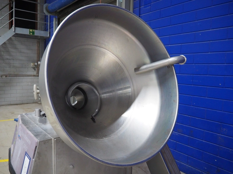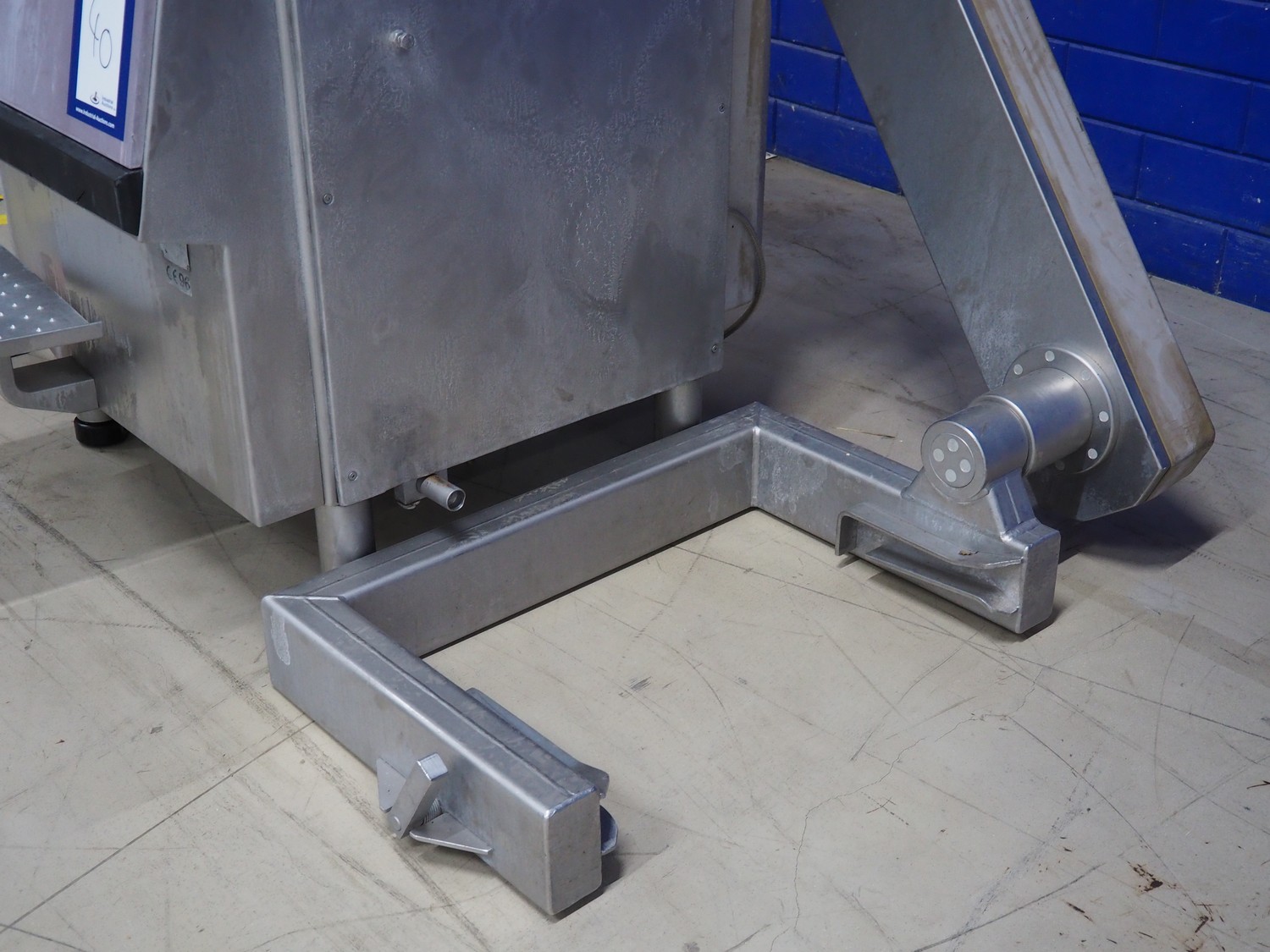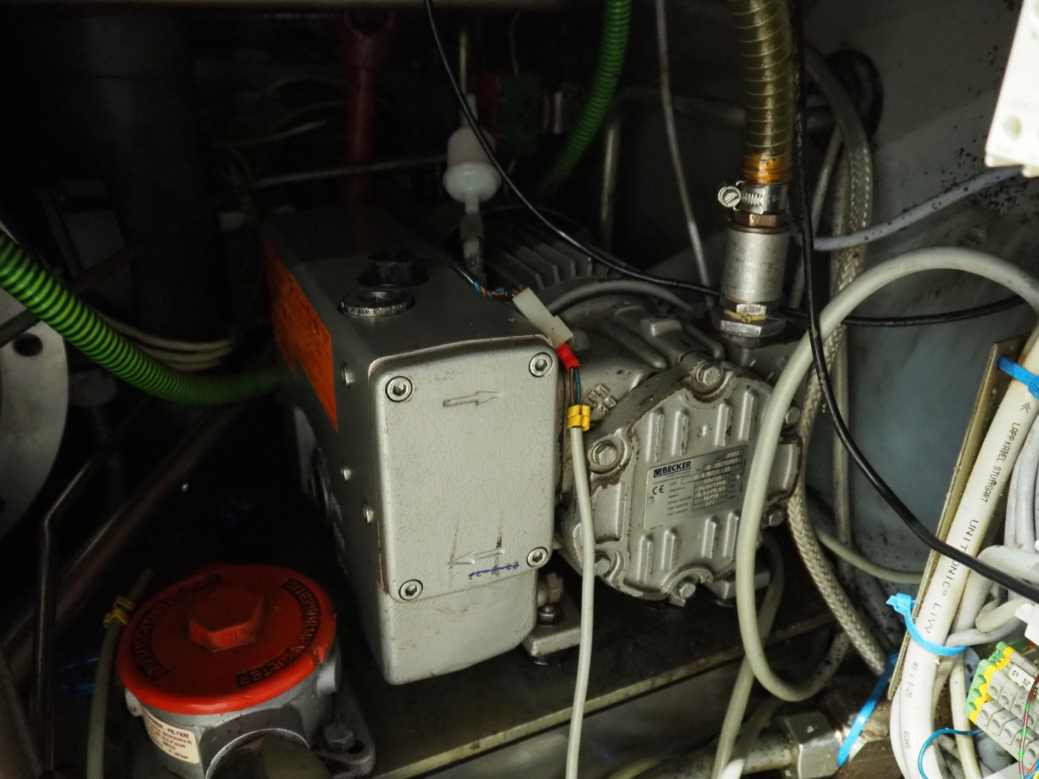Handtmann vacuum filling machine with lifter for meat bins, type: VF300B, number: 2645, 400 V, 50 Hz, 23.6 A, 9.5 kW, Becker vacuum pump, type: U 1.16SA-31, number: B 2678255, year of construction: 2012, capacity: 16 m³ per hour, dimensions: 1700 mm x 1400 mm x 1970 mm.
