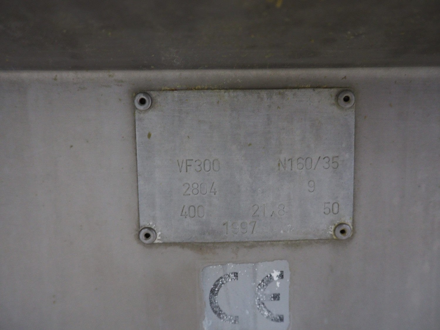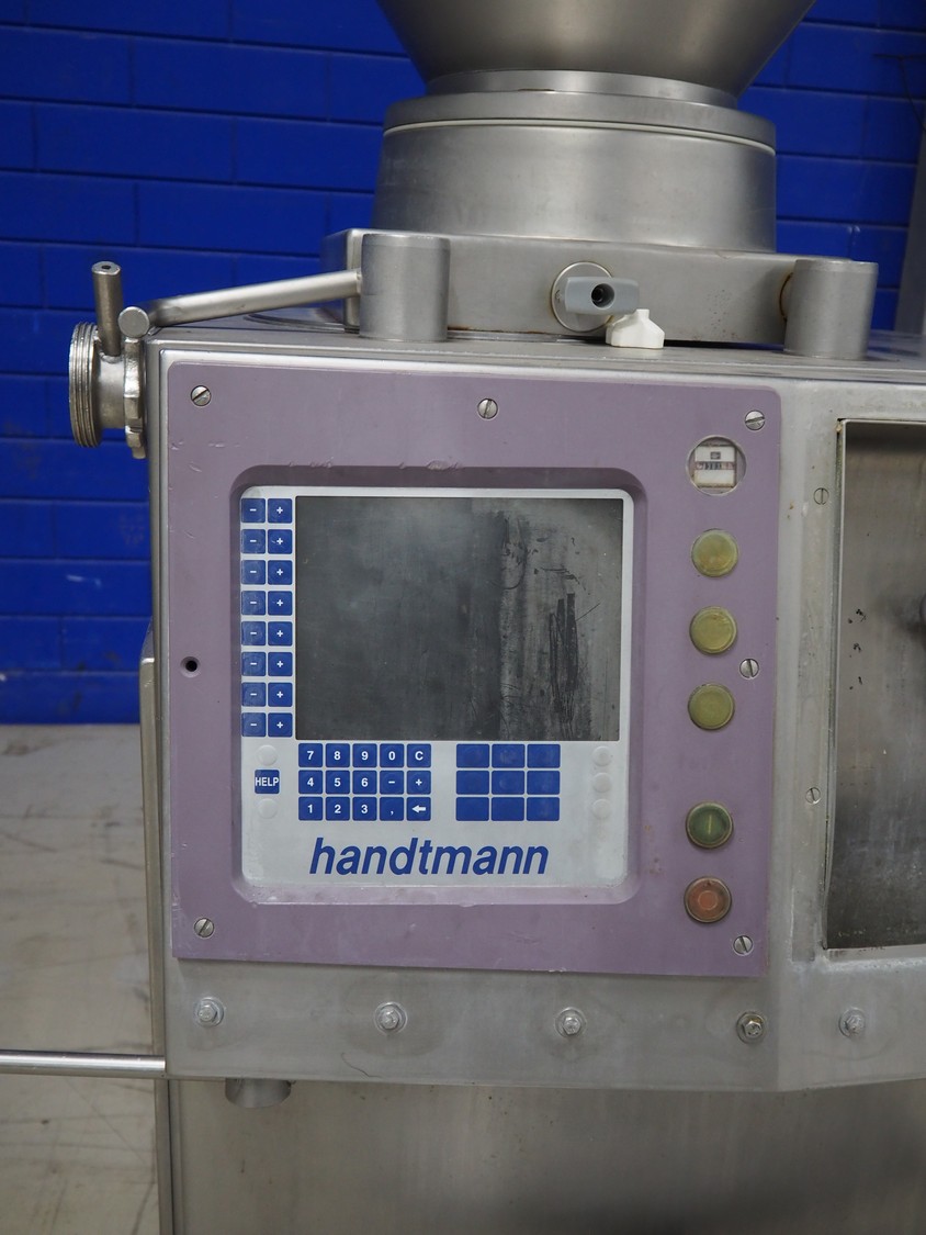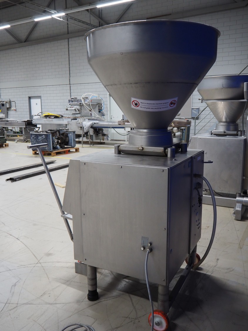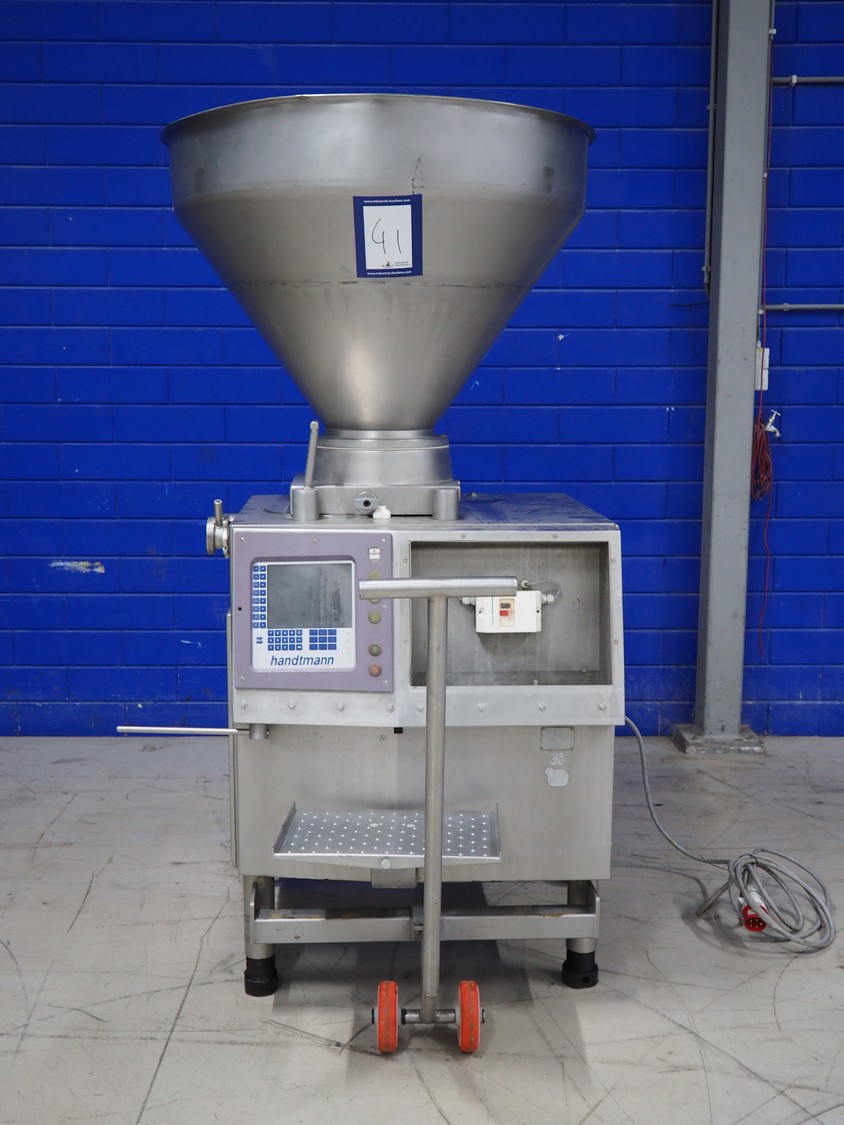 Handtmann mobile vacuum filling machine, type: VF300, number: 2804, year of construction: 1997, 400 V, 50 Hz, 21.8 A, 9 kW, dimensions: 1150 mm x 950 mm x 2050 mm. Incomplete.