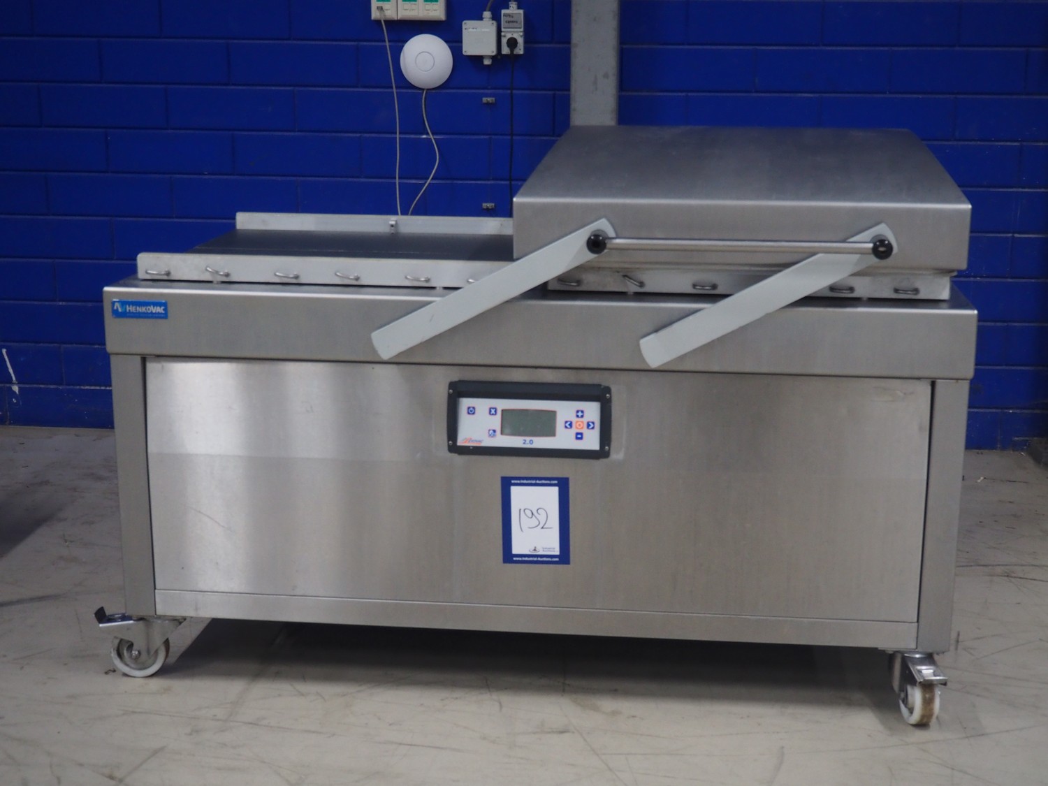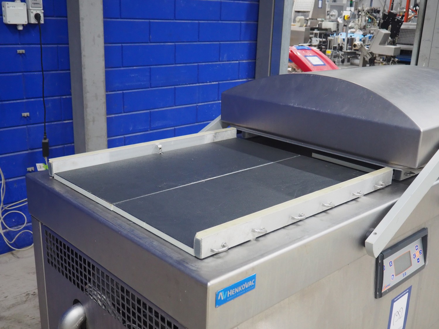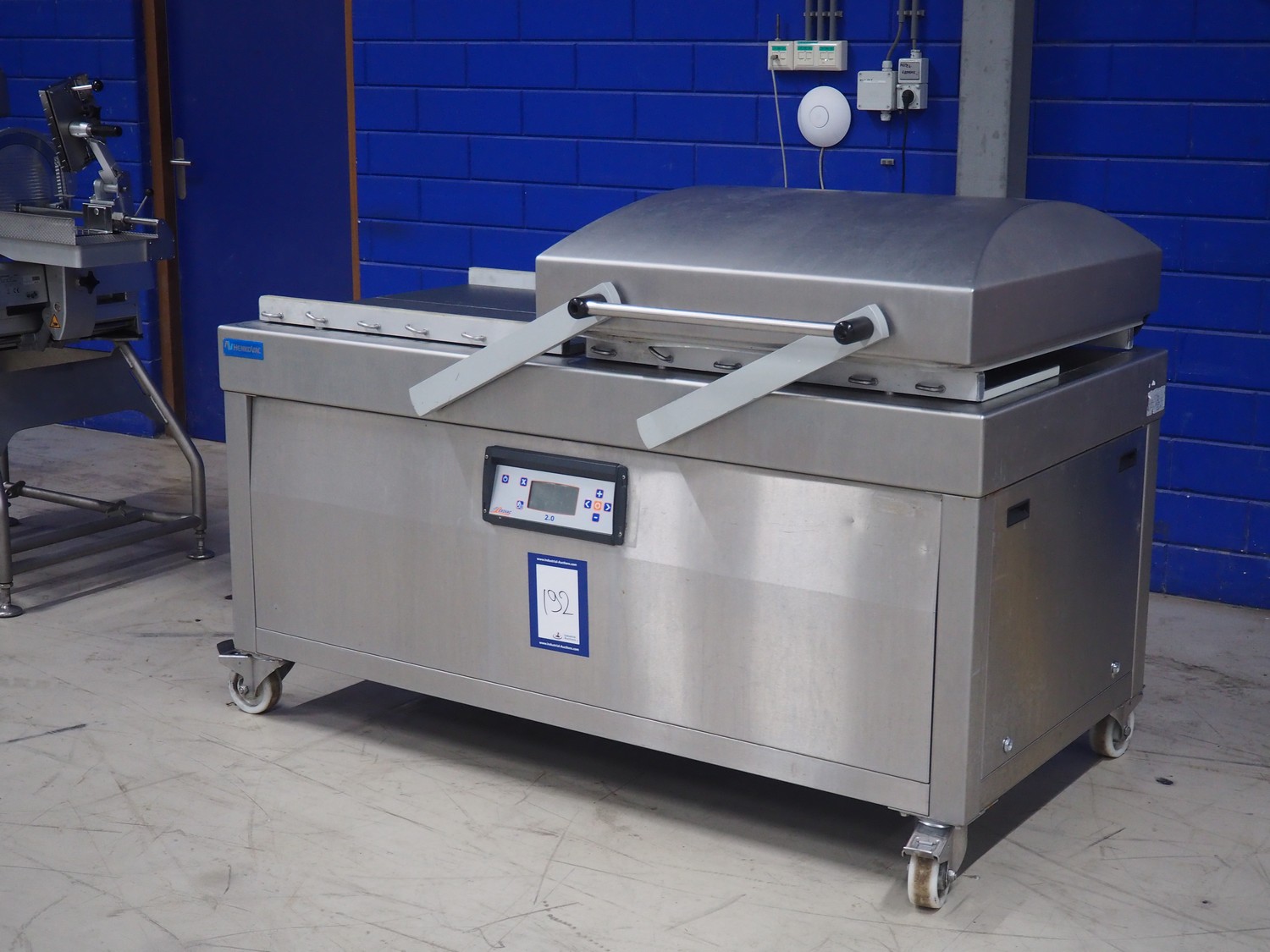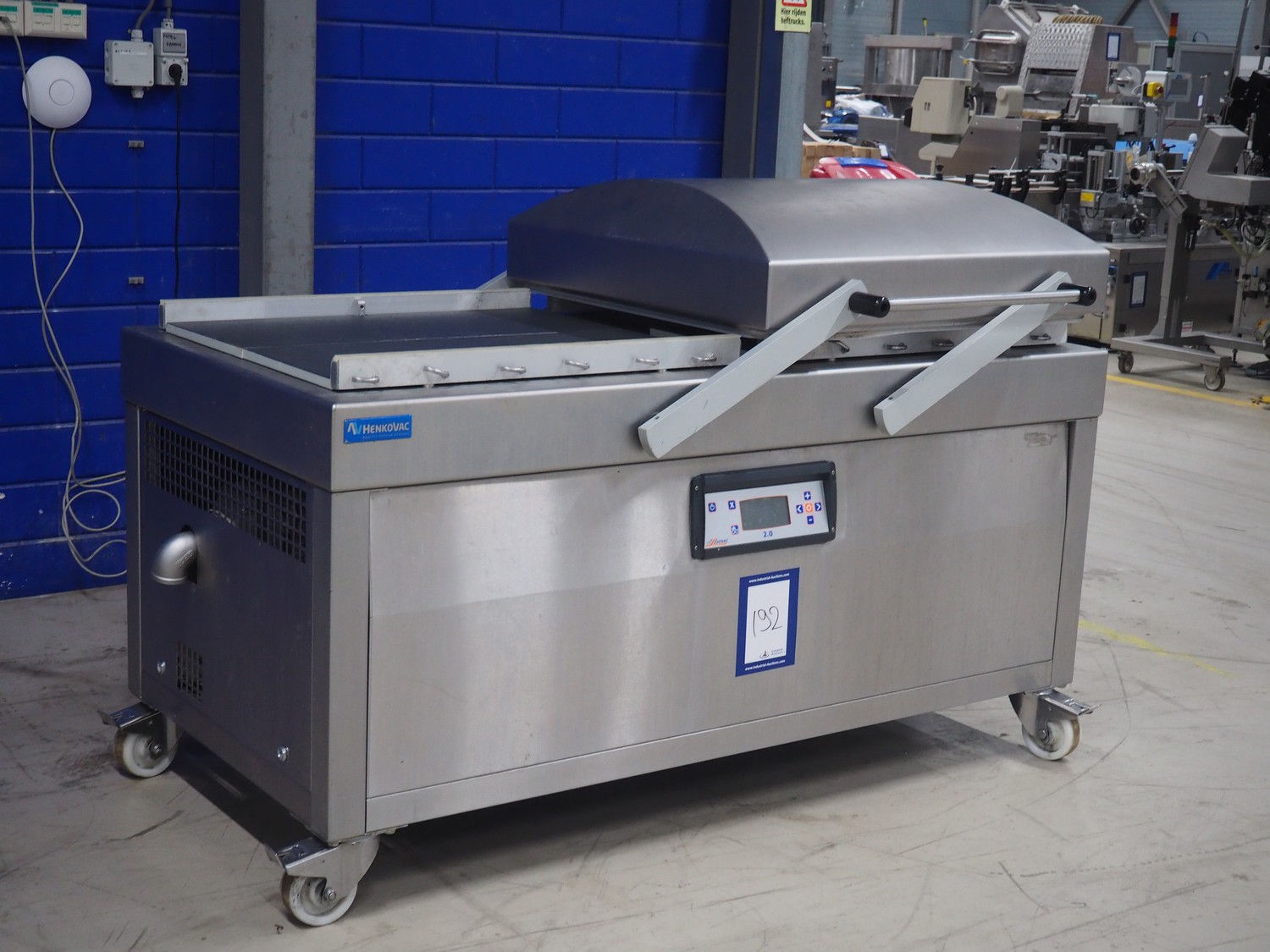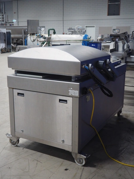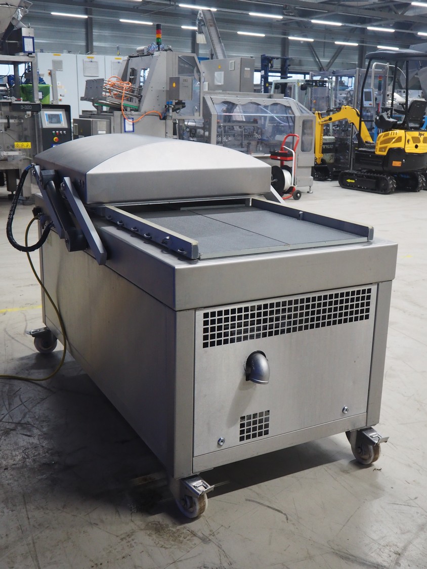 Henkovac mobile double chamber vacuum machine, year of construction: 2013, 380-400 V, 3 Ph, 50 Hz, seal length: (4x) 820 mm, dimensions chamber: 900 mm x 850 mm, total dimensions: 1800 mm x 1200 mm x 1400 mm.