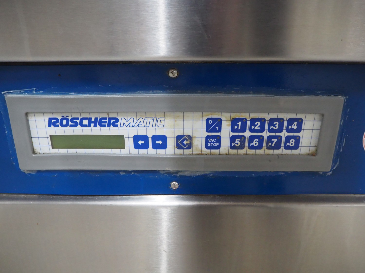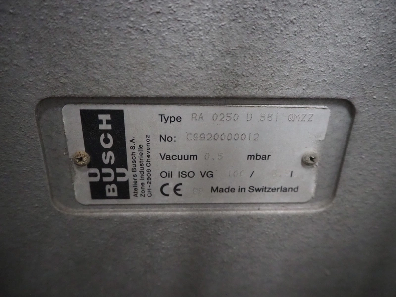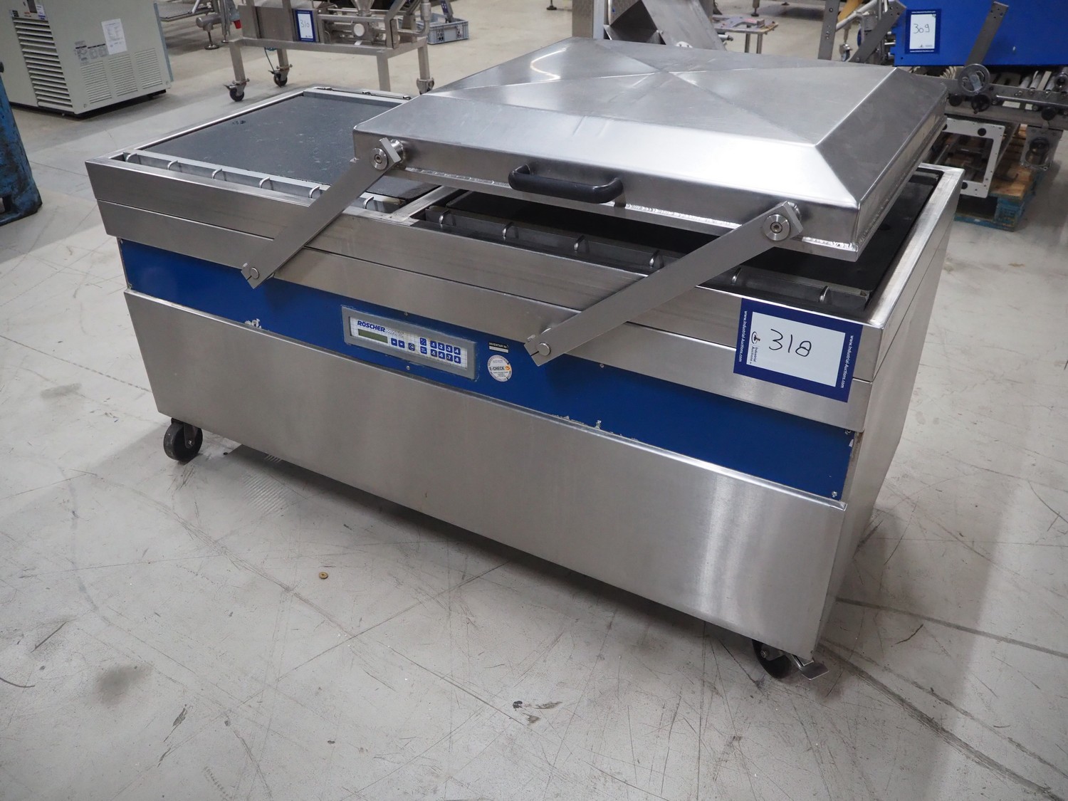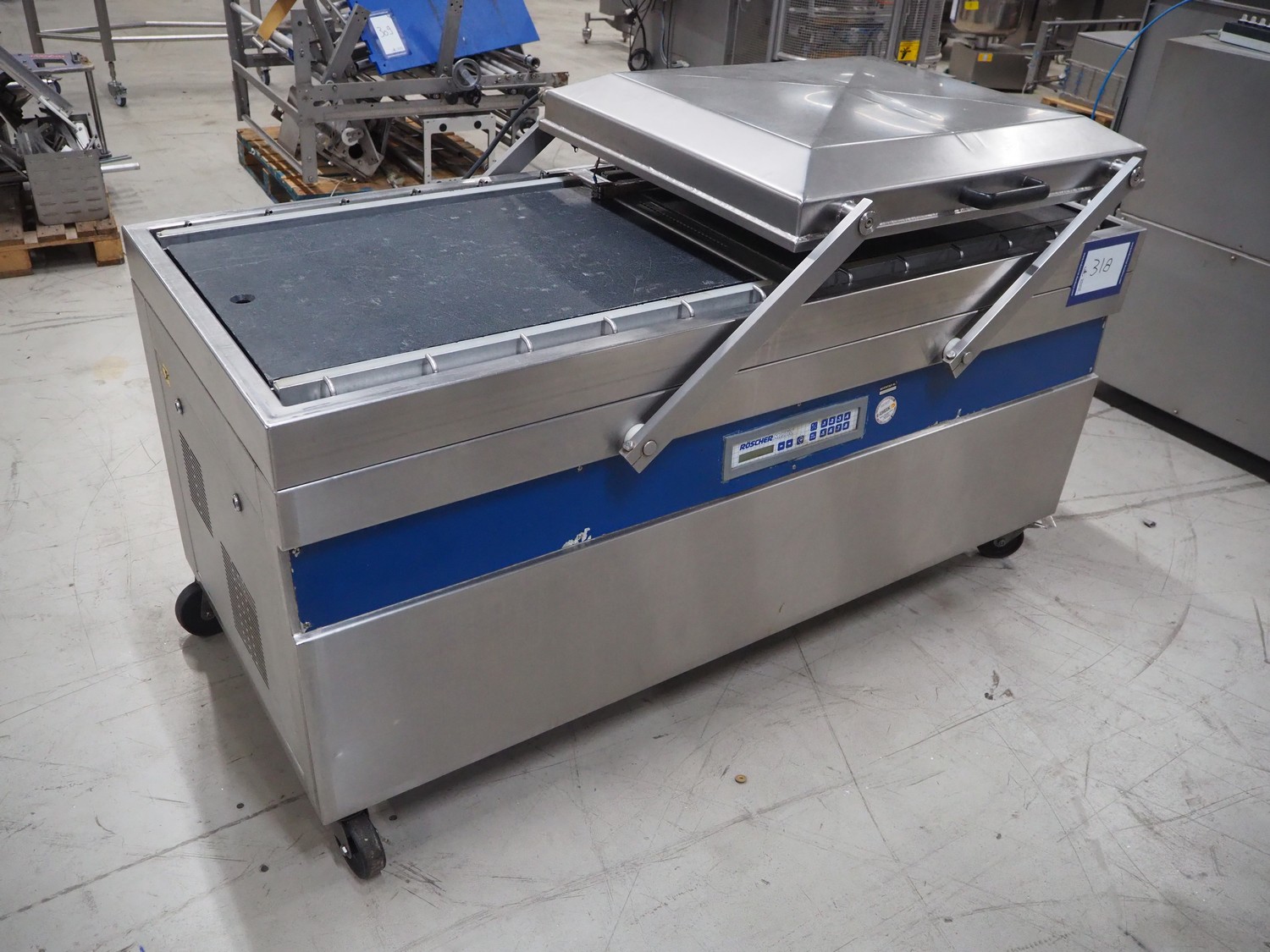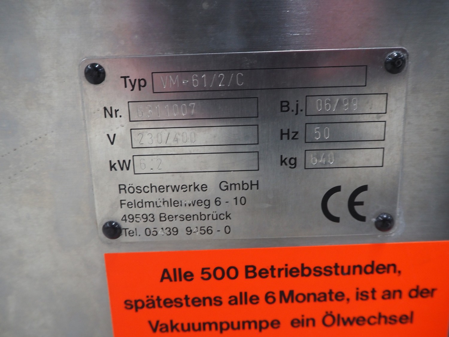 Röscherwerke GmbH mobile double chamber vacuum machine, type: VM-61/2/C, number: 6311007, year of construction: 06/99, 230/400 V, 50 Hz, 6.2 kW, weight: 640 kg, seal length: (4x) 860 mm, chamber: (2x) 880 mm x 640 mm, Busch vacuum pump, type: RA 0250 D 561 QMZZ, number: C9920000012, capacity: 250 m³ per hour, total dimensions: 1950 mm x 920 mm x 1100 mm.