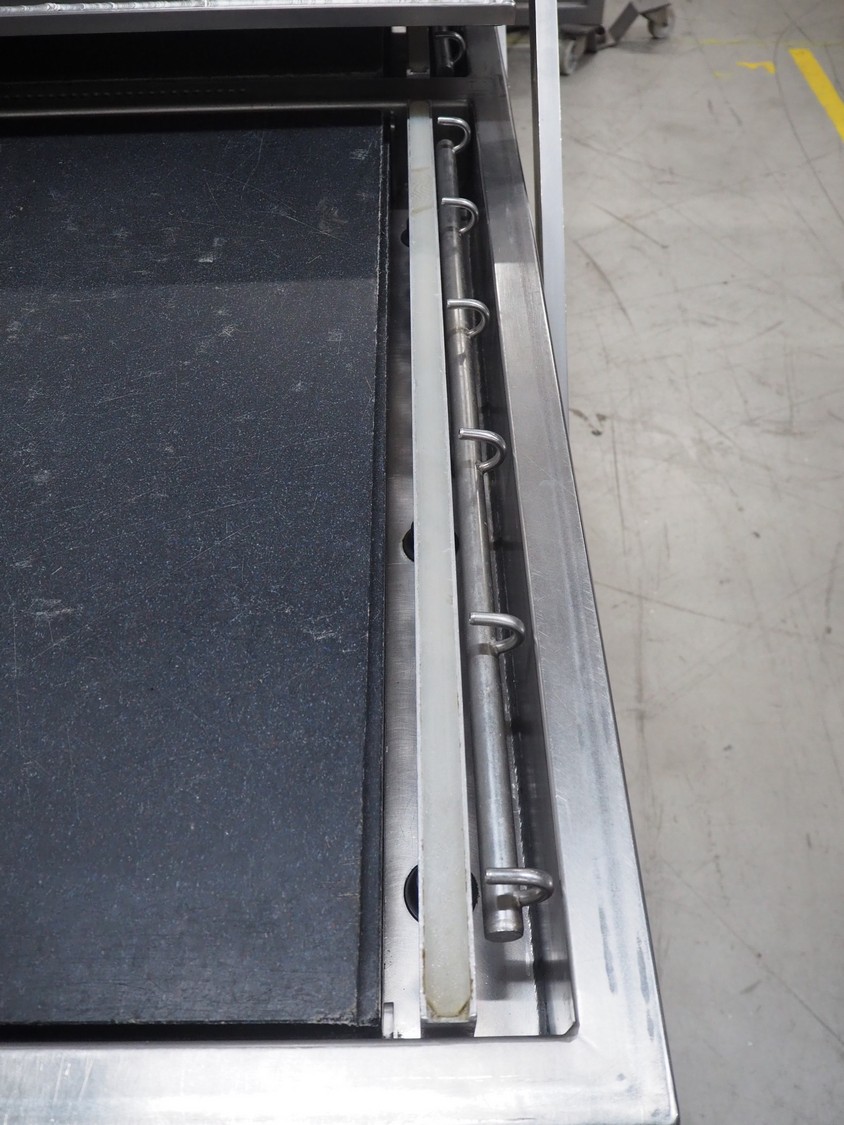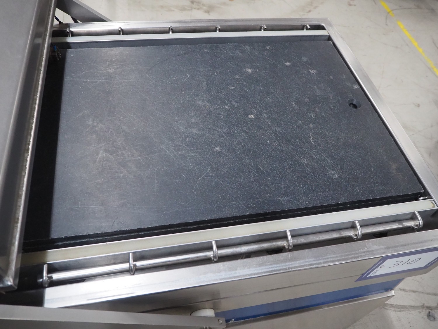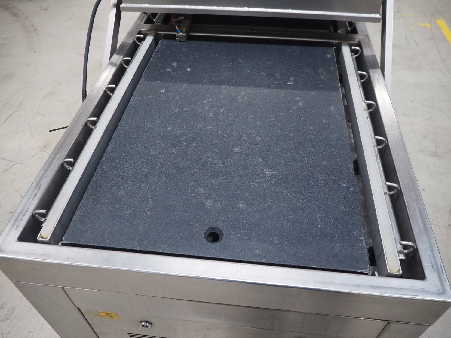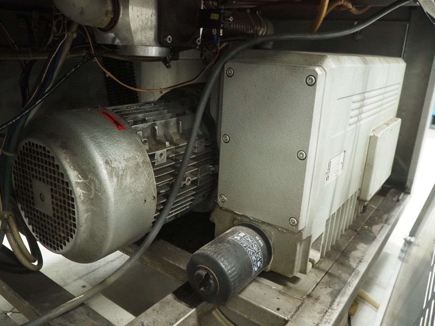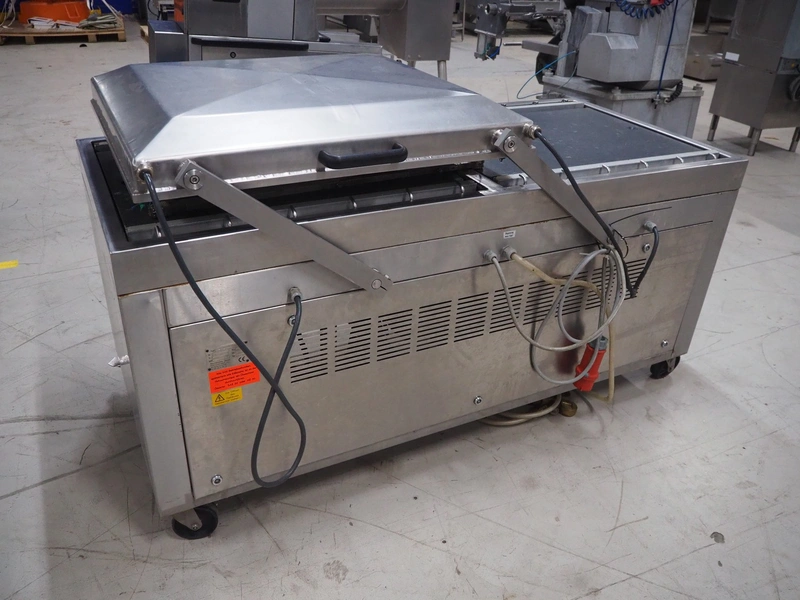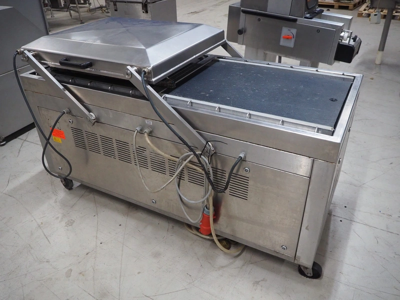 Röscherwerke GmbH mobile double chamber vacuum machine, type: VM-61/2/C, number: 6311007, year of construction: 06/99, 230/400 V, 50 Hz, 6.2 kW, weight: 640 kg, seal length: (4x) 860 mm, chamber: (2x) 880 mm x 640 mm, Busch vacuum pump, type: RA 0250 D 561 QMZZ, number: C9920000012, capacity: 250 m³ per hour, total dimensions: 1950 mm x 920 mm x 1100 mm.