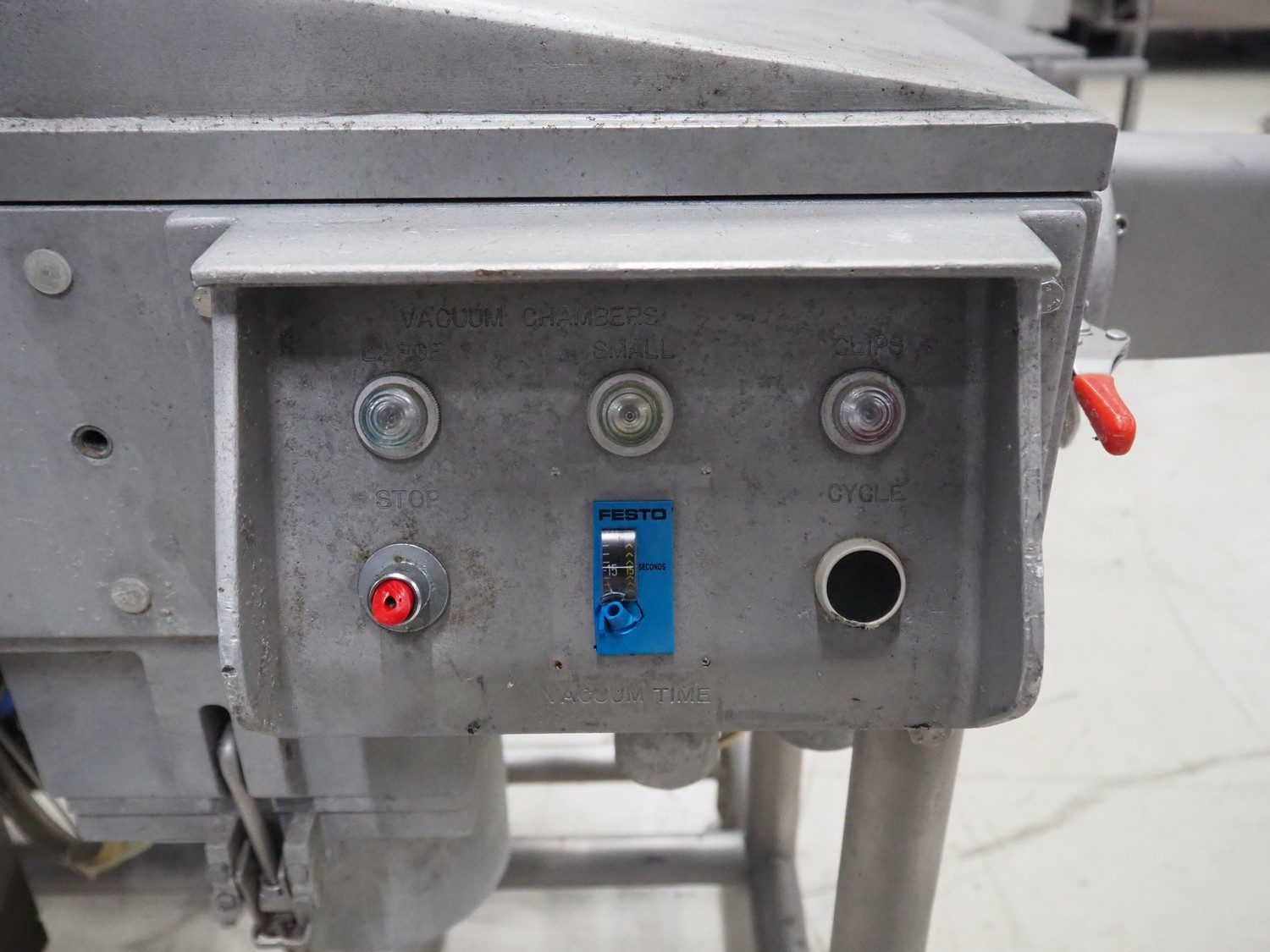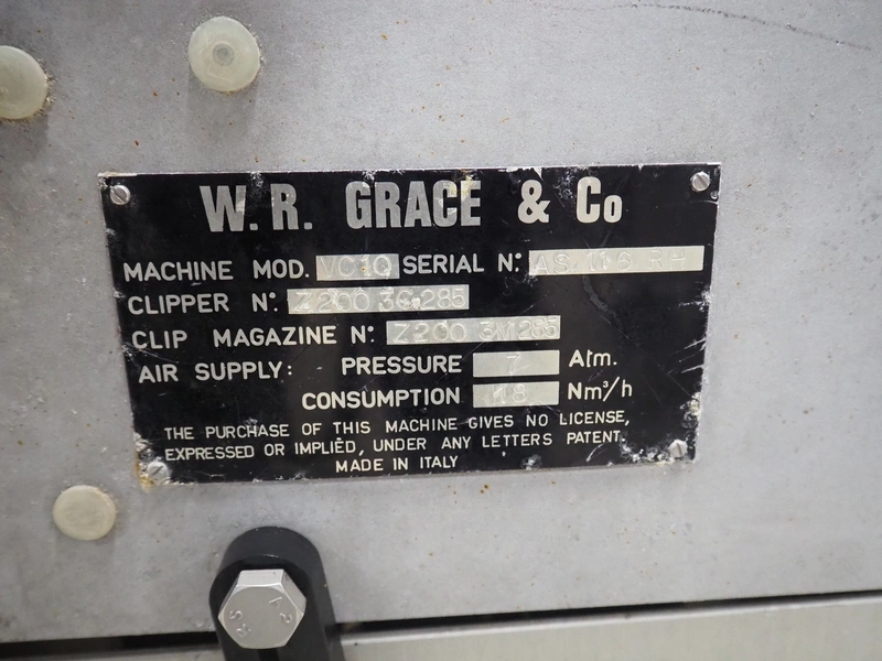 Cryovac / W.R. Grace & Co belt vacuum machine with clipper, model: VC10, number: AS 116 RH, s/s rollers, roller width: 300 mm, chamber: 530 mm x 370 mm, maximum belt width: 320 mm, total dimensions: 1750 mm x 800 mm x 1300 mm.