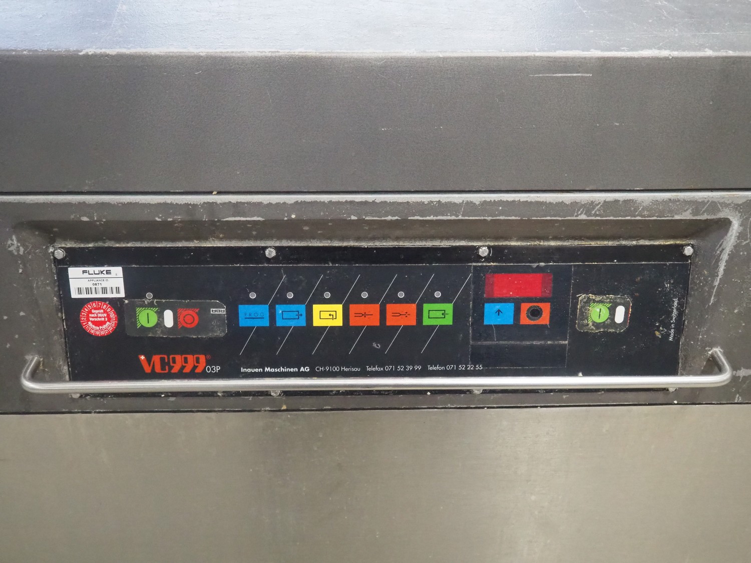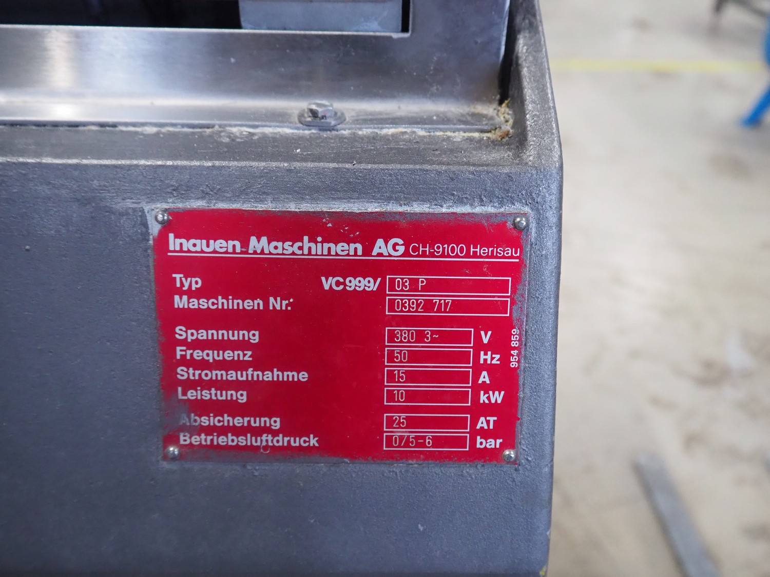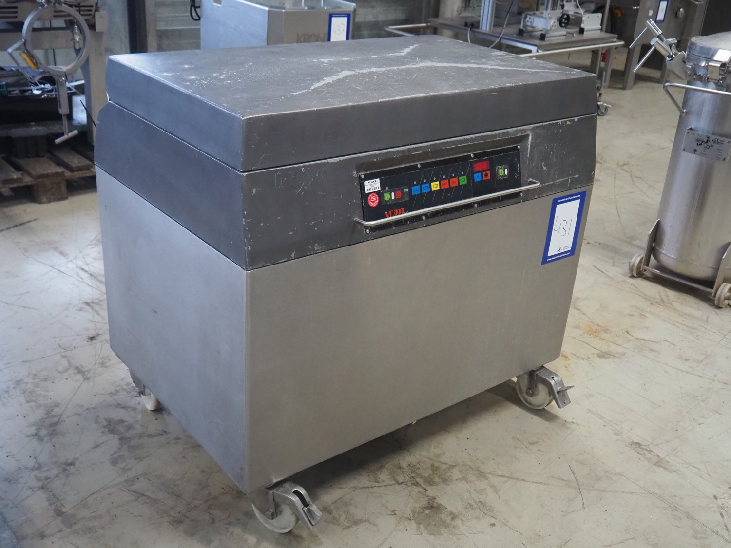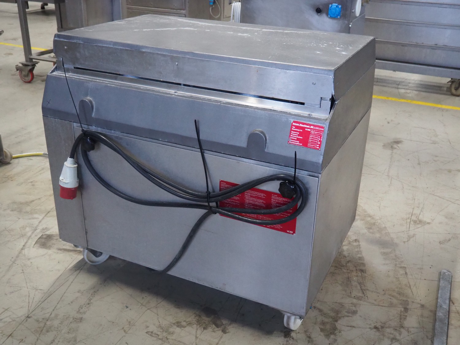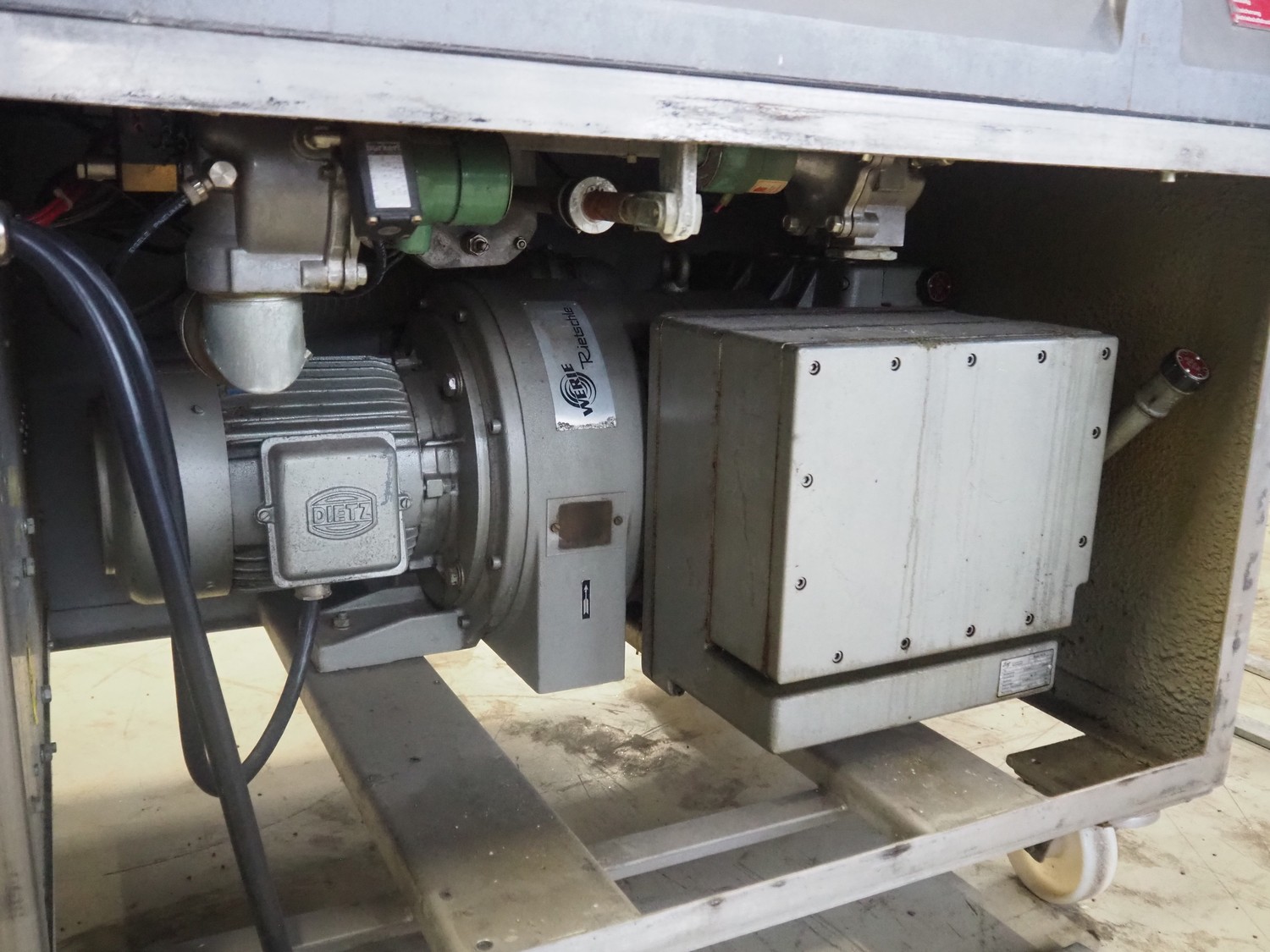 Inauen Maschinen AG mobile vacuum machine, type: VC999/03 P, machine number: 0392 717, 380 V, 3 Ph, 50 Hz, 15 A, 10 kW, seal width: (1x) 1000 mm and (2x) 450 mm, Rietschle vacuum pump, type: CLFH 220 V (01), fabrication number: 1414623, year of construction: 1991, capacity: 220 m³ per hour, total dimensions: 1130 mm x 750 mm x 1030 mm.