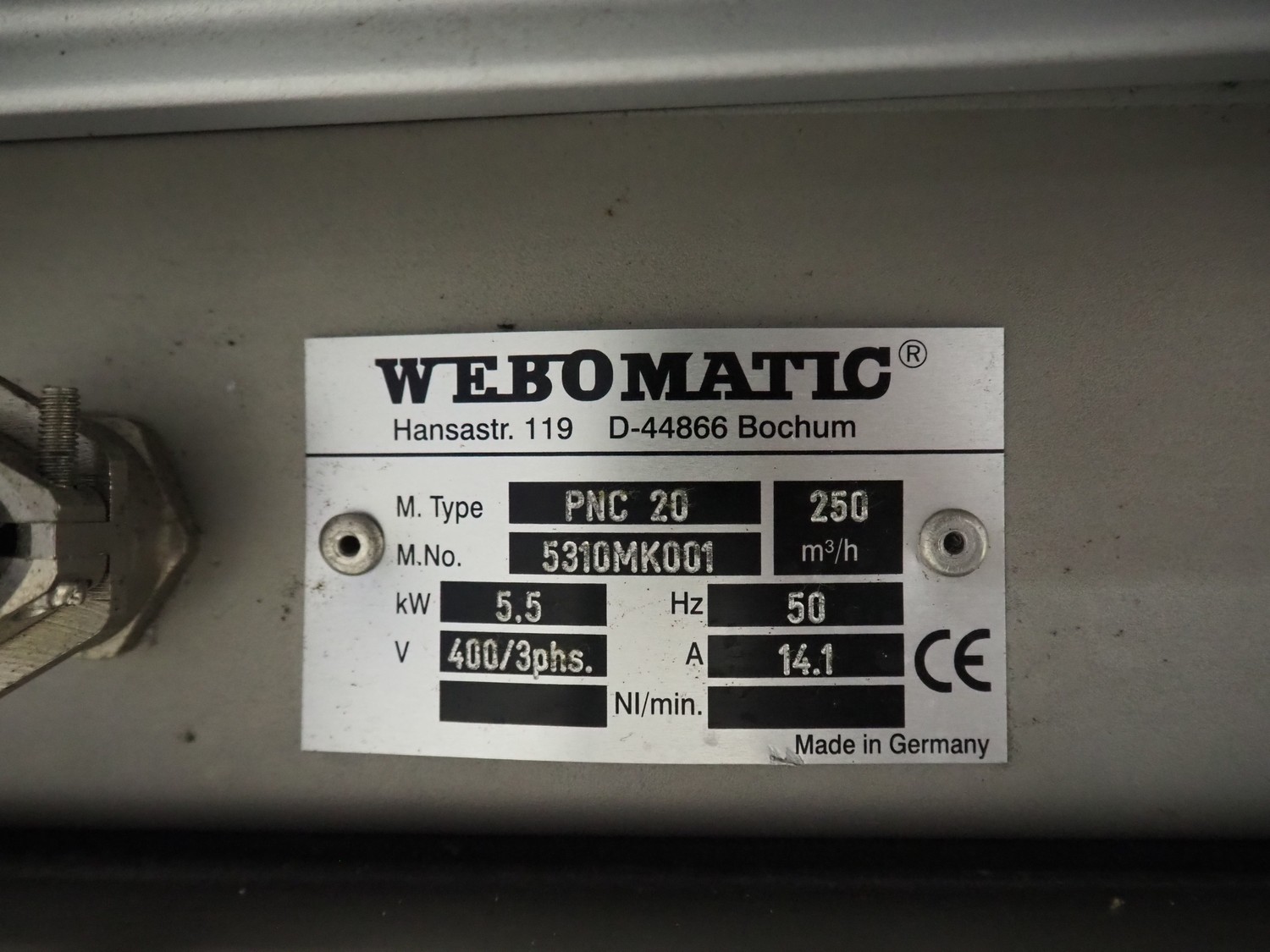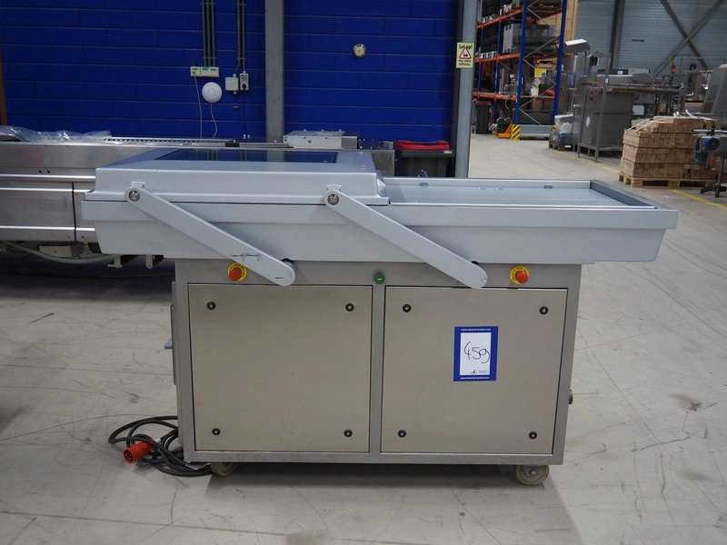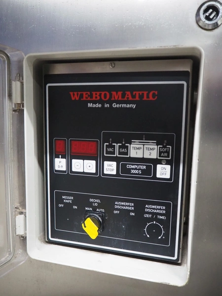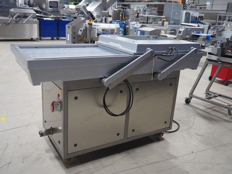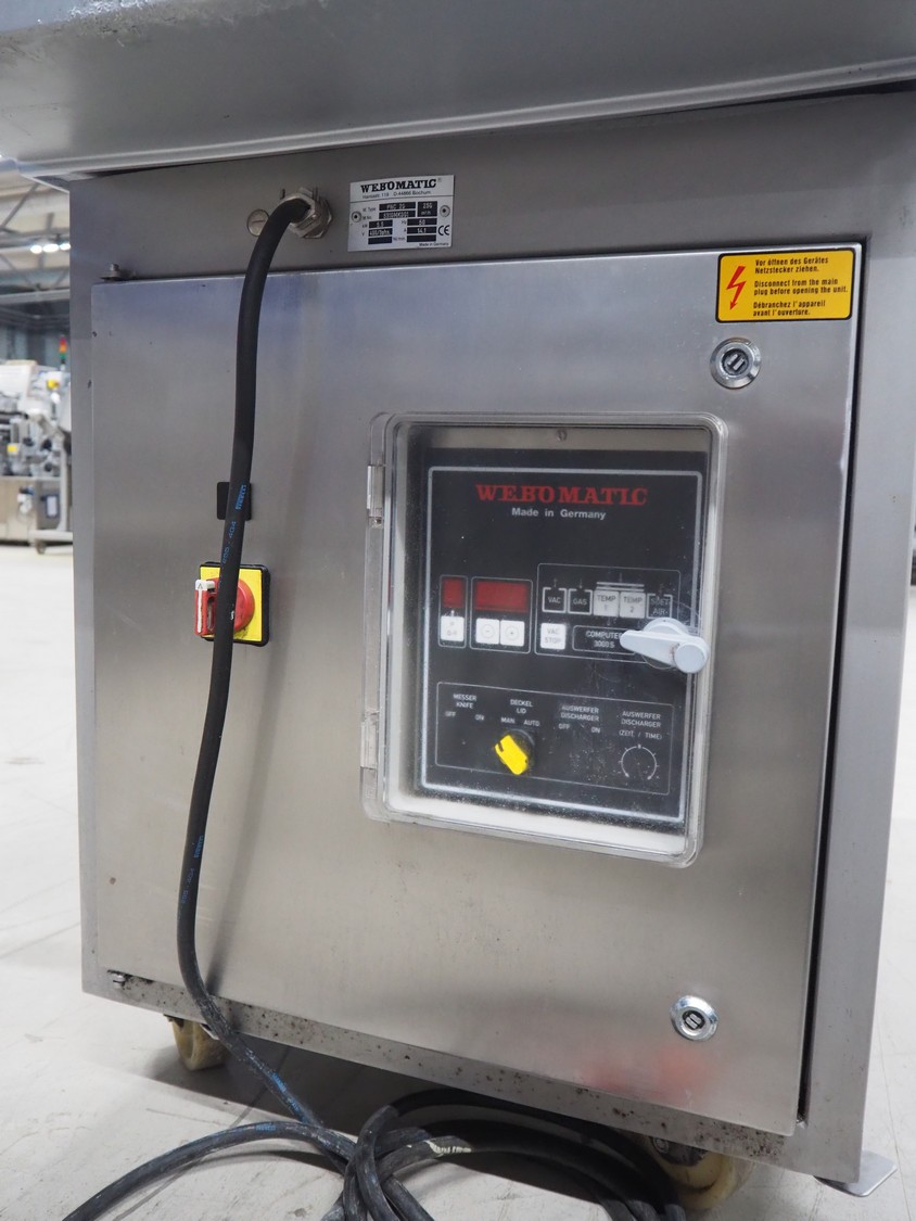Webomatic mobile double chamber vacuum machine, type: PNC 20, machine number: 5310MK001, 400 V, 3 Ph, 50 Hz, 14.1 A, 5.5 kW, seal length: (4x) 800 mm, dimensions chamber: (2x) 800 mm x 700 mm, total dimensions: 1900 mm x 900 mm x 1200 mm. Without vacuum pump.