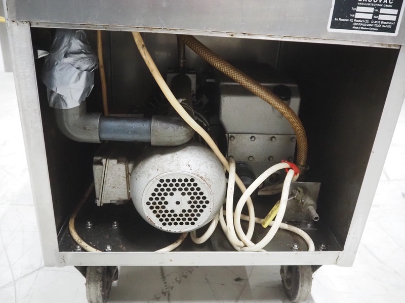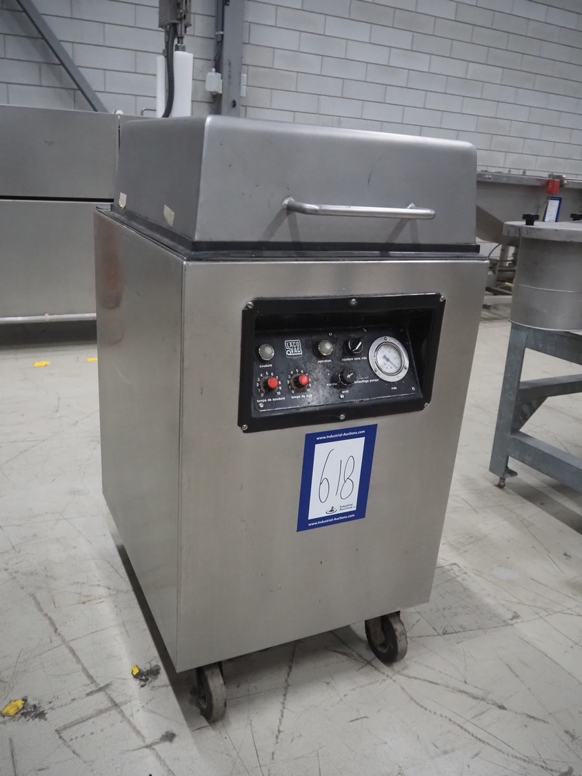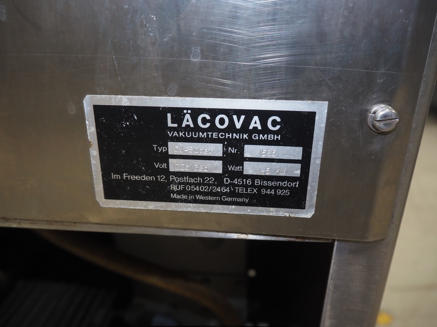 Läcovac mobile vacuum machine, type: CV-super, number: 1585, 220/380 V, 1.5 kW, Busch vacuum pump, seal length: 460 mm, dimensions chamber: 490 mm x 490 mm, total dimensions: 750 mm x 570 mm x 1100 mm.