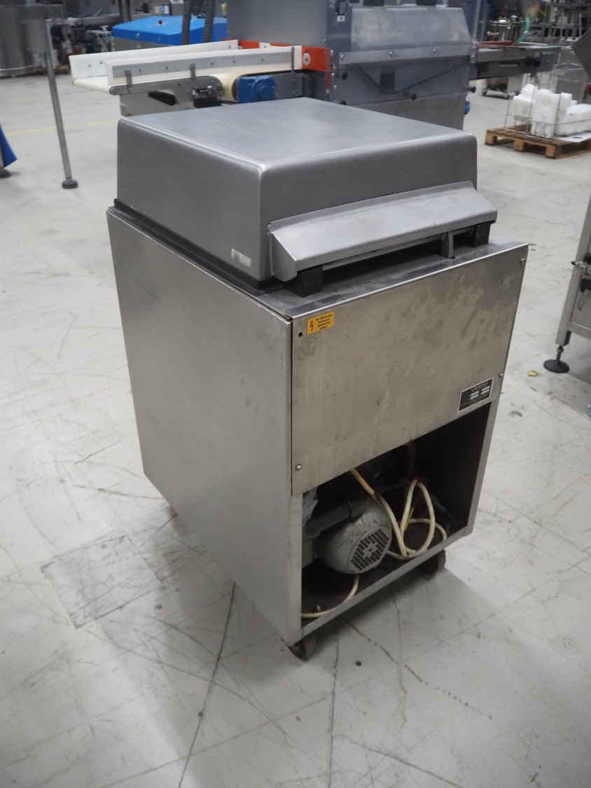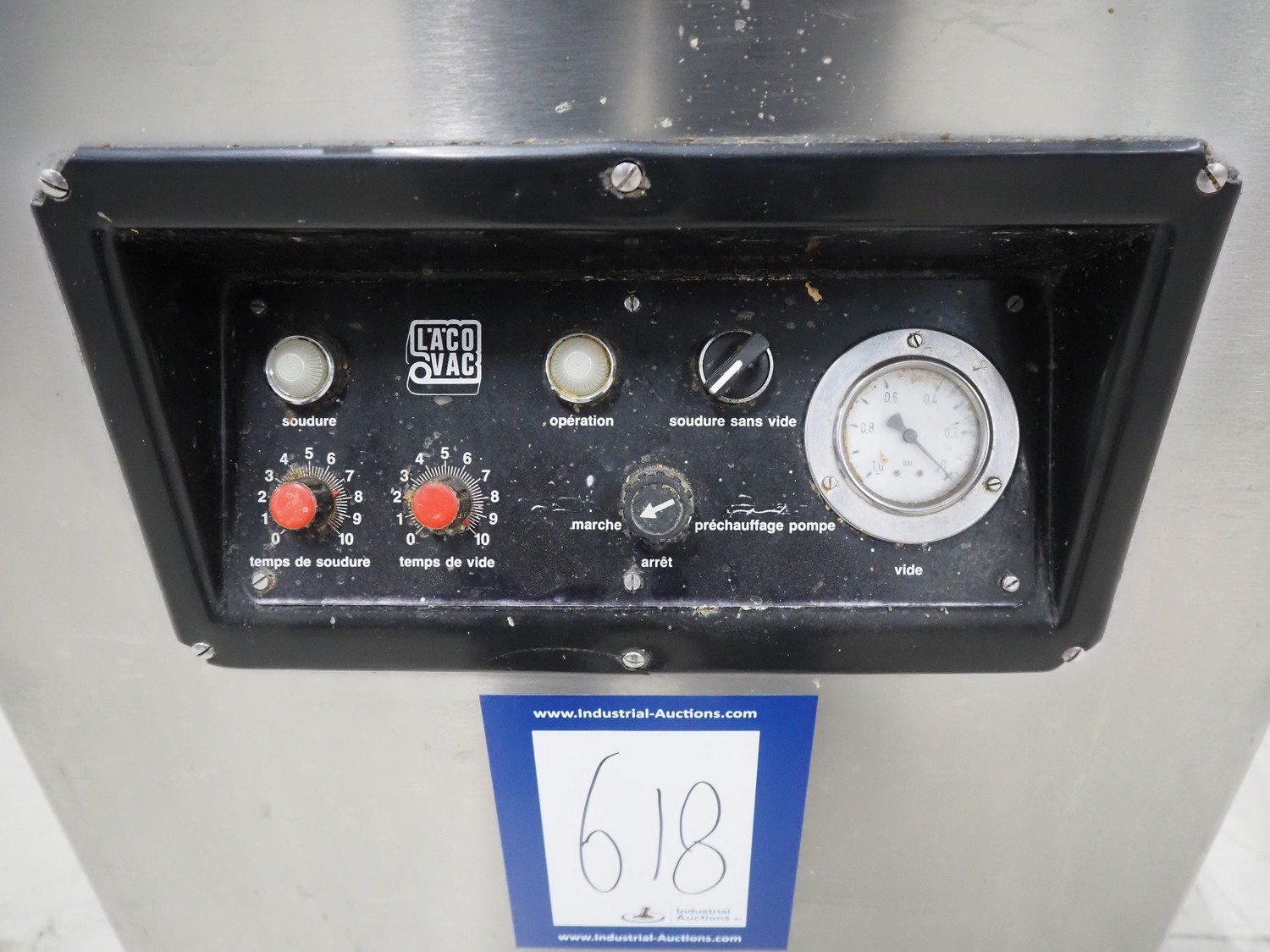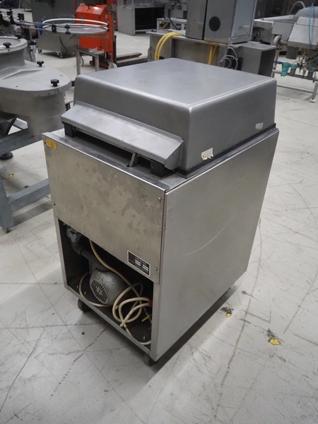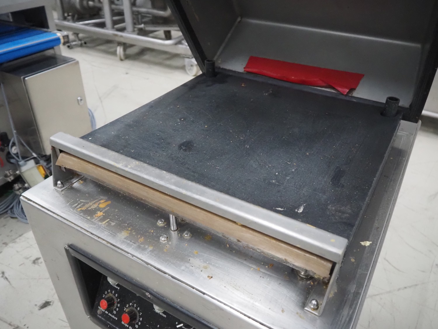Läcovac mobile vacuum machine, type: CV-super, number: 1585, 220/380 V, 1.5 kW, Busch vacuum pump, seal length: 460 mm, dimensions chamber: 490 mm x 490 mm, total dimensions: 750 mm x 570 mm x 1100 mm.