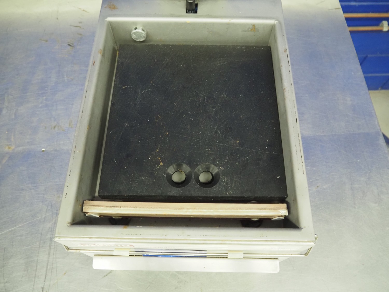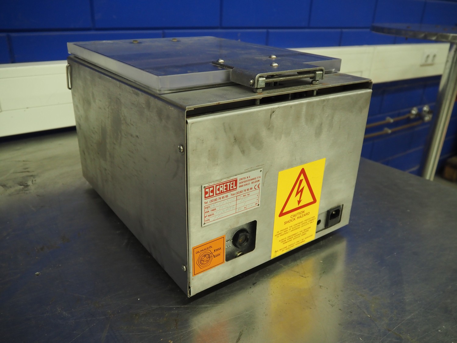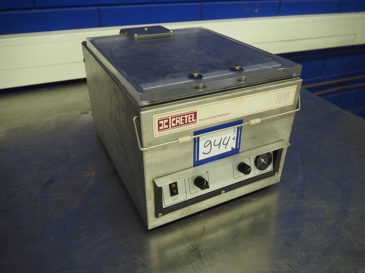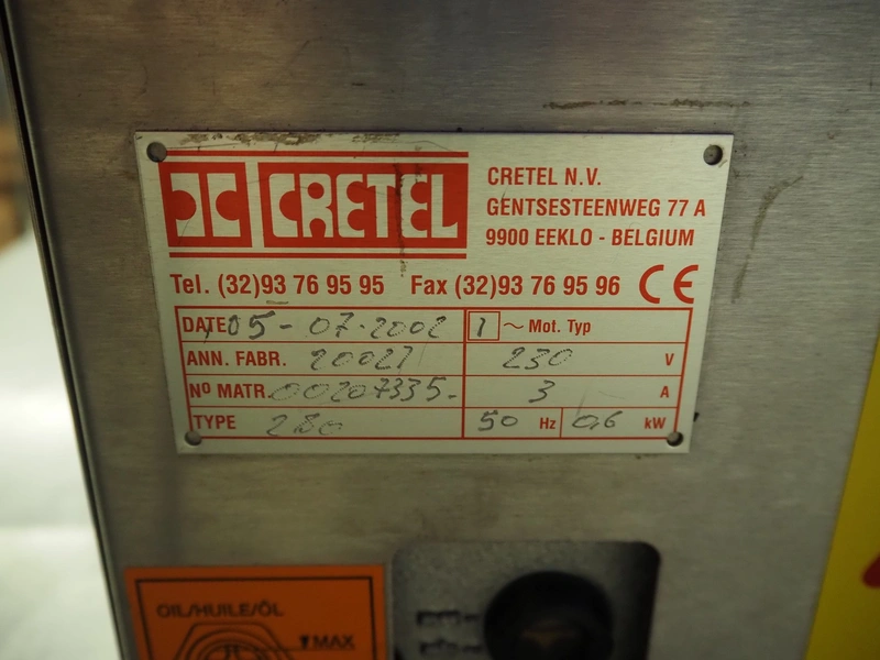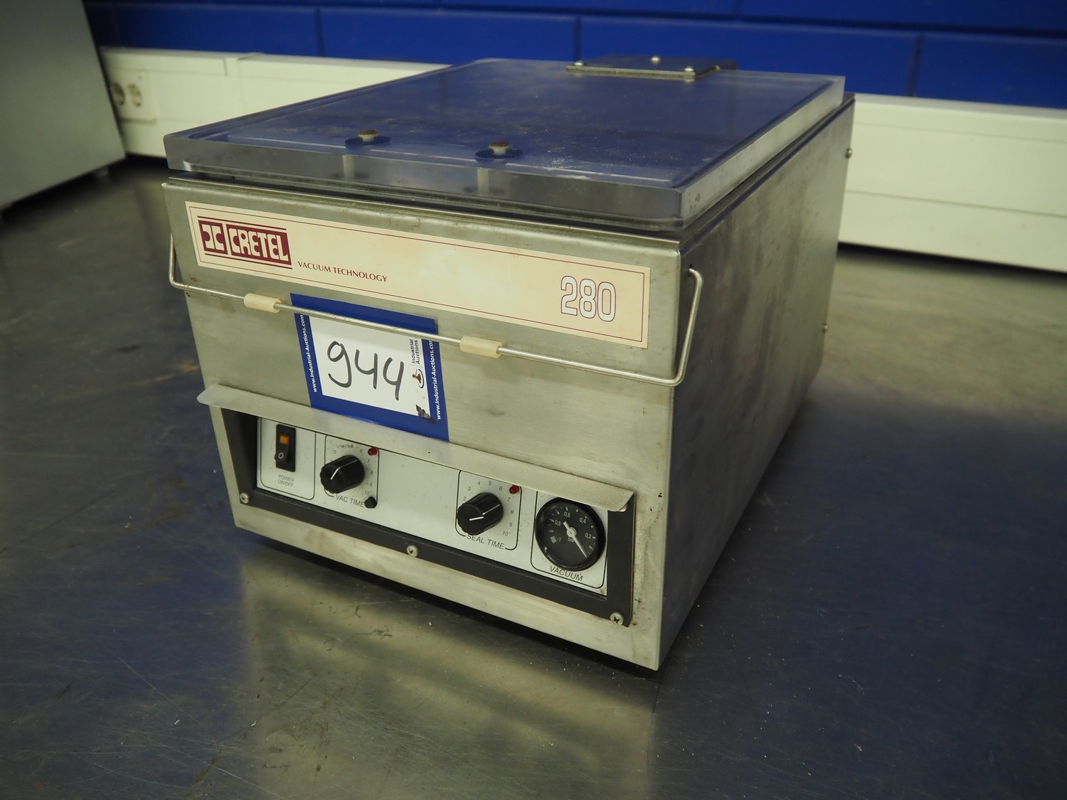 Cretel vacuum machine, type: 280, serial number: 00207335, year of construction: 05-07-2002, 230 V, 1 Ph, 50 Hz, 3 A, 0.6 kW, seal length: 275 mm, dimensions chamber: 280 mm x 345 mm x 45 mm, total dimensions: 320 mm x 460 mm x 280 mm.