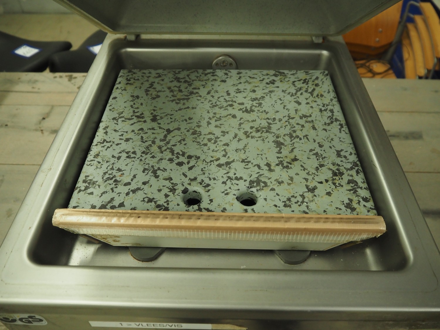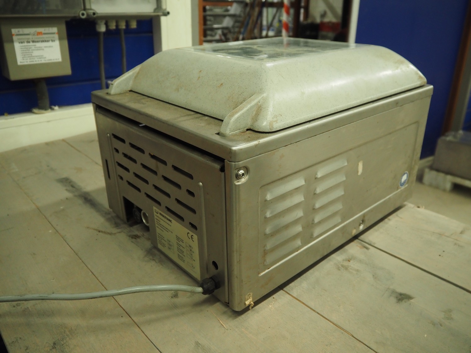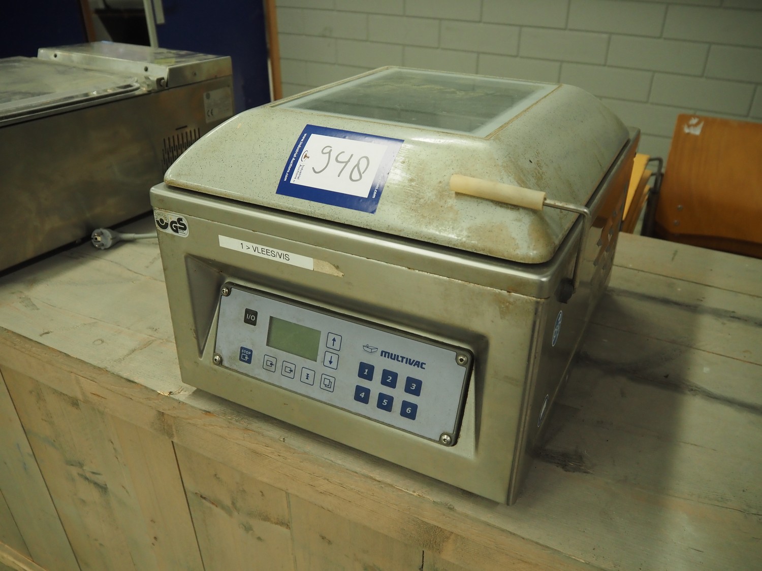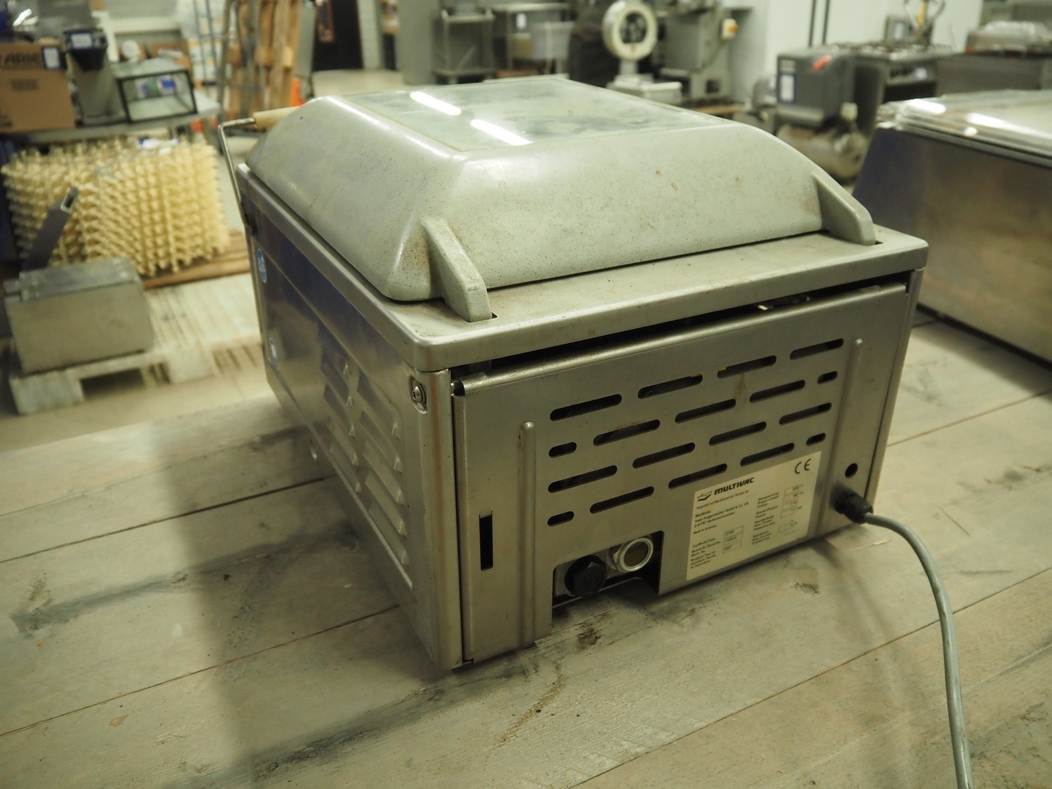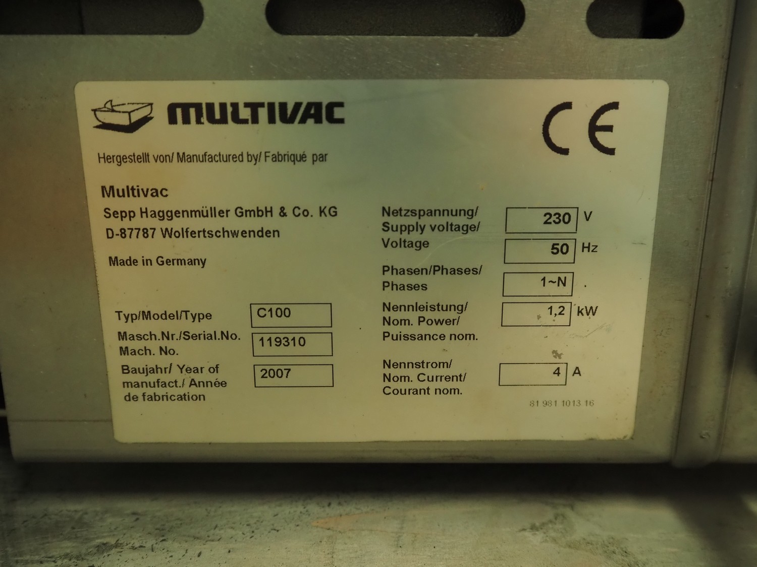 Multivac vacuum machine, model: C100, machine number: 119310, year of construction: 2007, 230 V, 1 Ph, 50 Hz, 4 A, 1.2 kW, seal length: 315 mm, dimensions chamber: 335 mm x 320 mm x 30 mm, total dimensions: 500 mm x 400 mm x 330 mm.