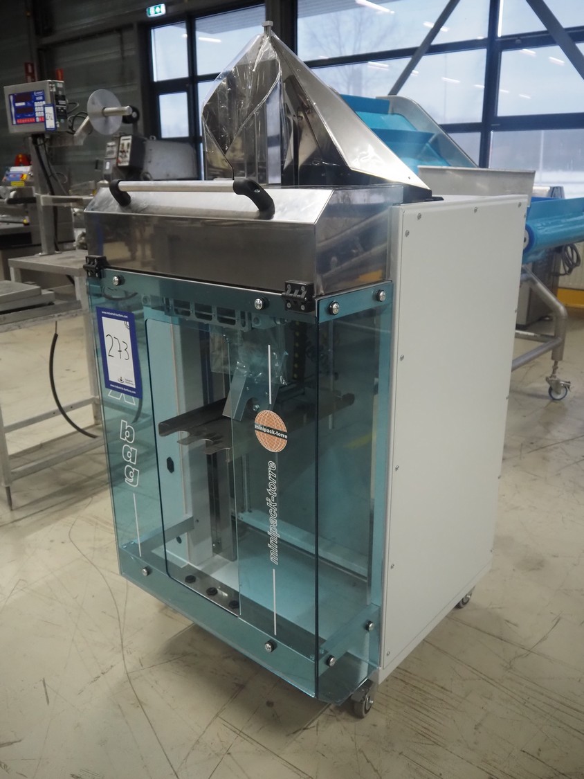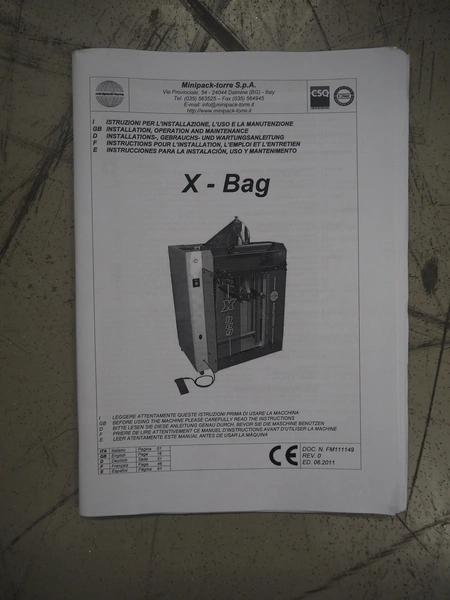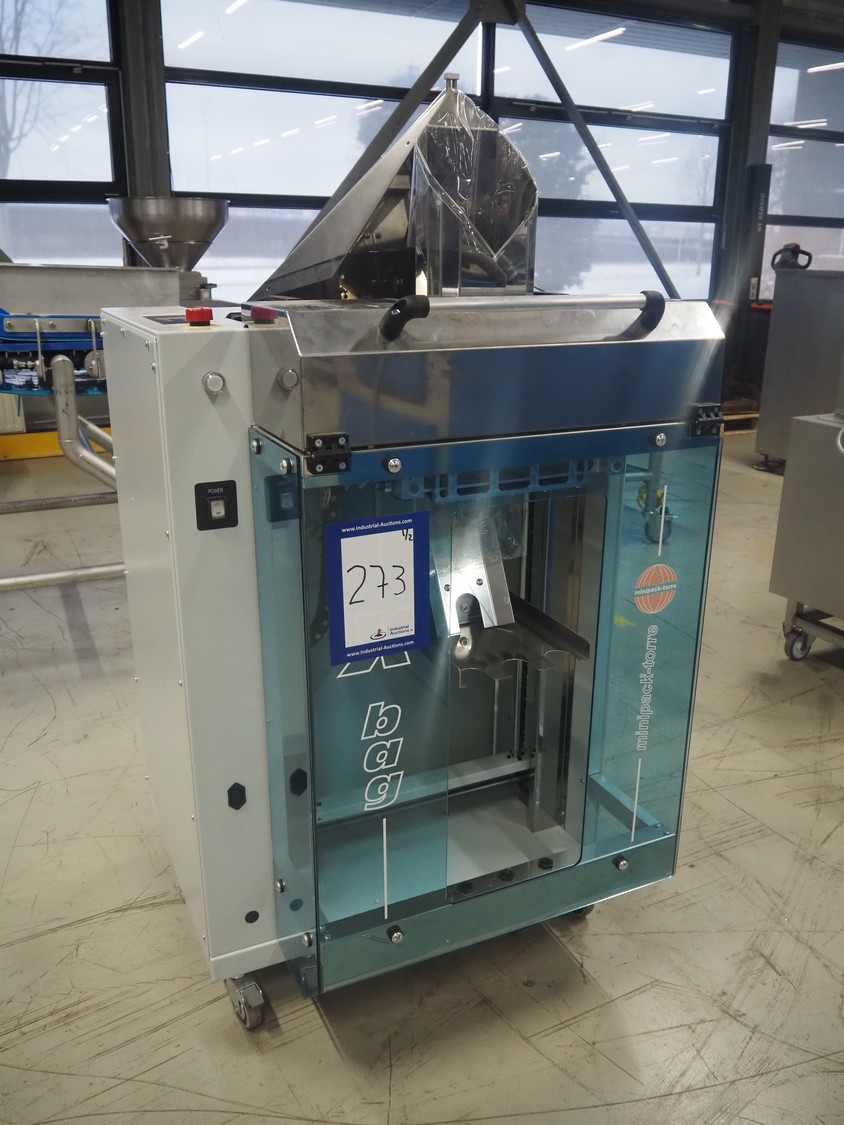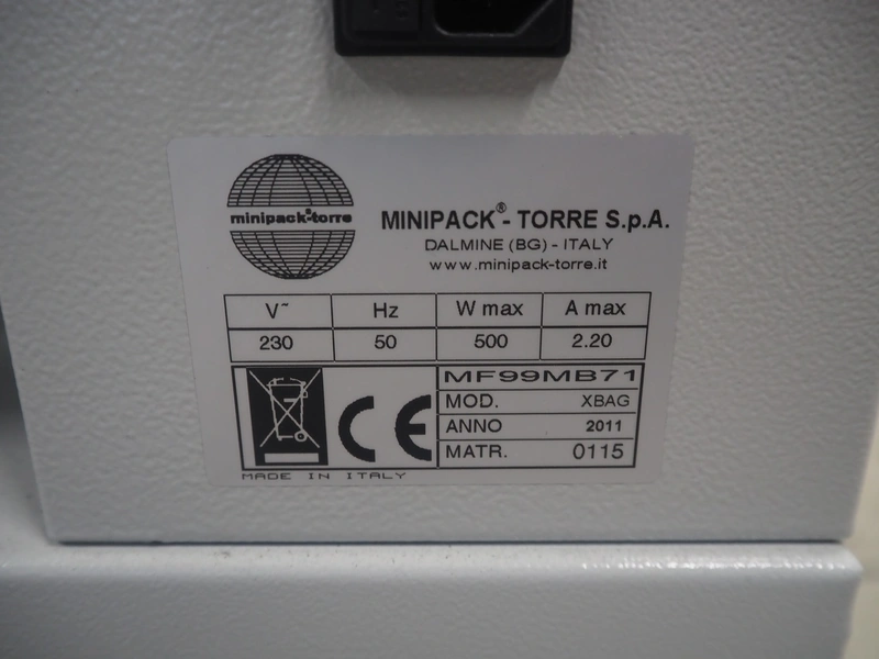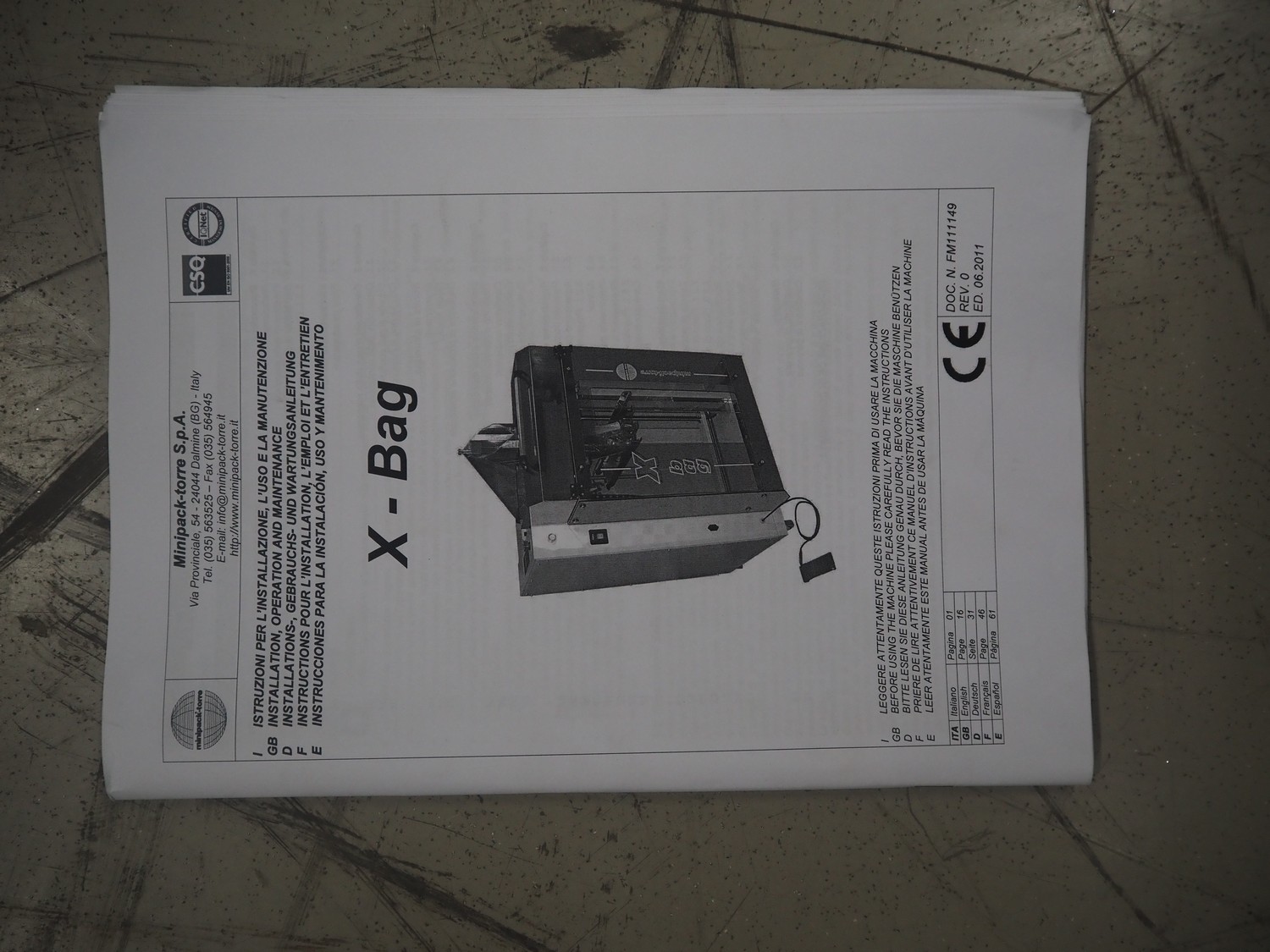 Minipack Torre mobile vertical bag form-, fill-, and seal machine, model: XBAG, serial number: 0115, year of construction: 2011, 230 V, 50 Hz, 2.2 A, 500 W, seal width: 250 mm, total dimensions: 850 mm x 800 mm x 1600 mm. With box with additional parts.