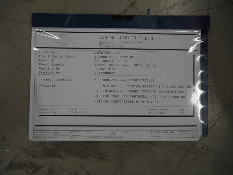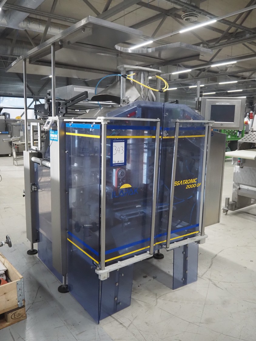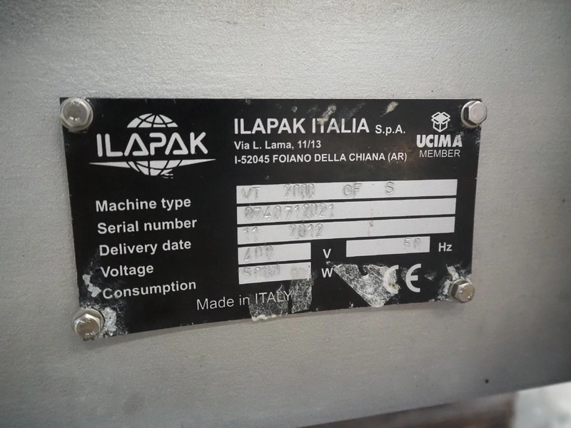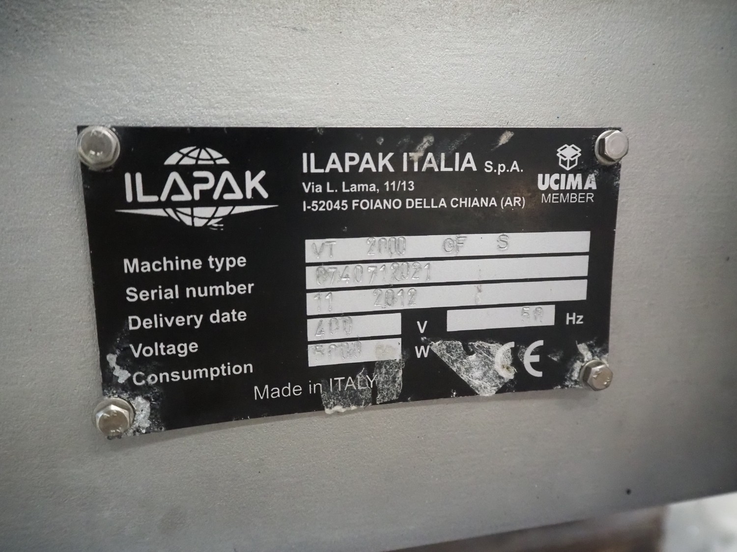 Ilapak vertical bag form-, fill- and seal machine, type: VT 2000 GF S, serial number: 0740712021, year of construction: 11-2012, 400 V, 50 Hz, 500 W, diameter pipe: 180 mm, vertical seal length: 640 mm, horizontal seal length: 450 mm, total dimensions: 2300 mm x 1900 mm x 2500 mm.
