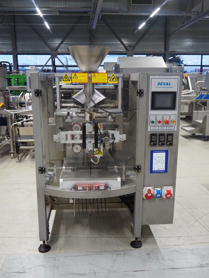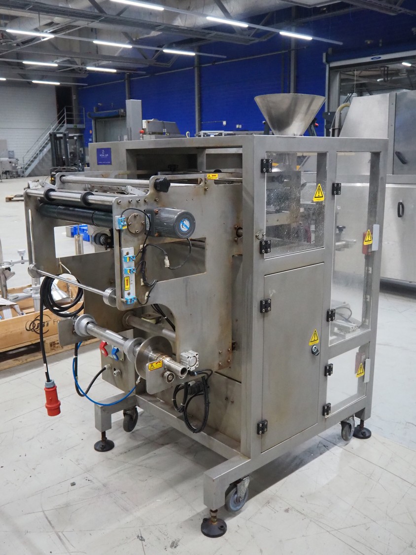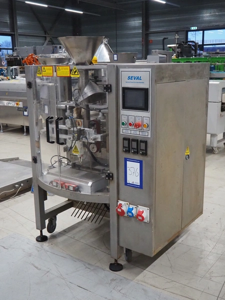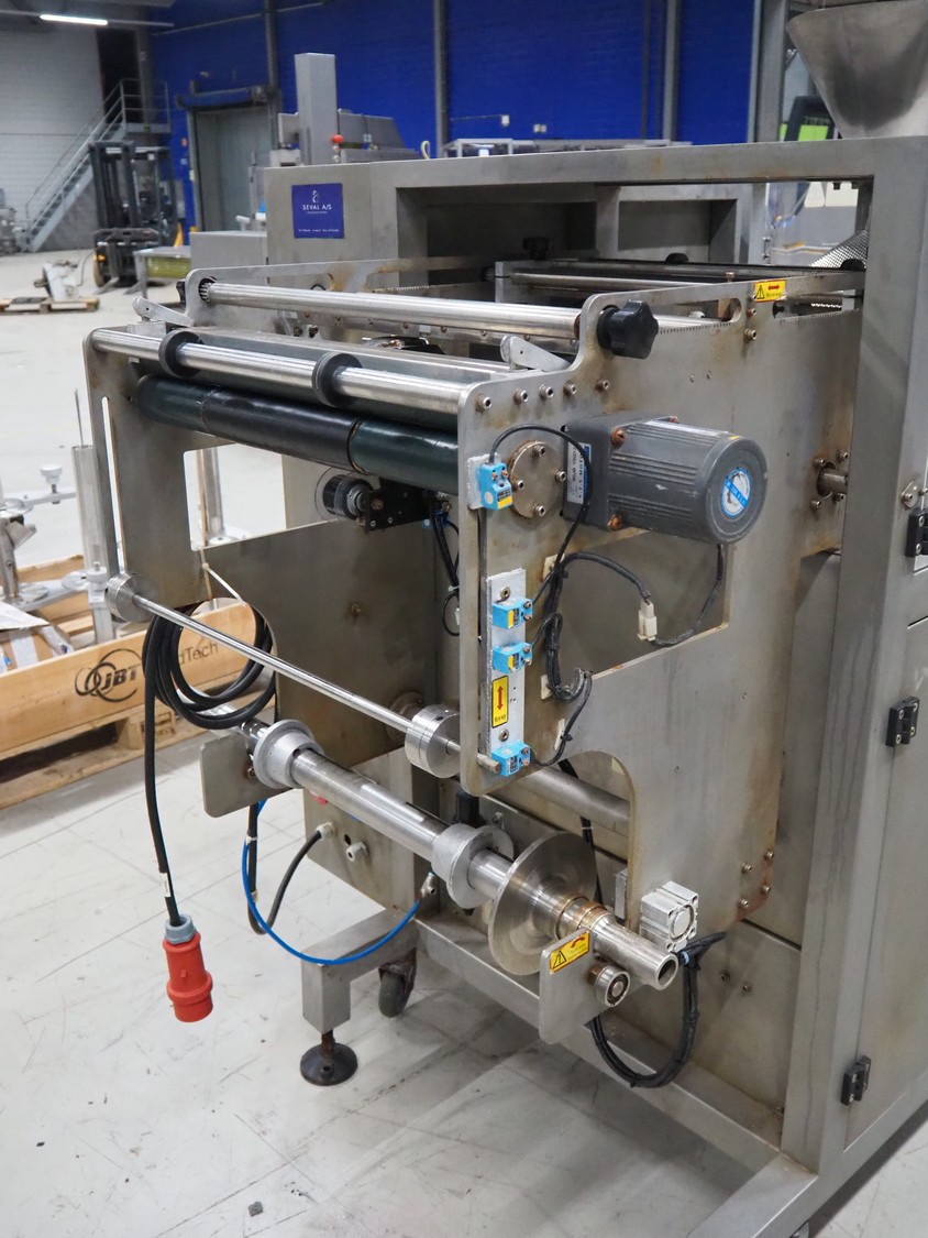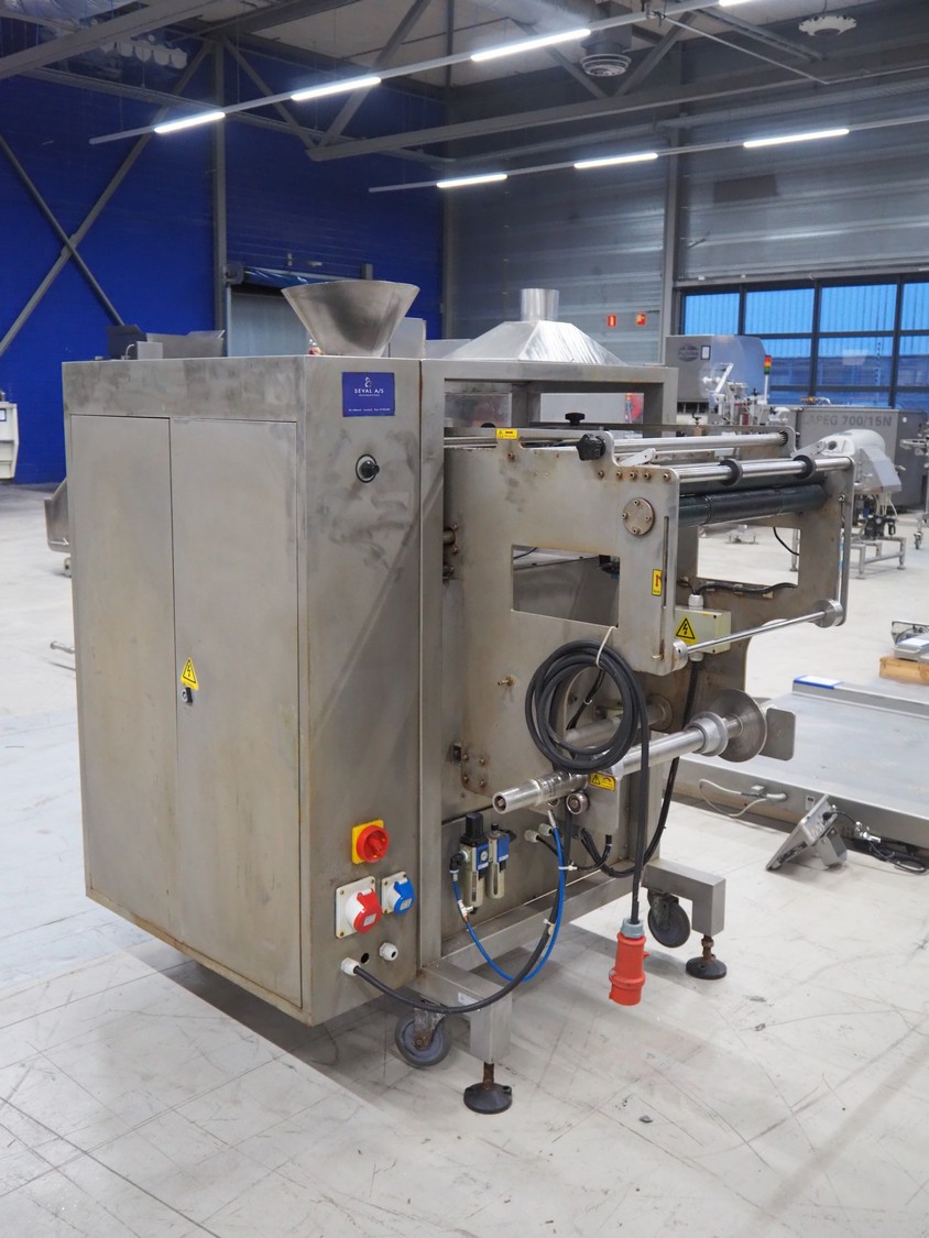 Seval vertical bag form-, fill- and seal machine, diameter filling pipe: 75 mm, vertical seal length: 320 mm, horizontal seal length: 250 mm, total dimensions: 1600 mm x 1150 mm x 1670 mm. Including extra filling pipes, diameter filling pipes: (1x) 55 mm, (1x) 70 mm.