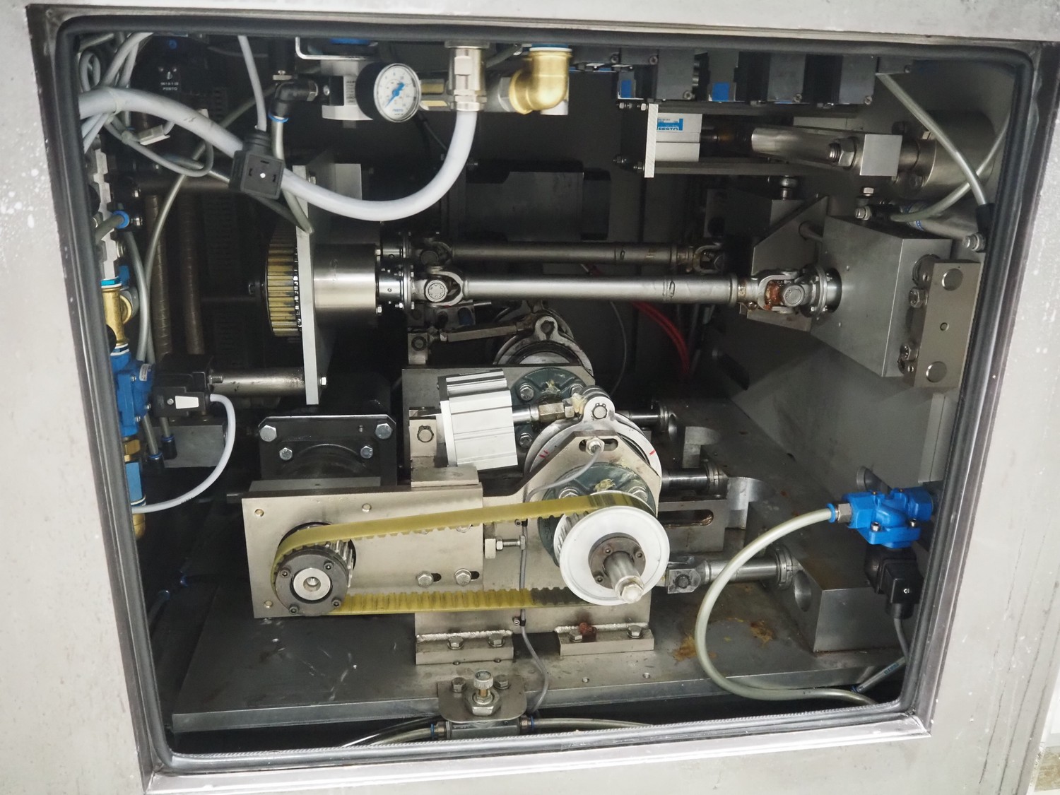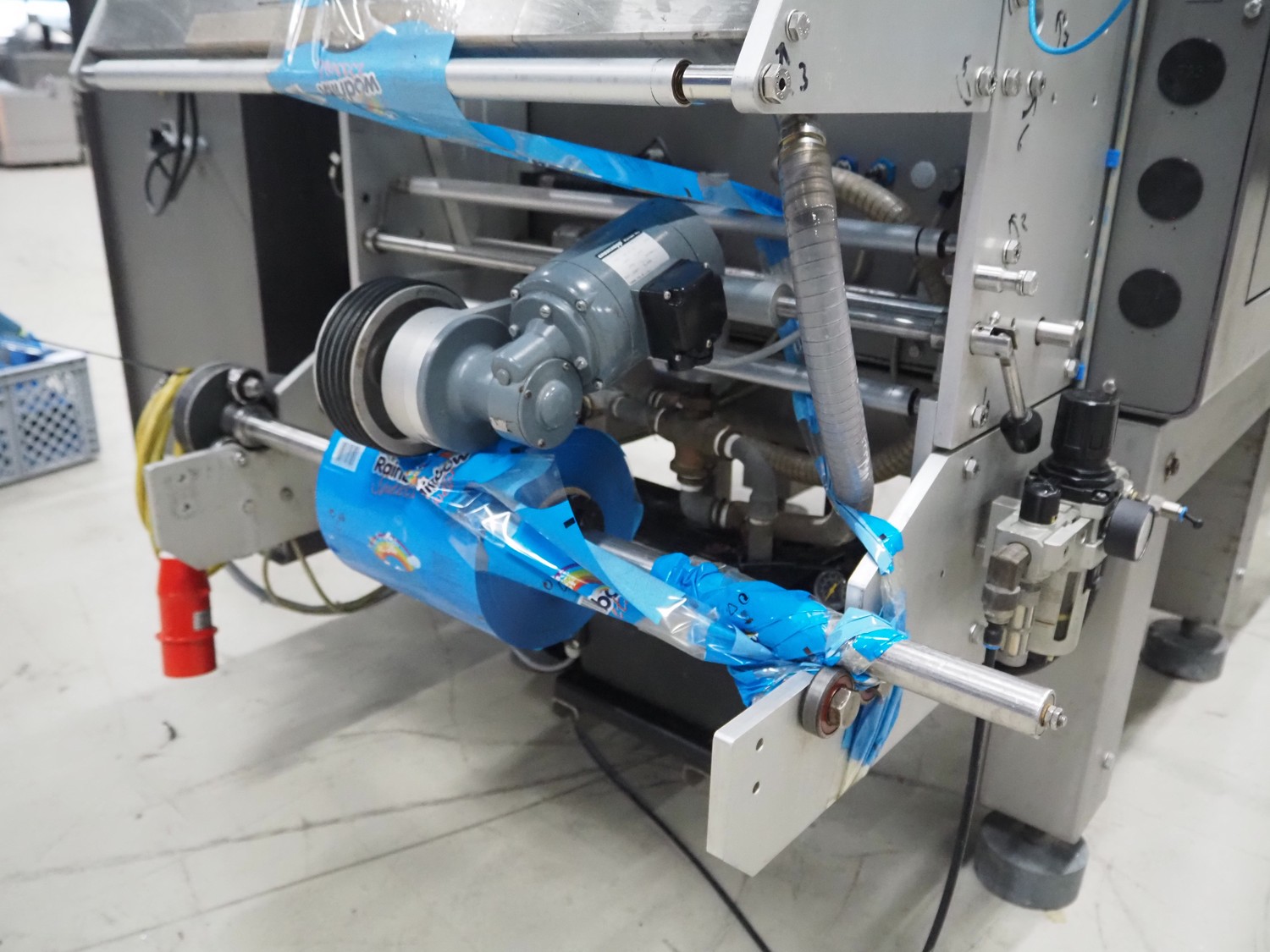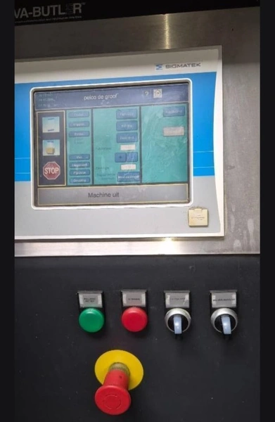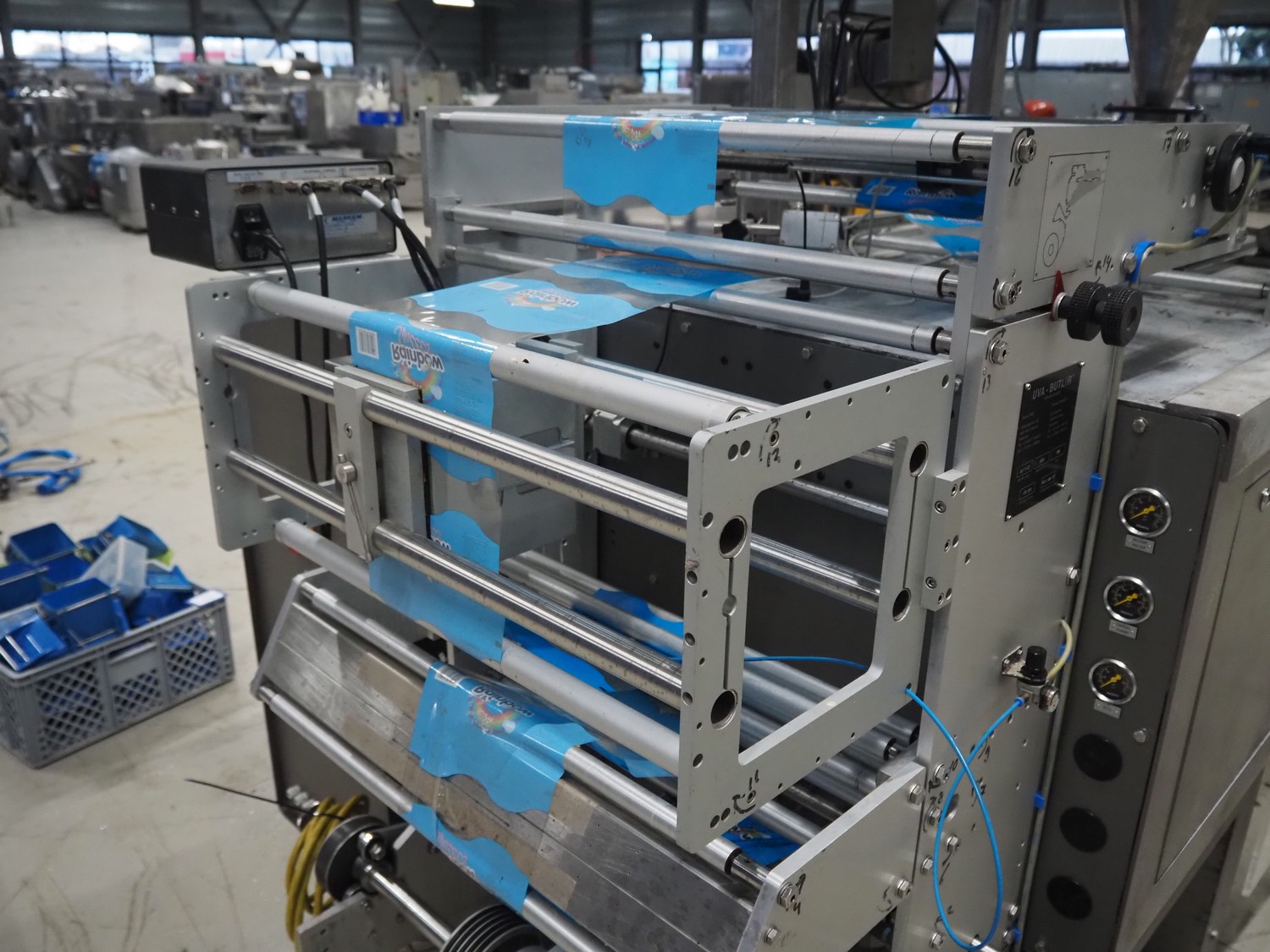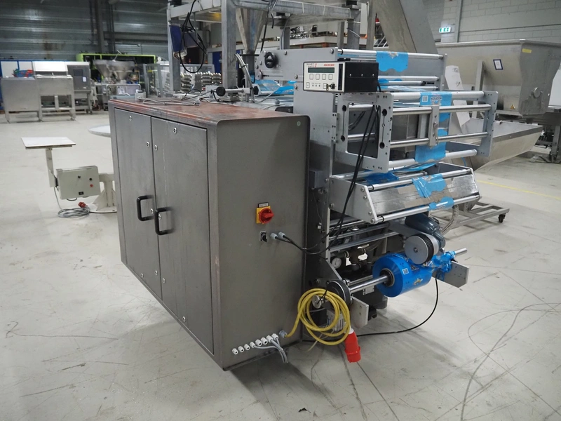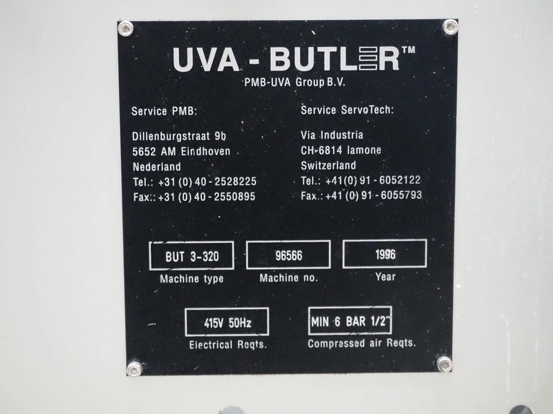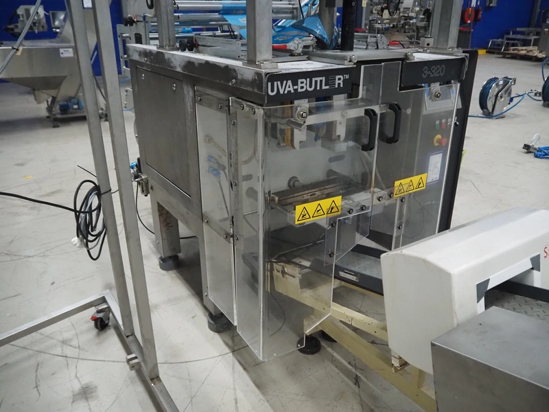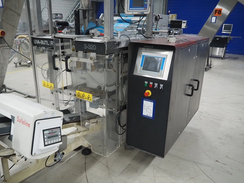 UVA-BUTLER vertical bag forming-, filling- and sealing machine, type: BUT 3-320, machine number: 95666, year of construction: 1996, 415 V, 50 Hz, film width: 220 mm, diameter filling tube: 60 mm, vertical seal length: 345 mm, horizontal seal length: 380 mm, total dimensions: 2050 mm x 1550 mm x 2000 mm.