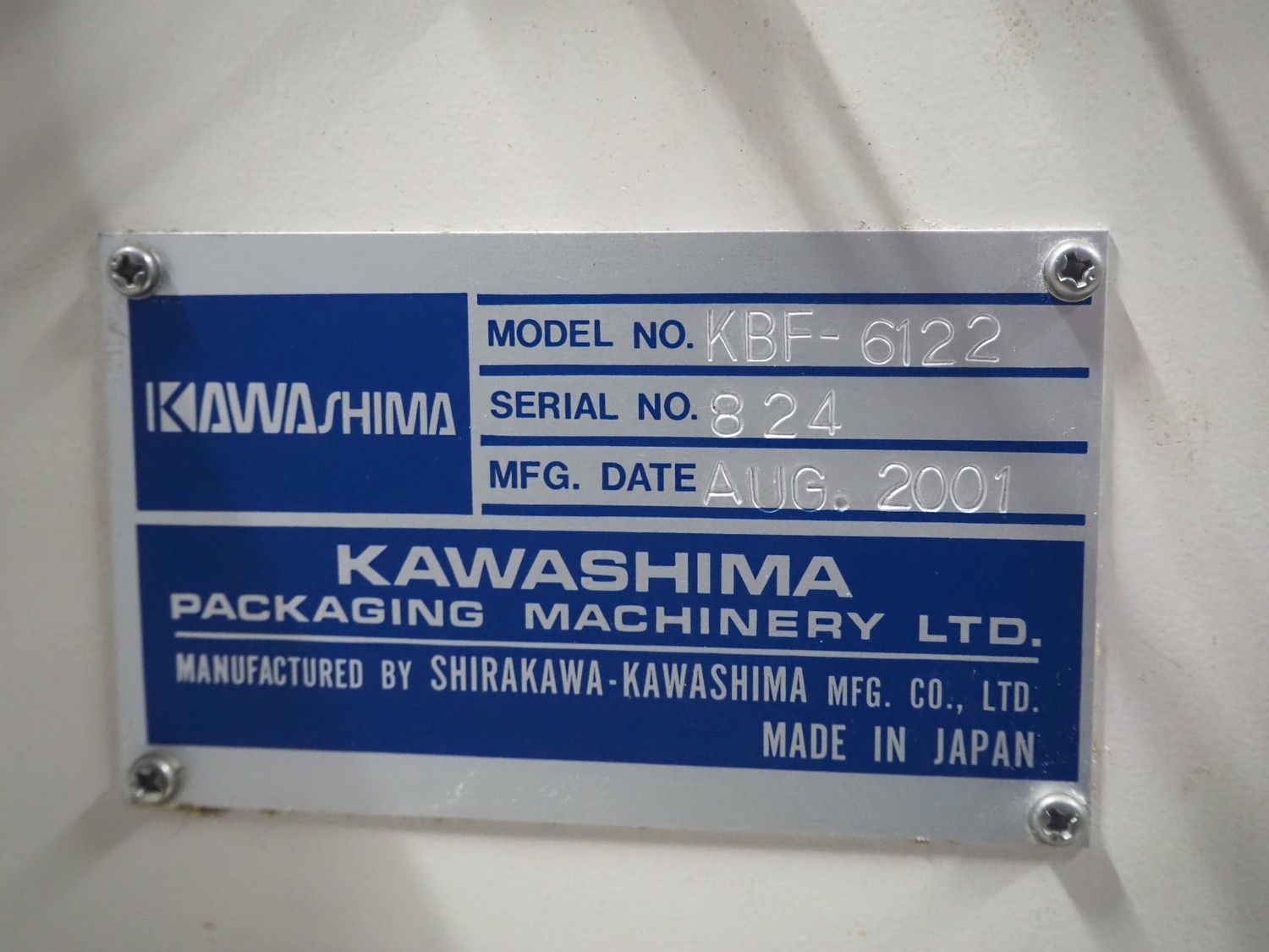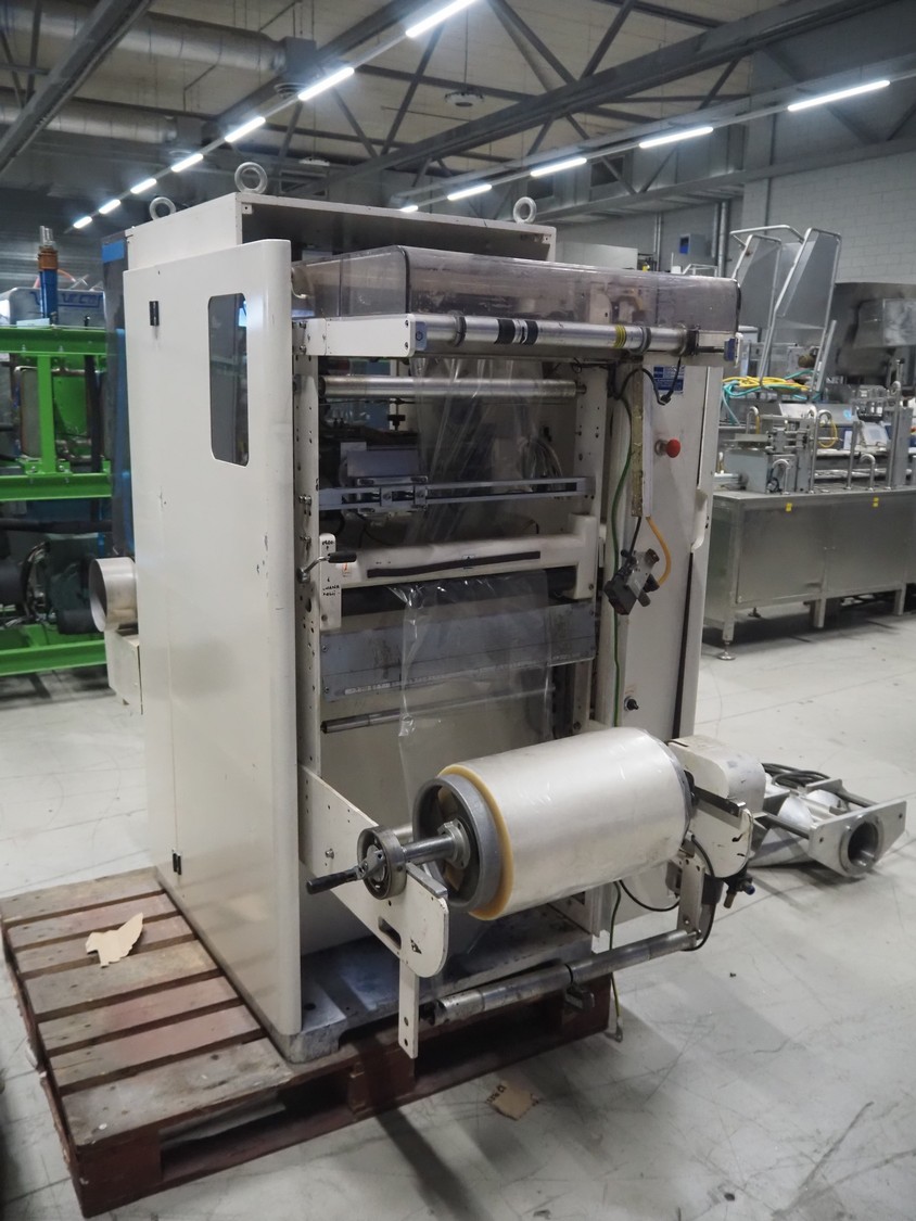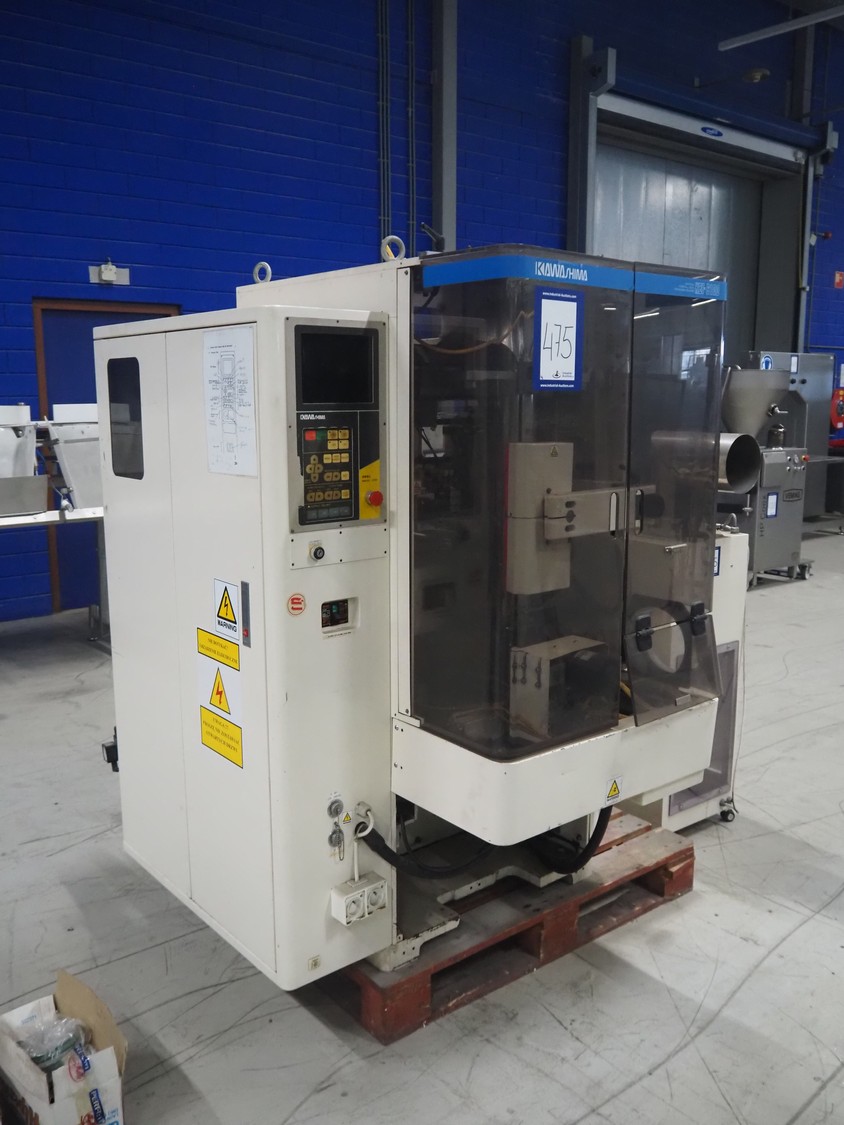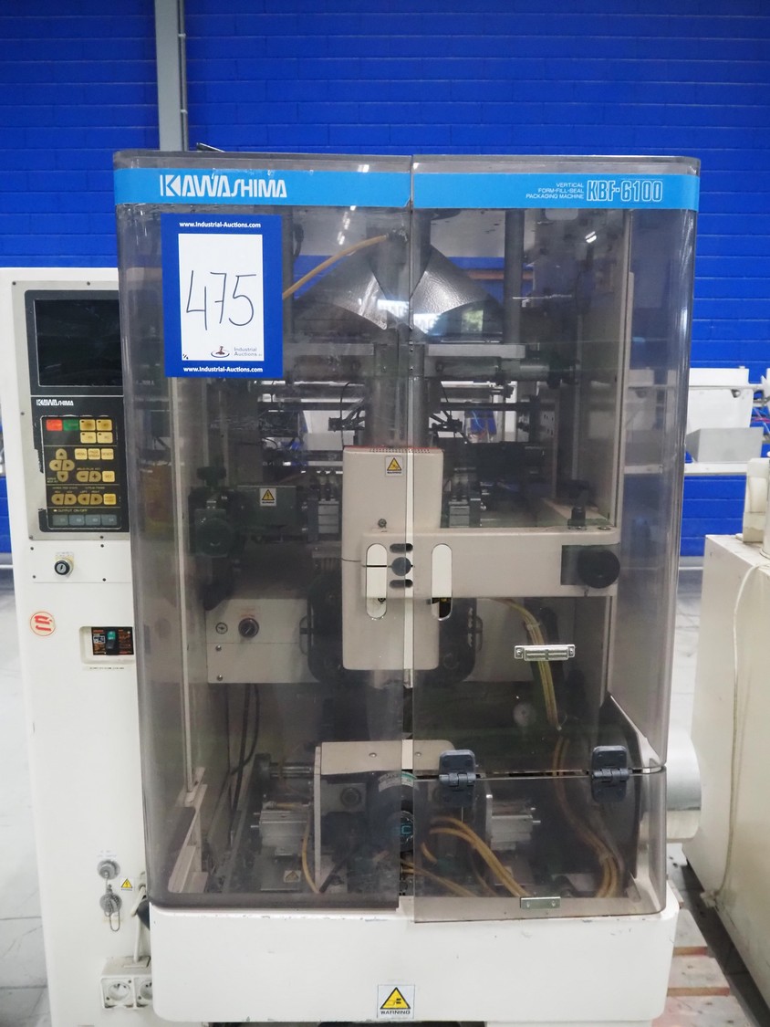 Kawashima vertical bag form-, fill-, and seal machine, model: KBF-6122, serial number: 824, year of construction: August 2001, film width: 370 mm, vertical seal length: 340 mm, horizontal seal length: 280 mm, total dimensions: 1700 mm x 1450 mm x 1810 mm.