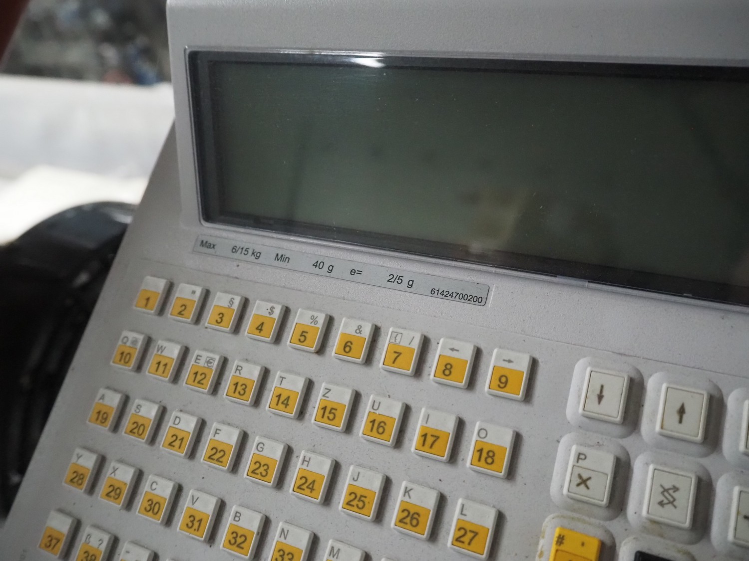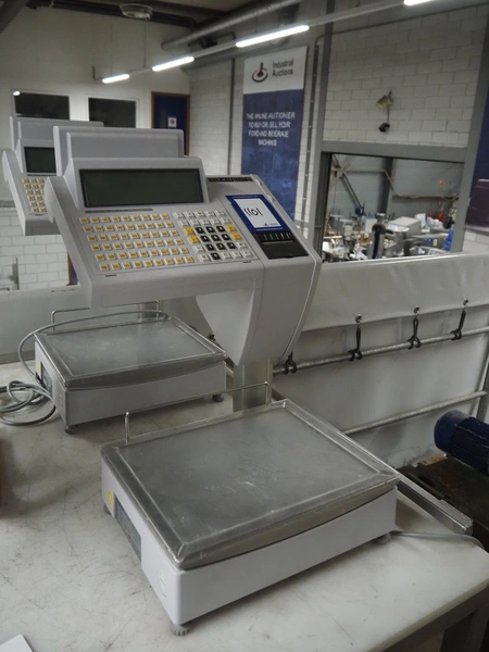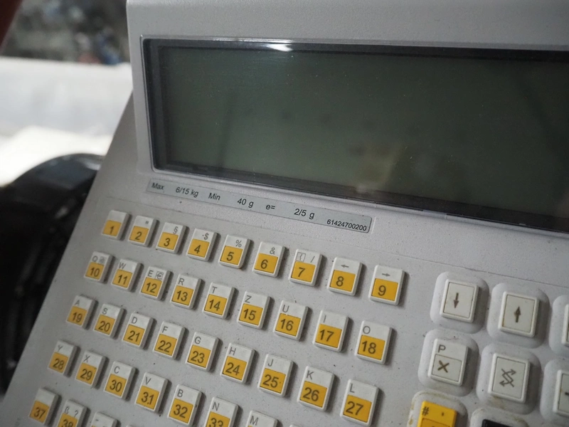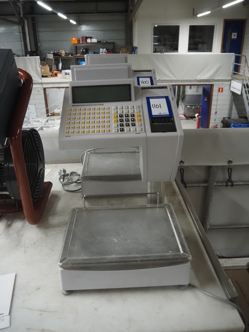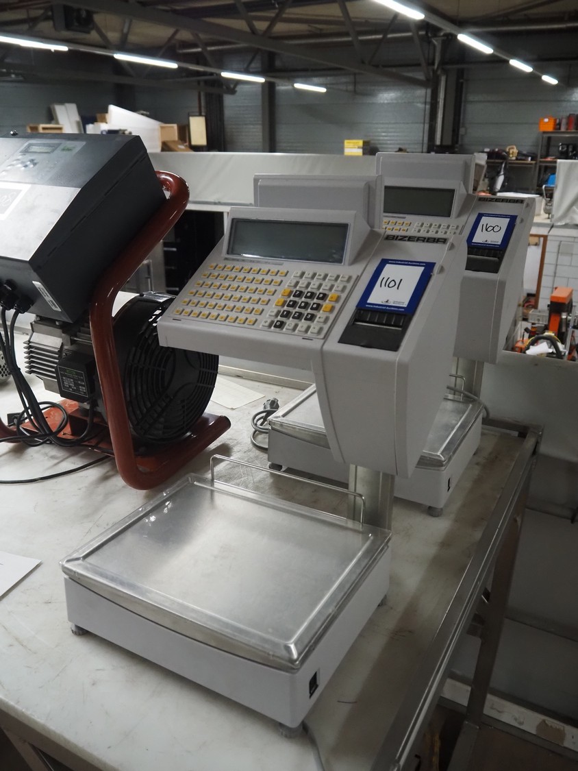 Bizerba weighing scale with label printer, type: SC II 800, serial number: 11854190, 120/240 V, 50/60 Hz, 0.35-0.25 A, minimum weight: 40 gram, maximum weight: 6/15 Kg, e= 2/5 gram, scale dimensions: 350 mm x 270 mm, total dimensions: 480 mm x 350 mm x 560 mm.