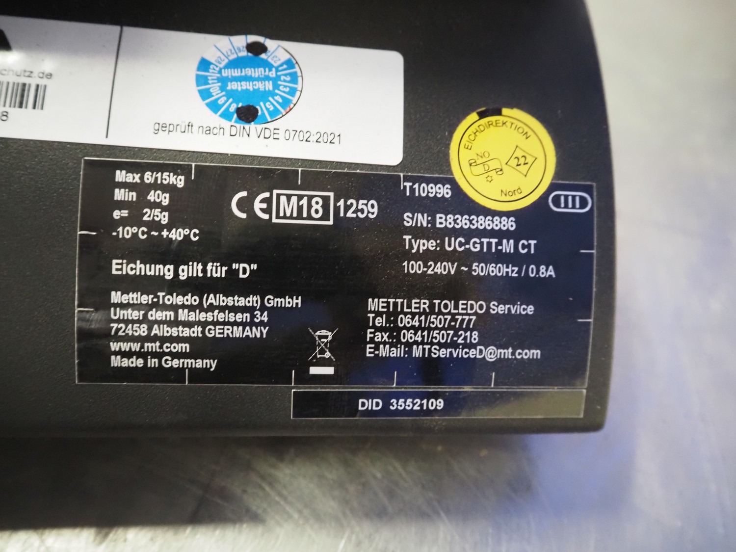 Mettler Toledo weighing scale with label printer, type: UC-GTT-M CT, serial number: B836386886, maximum: 6/15 kg, minimum: 40 gram, e= 2/5 gram, dimensions scale: 360 mm x 270 mm, total dimensions: 430 mm x 400 mm x 470 mm.