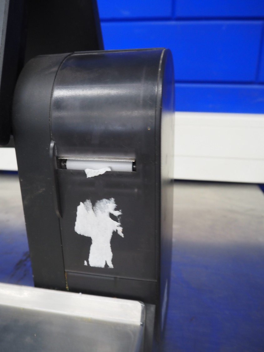 Mettler Toledo weighing scale with label printer, type: UC-GTT-M CT, serial number: B836386880, maximum: 6/15 kg, minimum: 40 gram, e= 2/5 gram, dimensions scale: 360 mm x 270 mm, total dimensions: 430 mm x 400 mm x 470 mm.