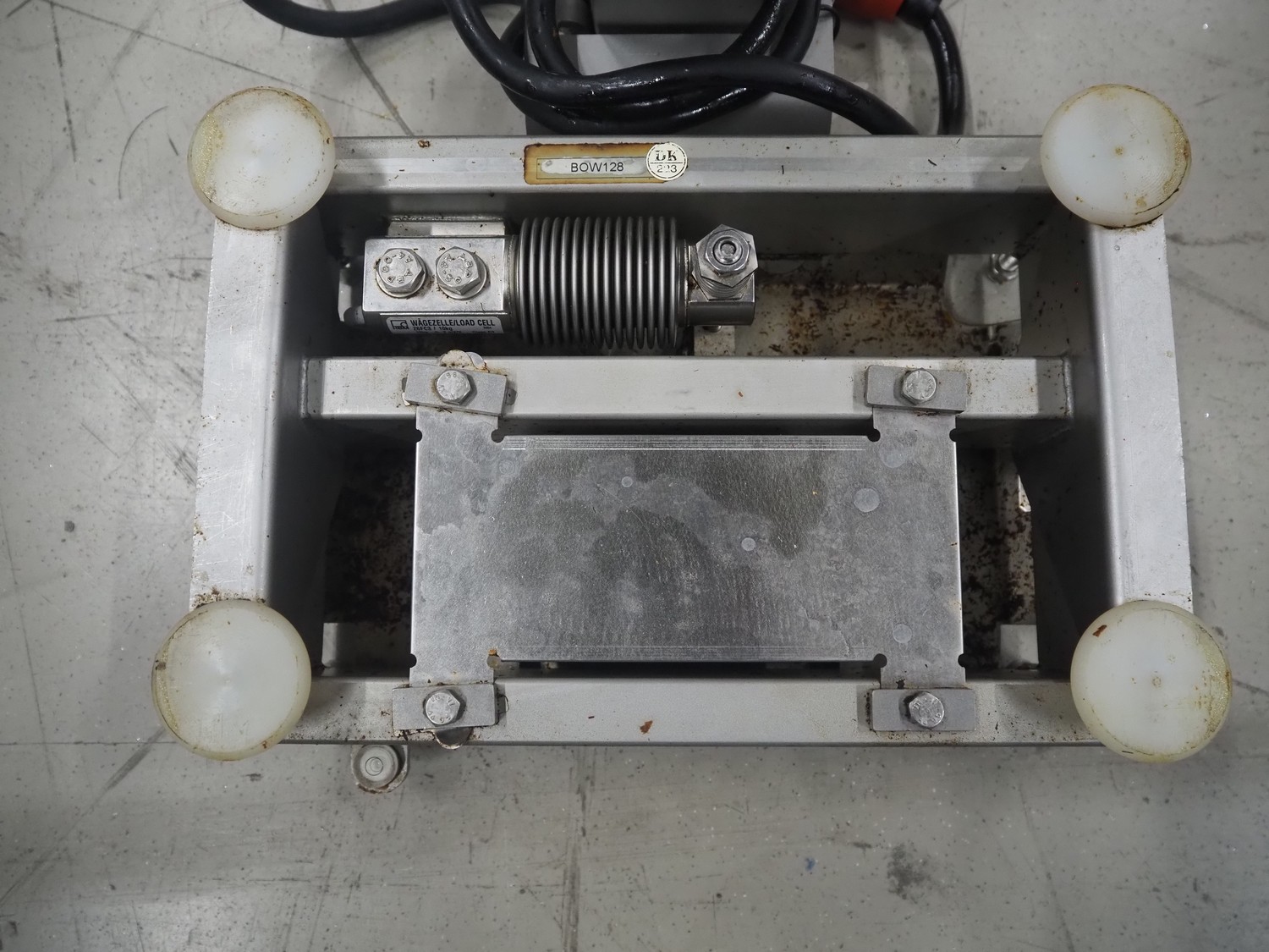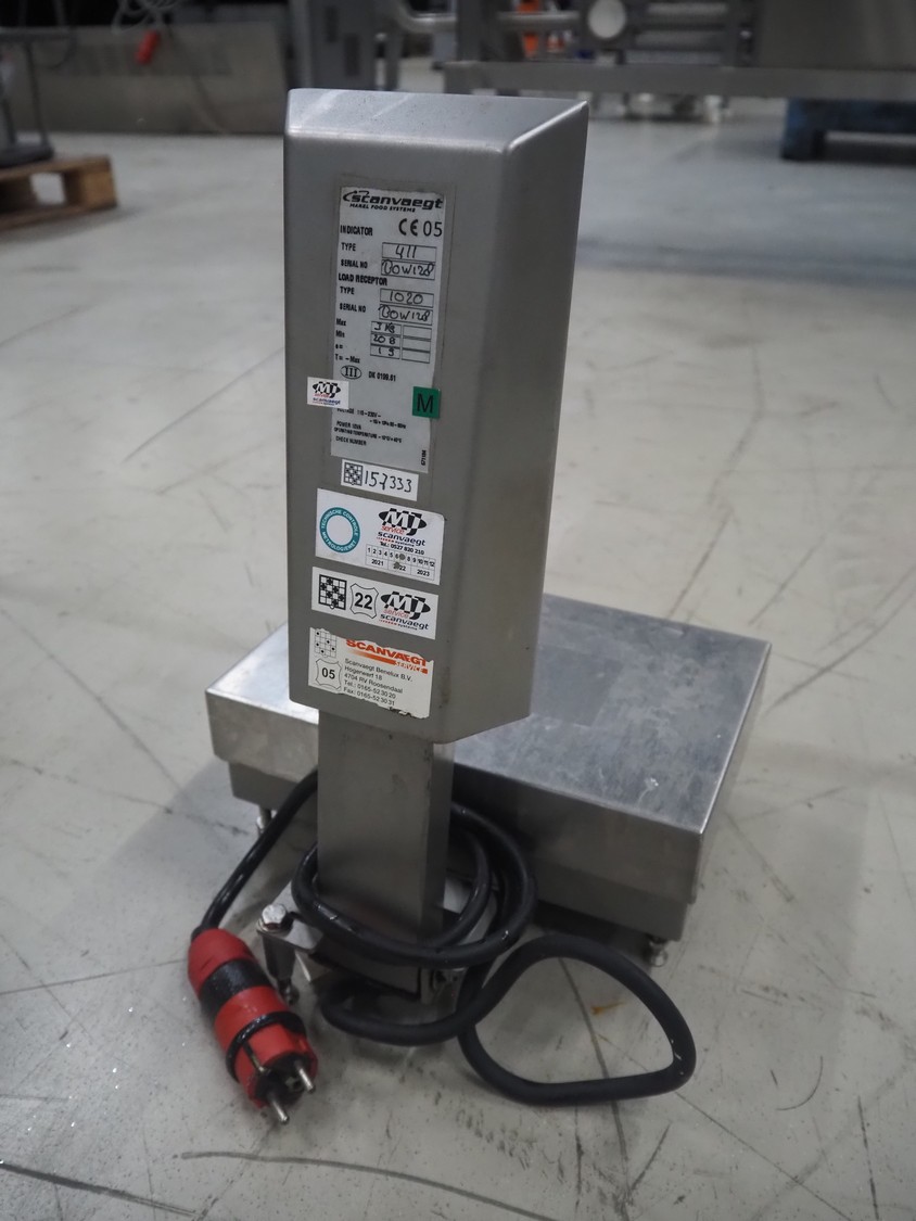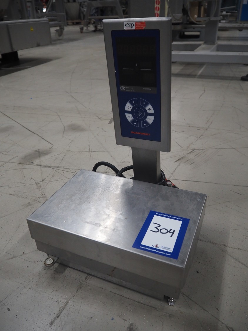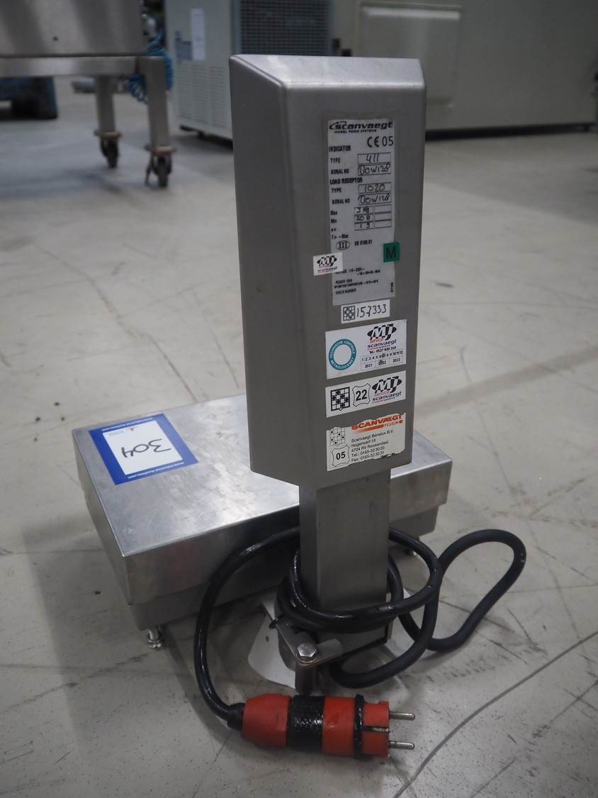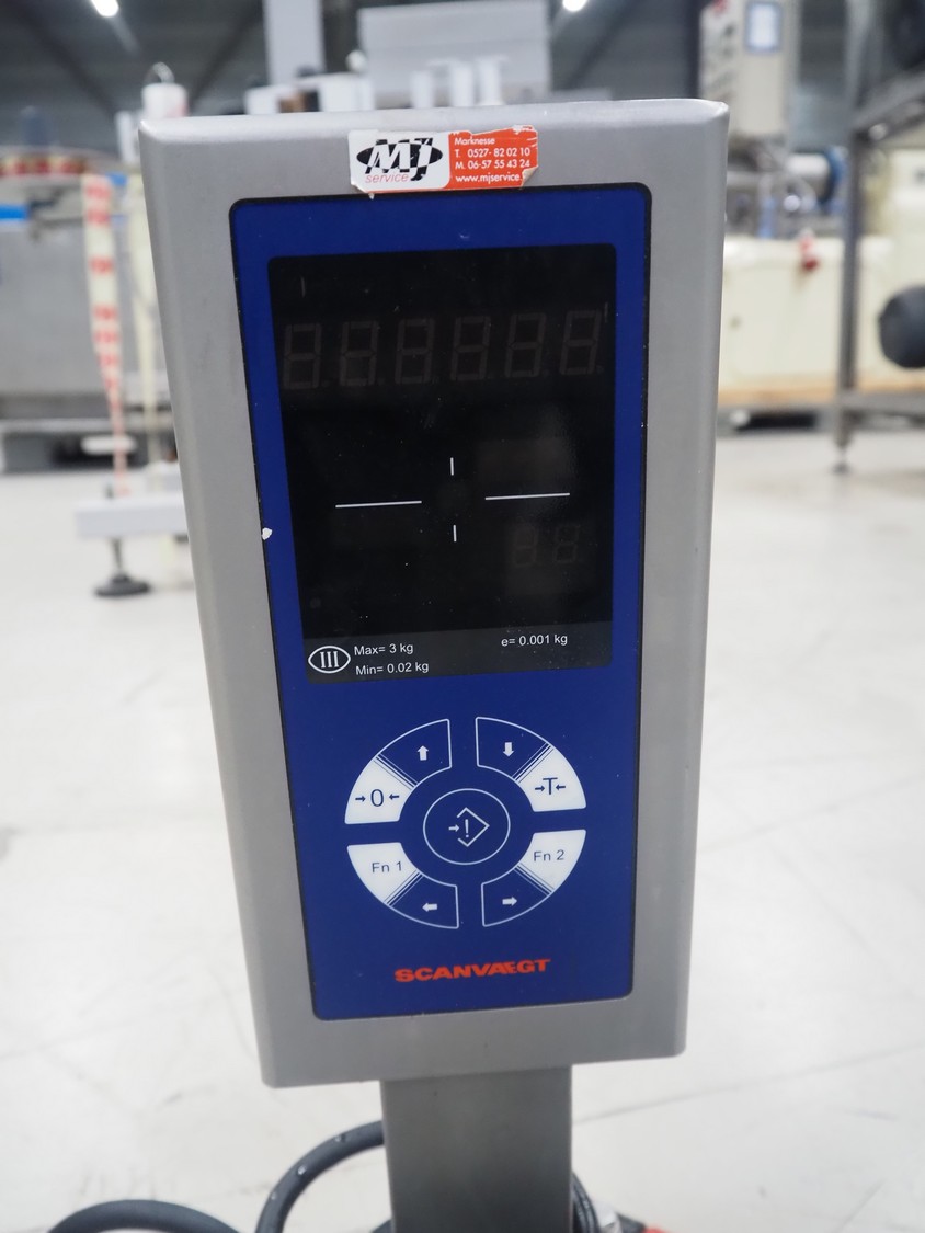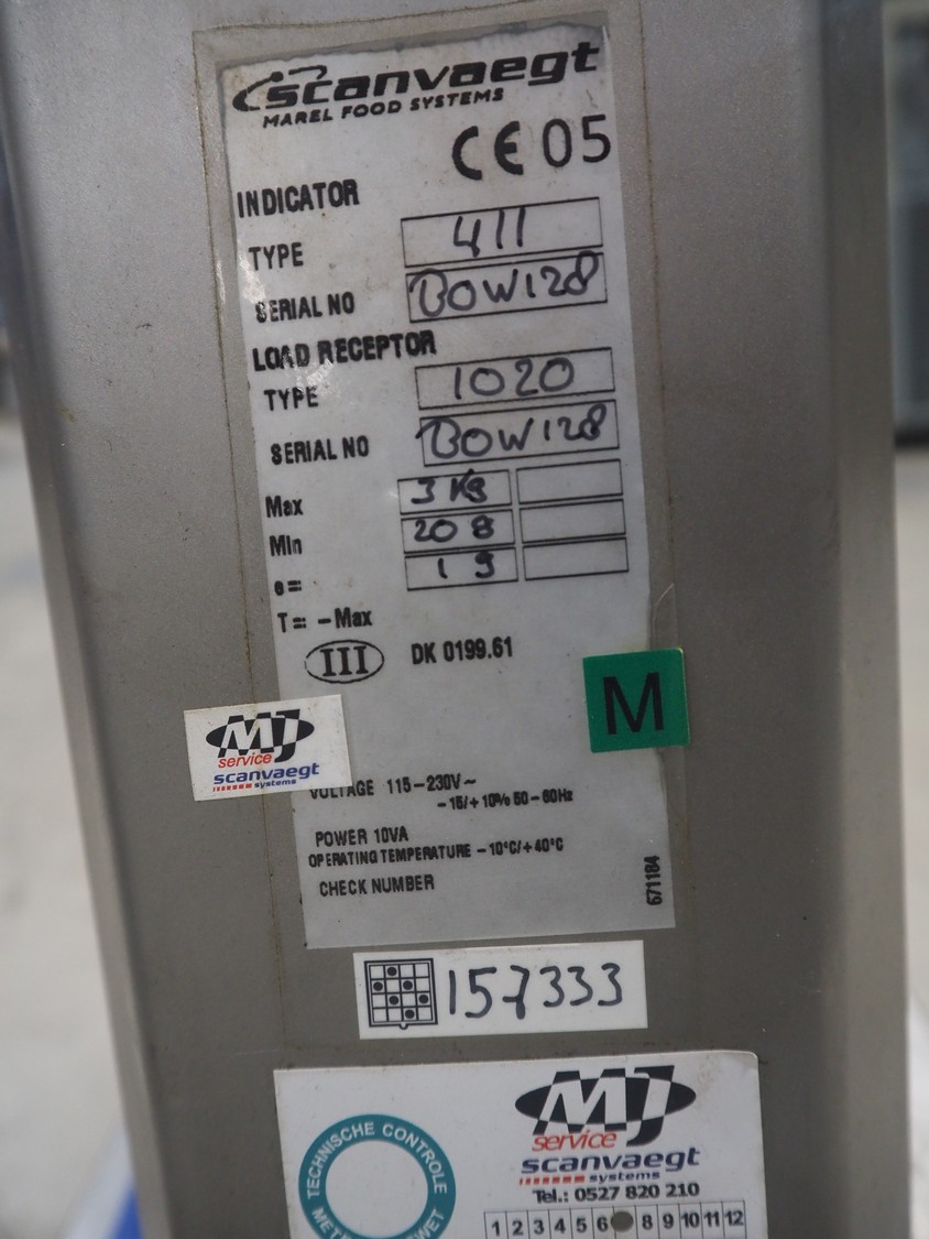 Scanvaegt weighing scale, serial number: BOW128, maximum weight: 3 kg, minimum weight: 0.02 kg, e=: 0.001 kg, dimensions: 300 mm x 280 mm x 450 mm.