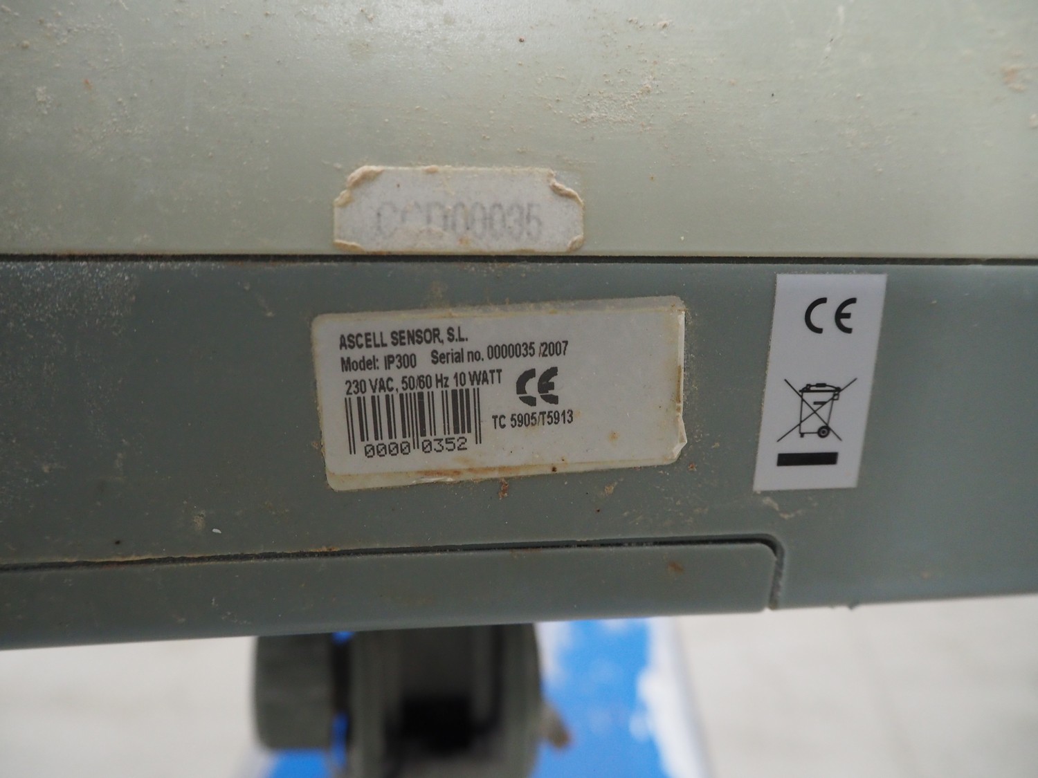 Ascell Sensor S.L. weighing scale, model: IP300, serial number: 0000035, year of construction: 2007, 230 V, 50/60 Hz, 10 W, maximum weight: 30 kg, minimum weight: 200 gram, e= 10 gram, dimensions scale: 400 mm x 300 mm, total dimensions: 510 mm x 300 mm x 550 mm.