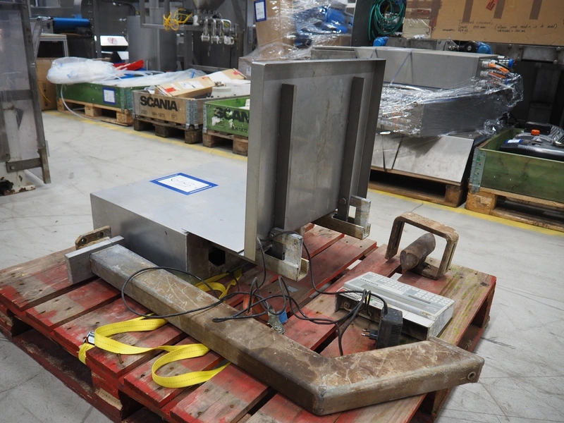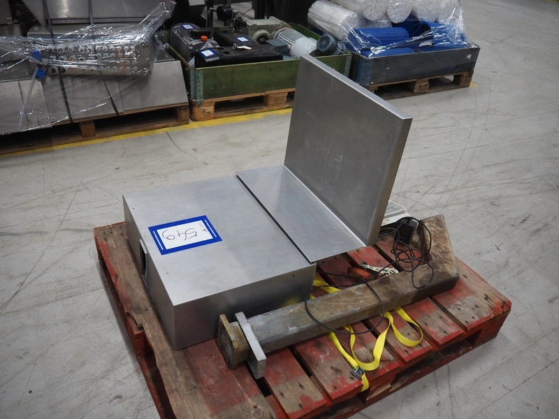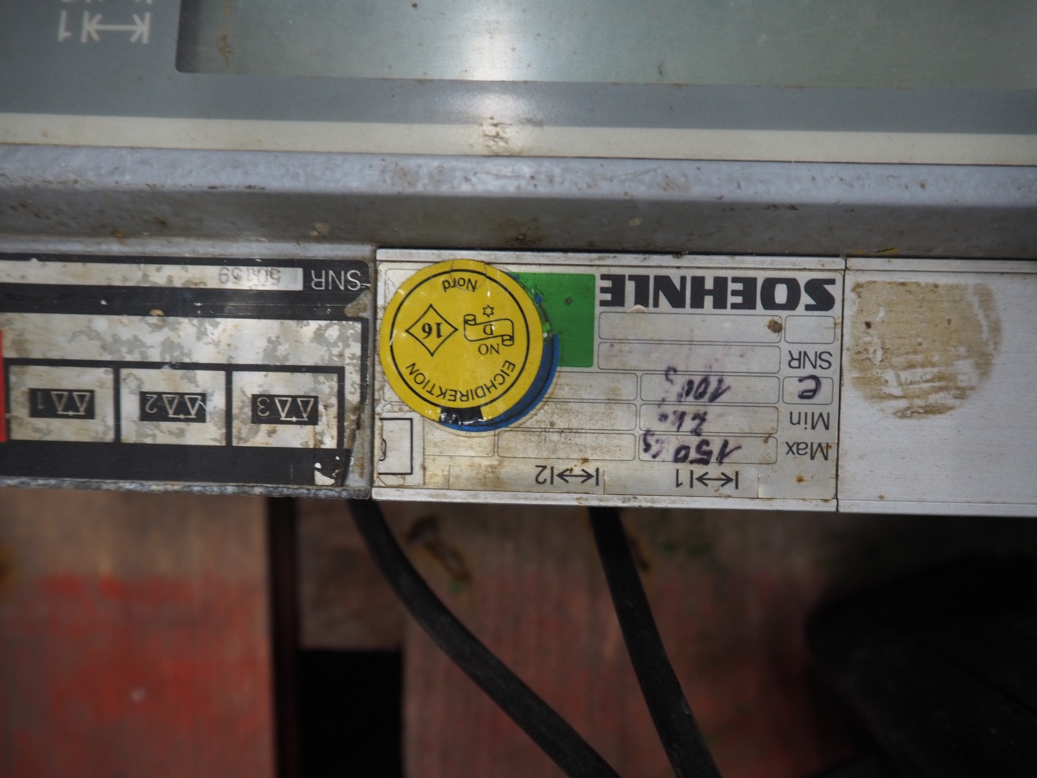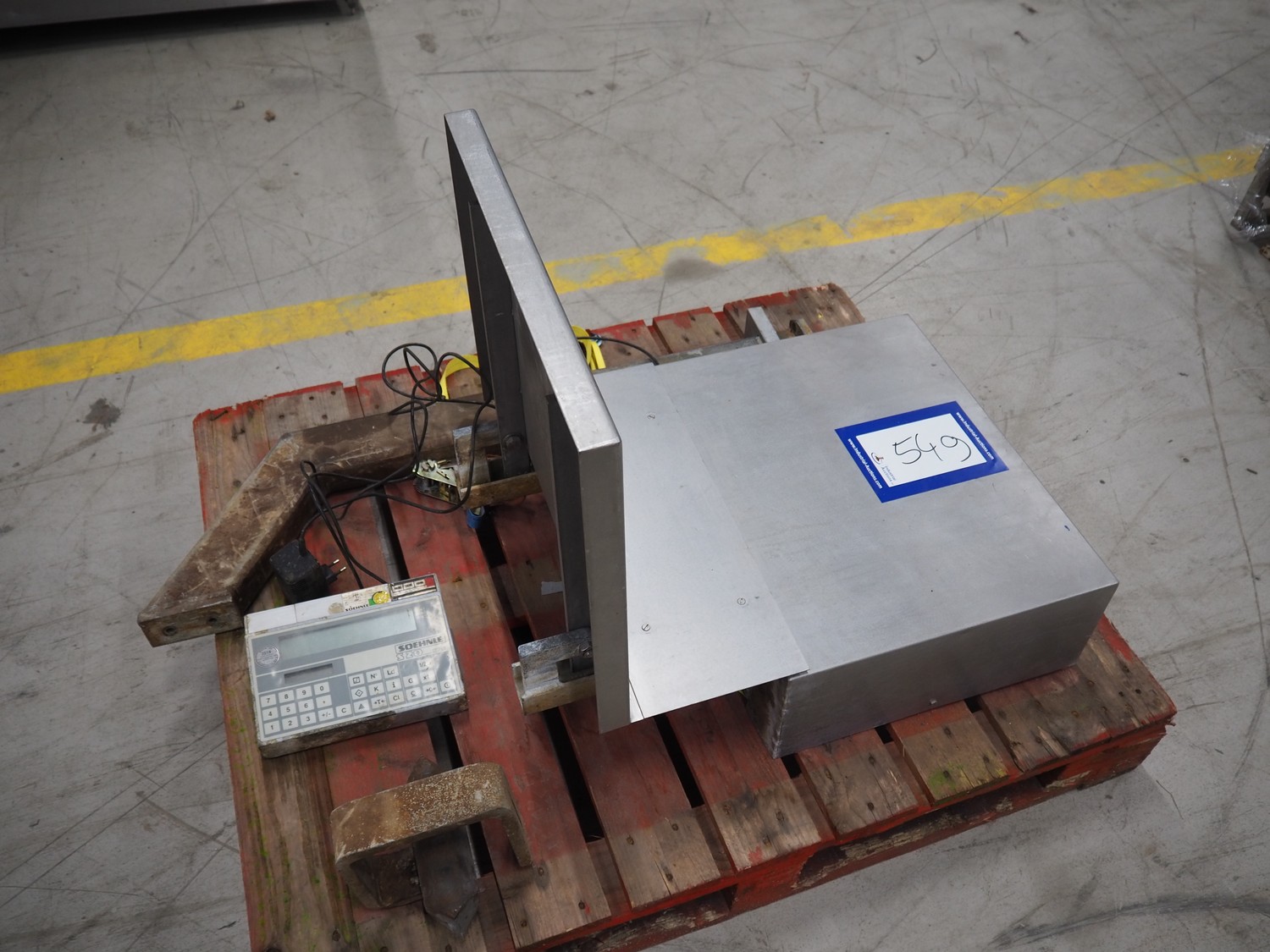 Weighing scale with Soehnle indicator, serial number: 50153, maximum weight: 150 kg, minimum weight: 2 kg, e = 100 gram, dimensions: 560 mm x 600 mm x 750 mm.