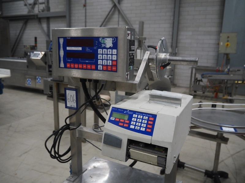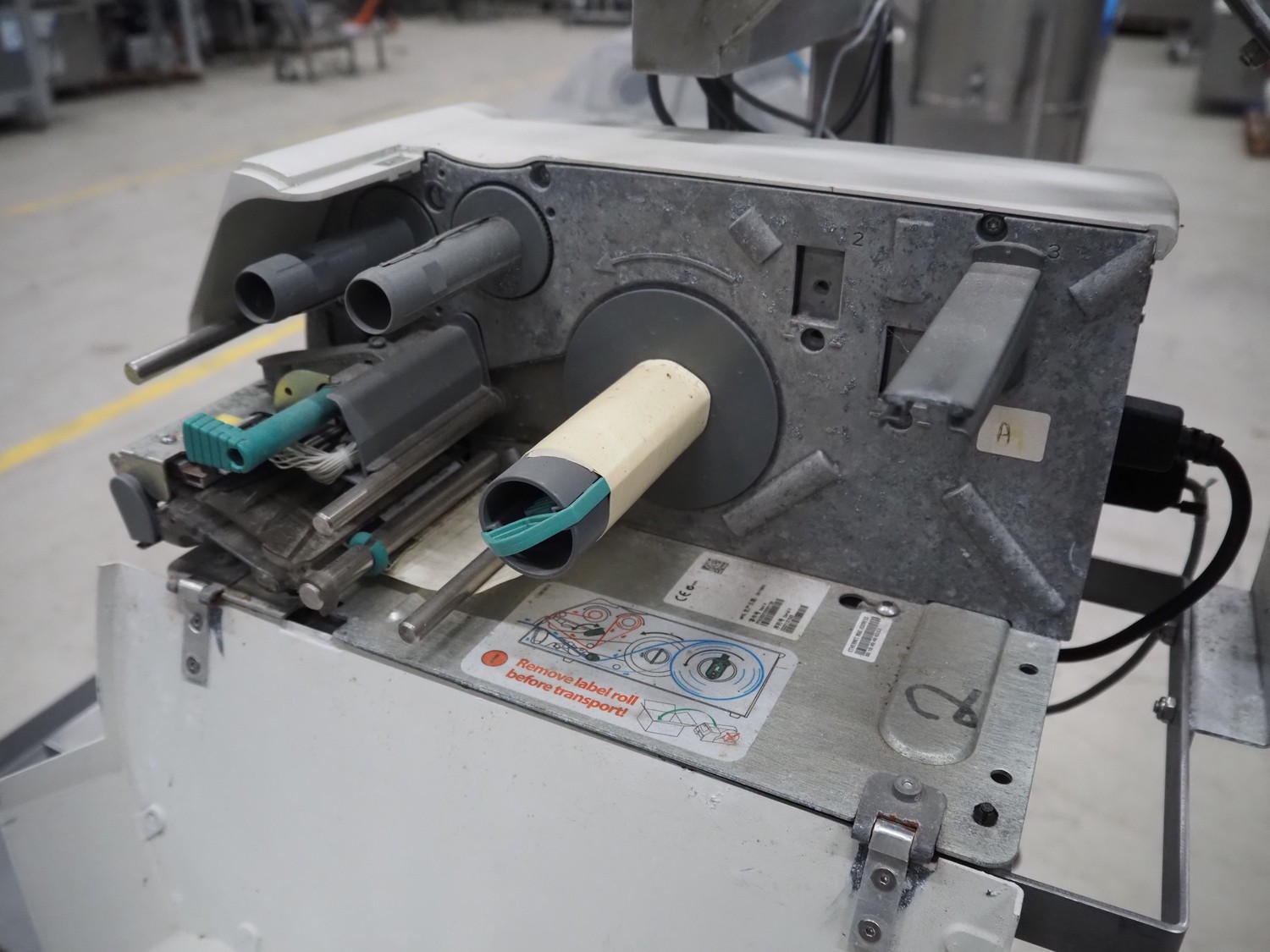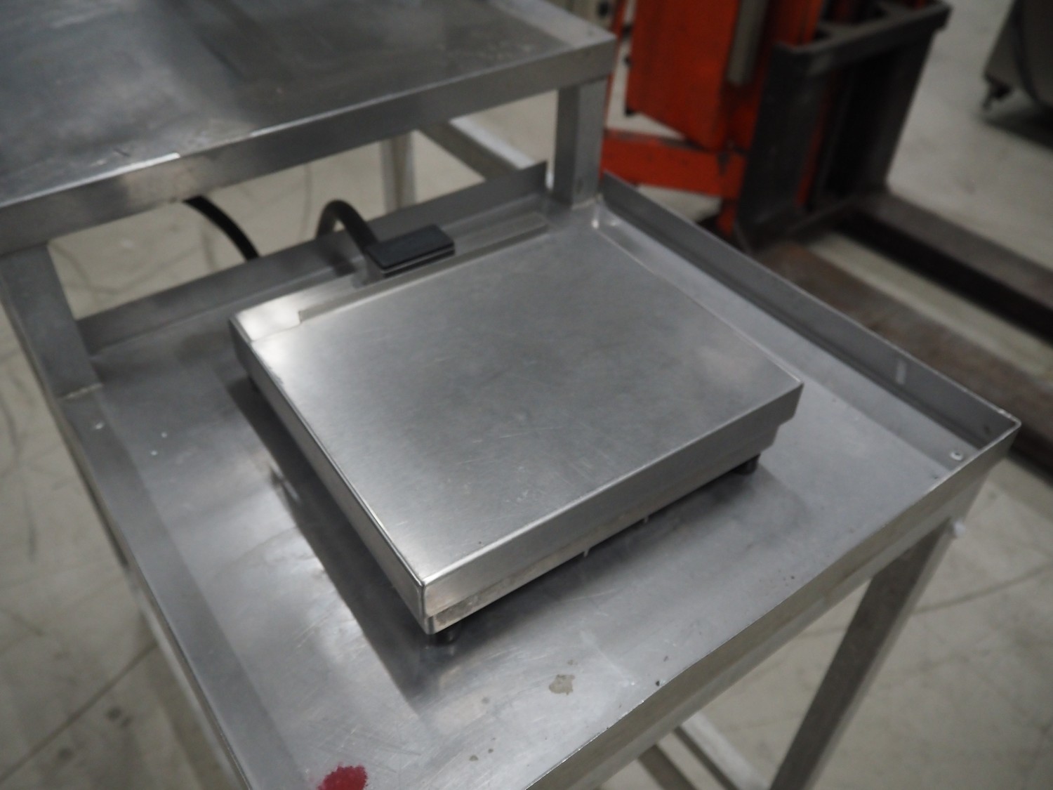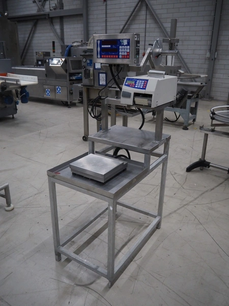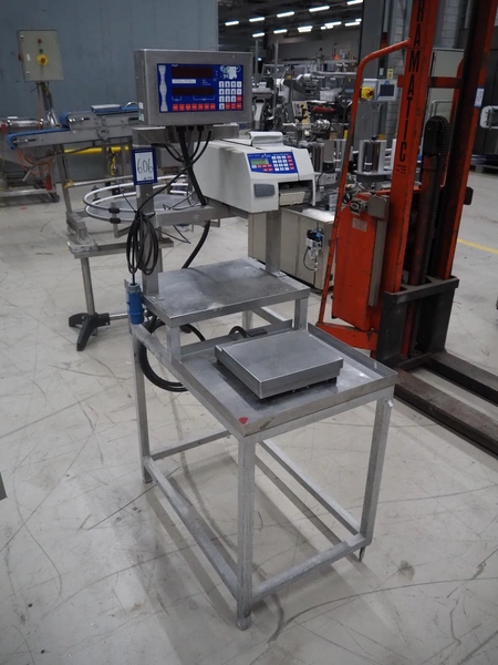HPSL weighing scale with label printer on s/s frame, serial number scale: HS108814, year of construction: 2011, 230 V, 50 Hz, maximum capacity: 3 kg, minimum capacity: 0.02 kg, e= 0.001 kg, T= -1.000 kg, scale dimensions: 275 mm x 225 mm, total dimensions: 860 mm x 520 mm x 1575 mm.