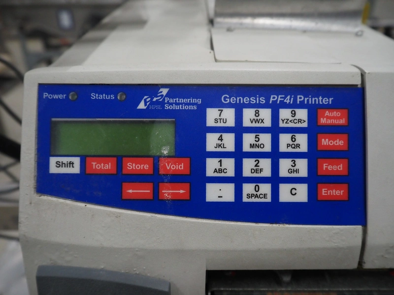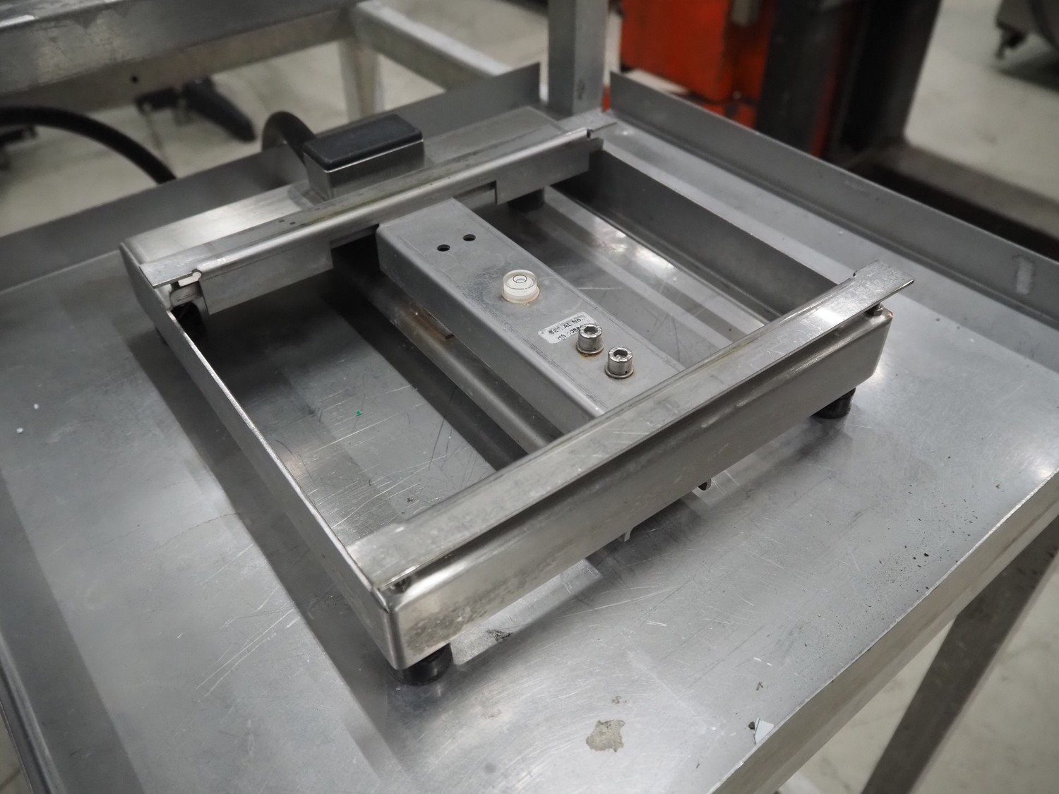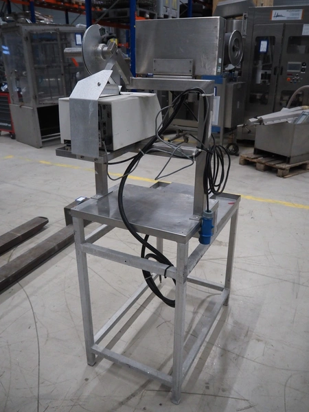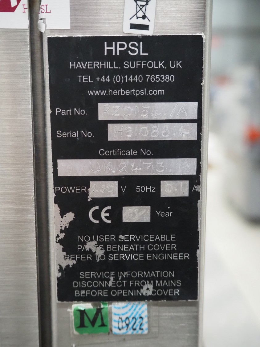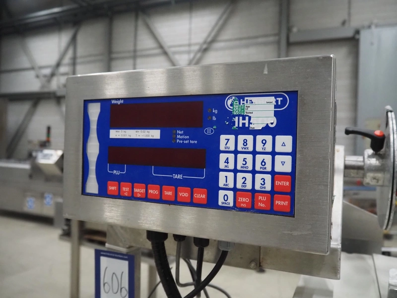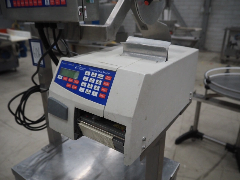 HPSL weighing scale with label printer on s/s frame, serial number scale: HS108814, year of construction: 2011, 230 V, 50 Hz, maximum capacity: 3 kg, minimum capacity: 0.02 kg, e= 0.001 kg, T= -1.000 kg, scale dimensions: 275 mm x 225 mm, total dimensions: 860 mm x 520 mm x 1575 mm.