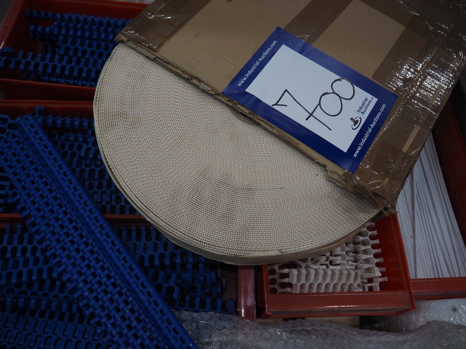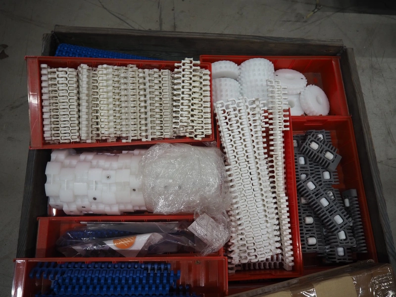 Pallet with various parts for plastic mesh belts, belt widths: 150 mm / 300 mm / 380 mm, dimensions pallet: 1200 mm x 800 mm x 400 mm.