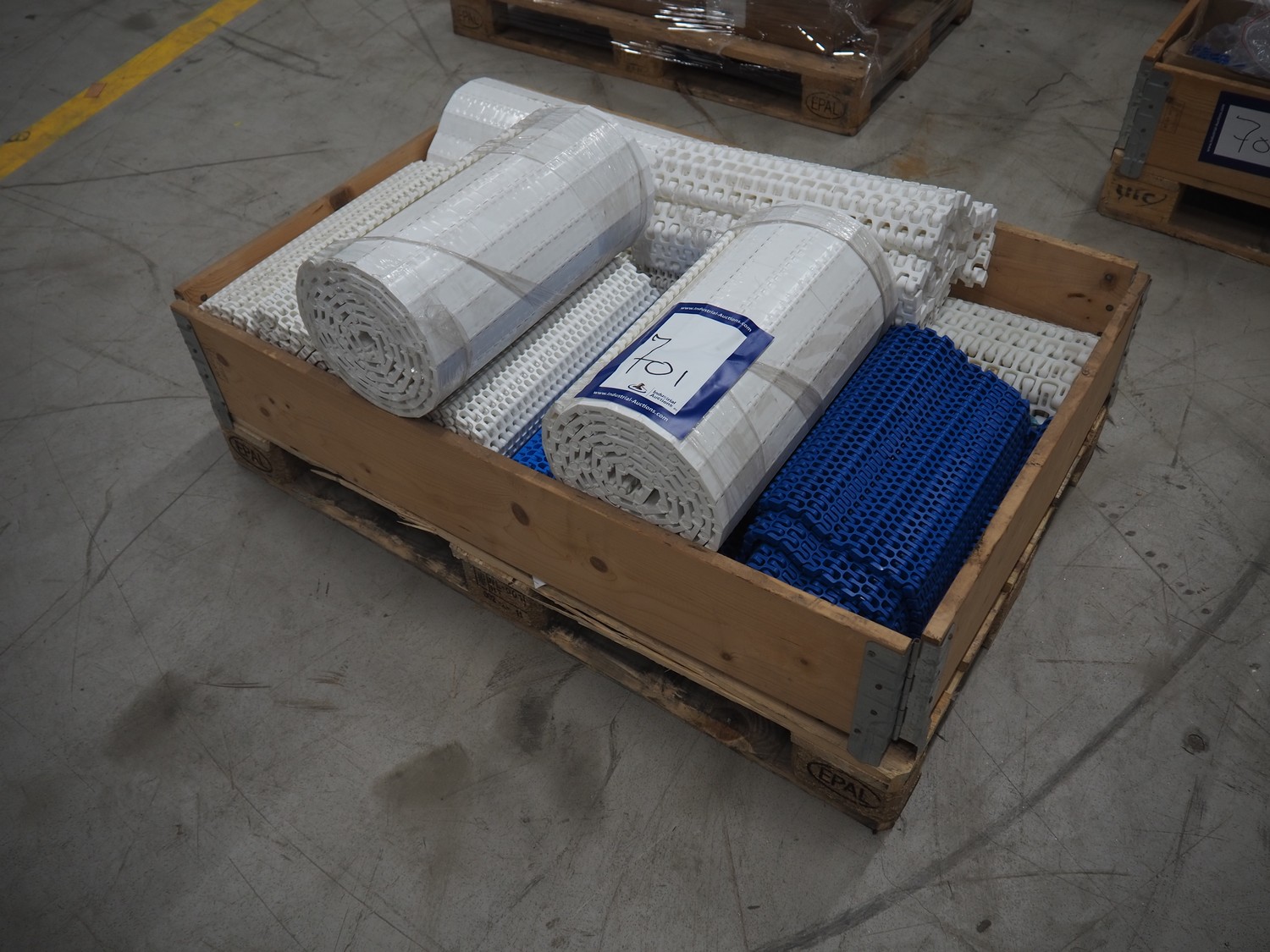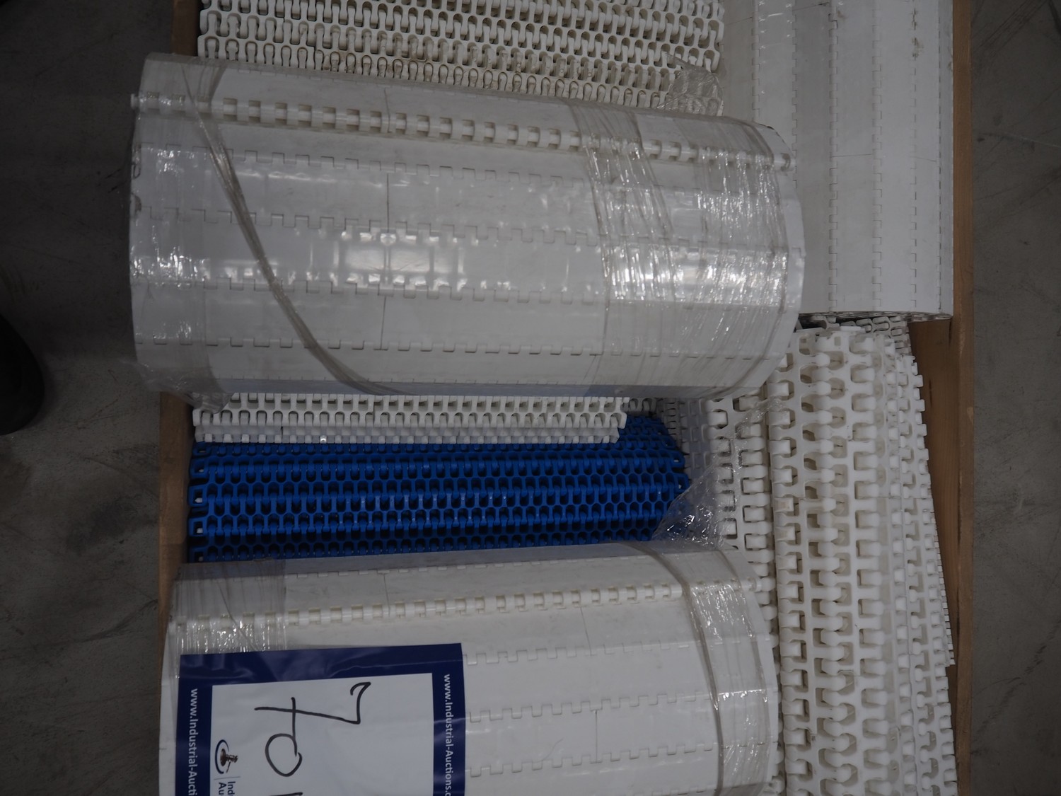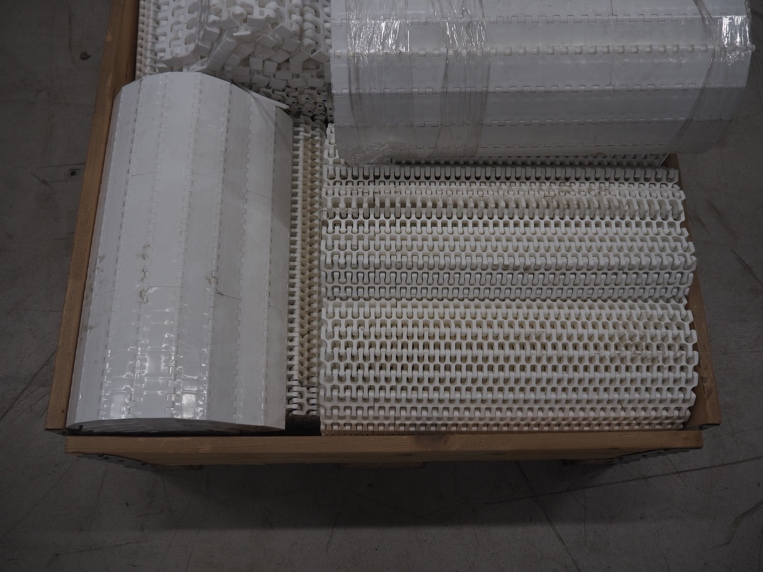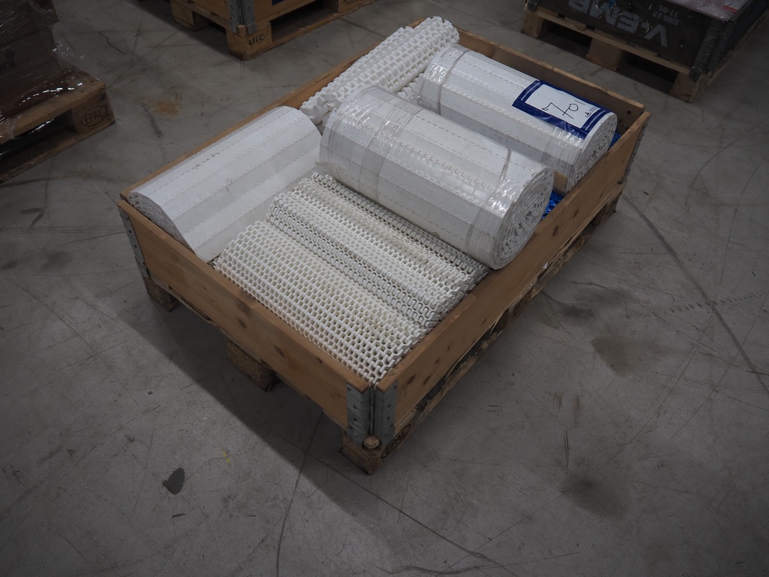 Pallet with various parts for plastic mesh belts, belt widths: 360 mm / 450 mm, dimensions pallet: 1200 mm x 800 mm x 400 mm.