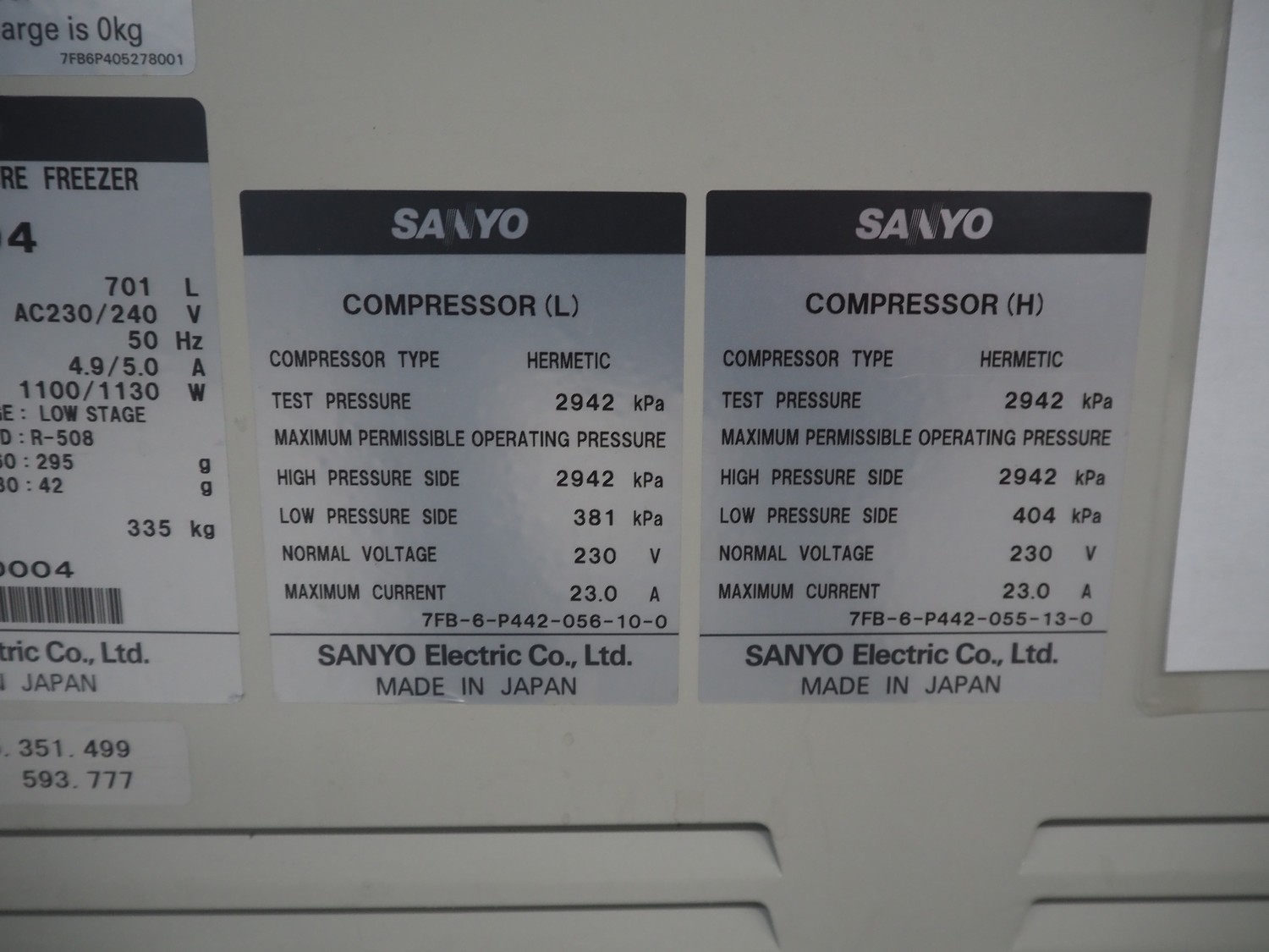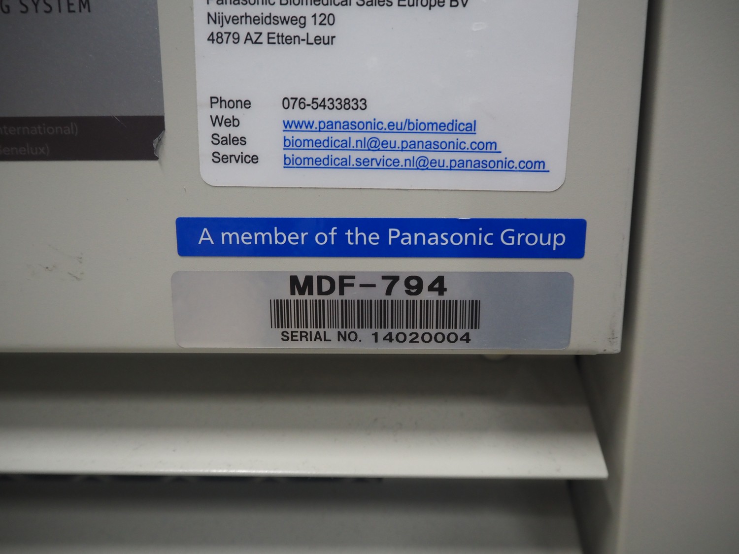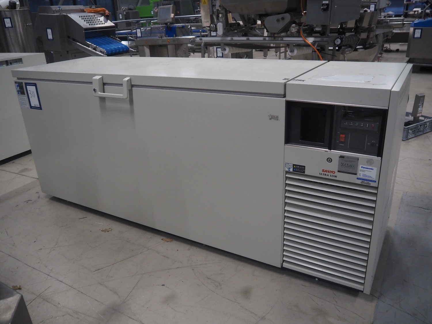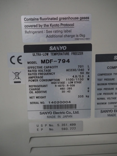 Sanyo Ultra-low temperature freezer, model: MDF-794, serial number: 14020004, 230/240 V, 50 Hz, 4.9/5.0 A, 1100/1130 W, refrigerant: R-407D:R508, 460:295 gram, volume: 701 liter, dimensions: 2570 mm x 870 mm x 1080 mm.