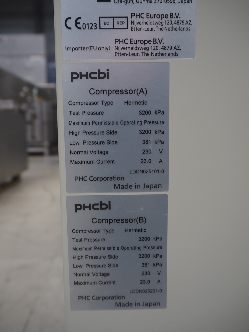 PHCBI ultra-low temperature freezer, model: MDF-DC700VX-PE, serial number: 19100039, year of construction: 2019, 230/240 V, 50 Hz, 4.8/5.0 A, 1070/1130 W, refrigerant: HFC-245fa/R-600/HFC-23/PFC-14, 0.550 kg, volume: 715 liter, dimensions: 2300 mm x 960 mm x 1070 mm.