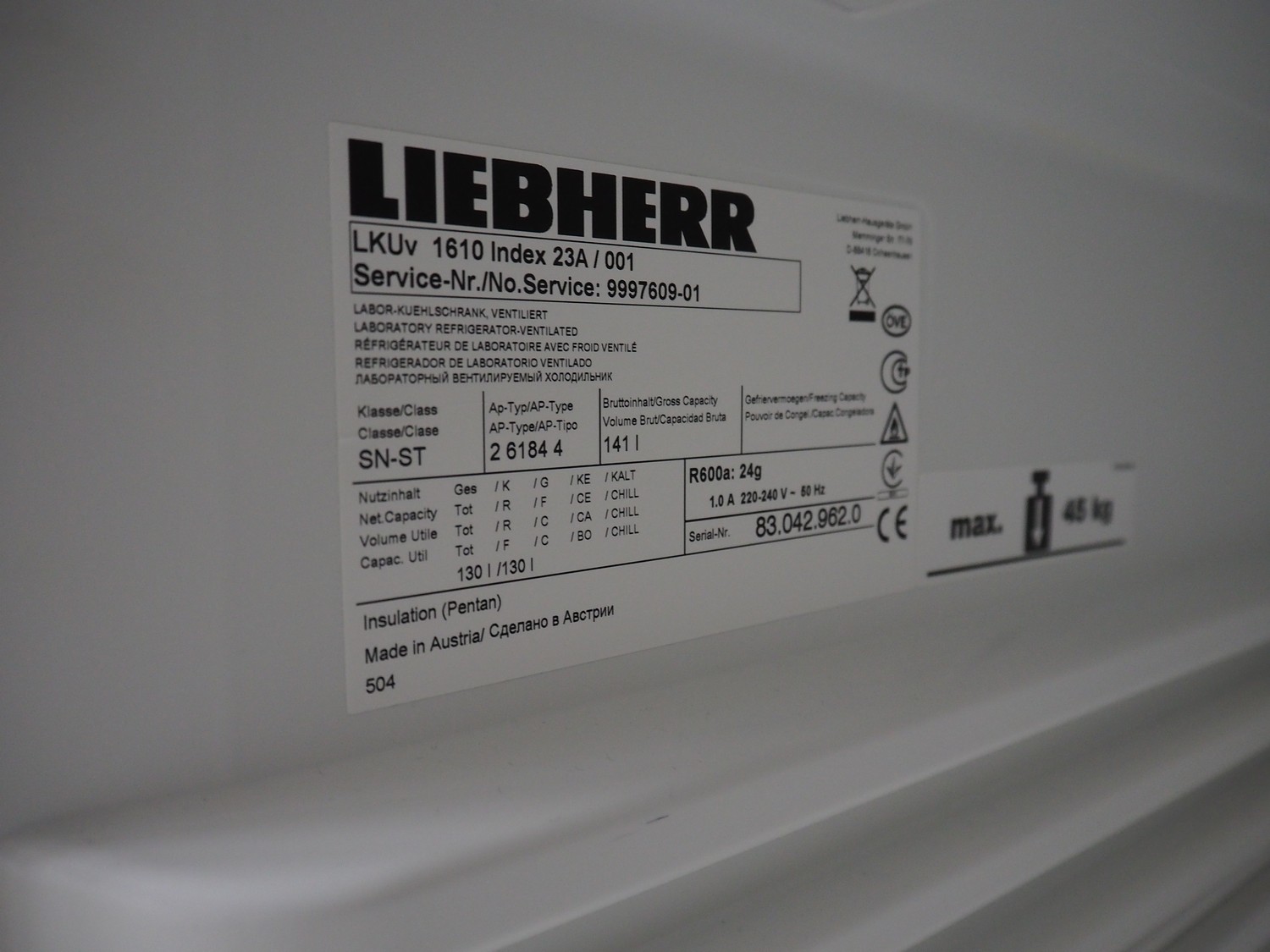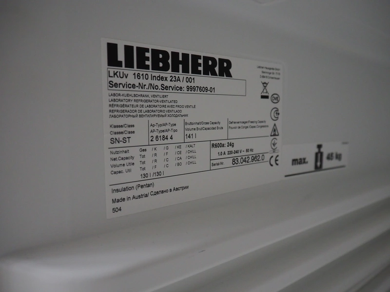 Liebherr laboratory refrigerator, model: LKUv 1610, serial number: 83.042.962.0, 220-240 V, 50 Hz, 1.0 A, refrigerant: R600a, 24 gram, volume: 130 liter, dimensions: 620 mm x 600 mm x 840 mm.