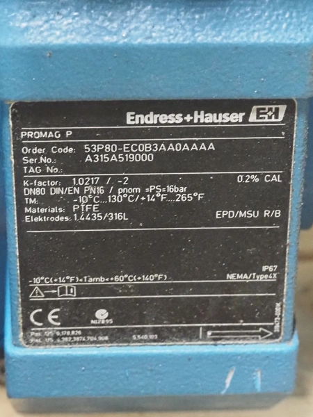 2 Endress + Hauser flowmeters, model: Promag P/Promag 53, dimensions: (2x) 400 mm x 250 mm x 250 mm.