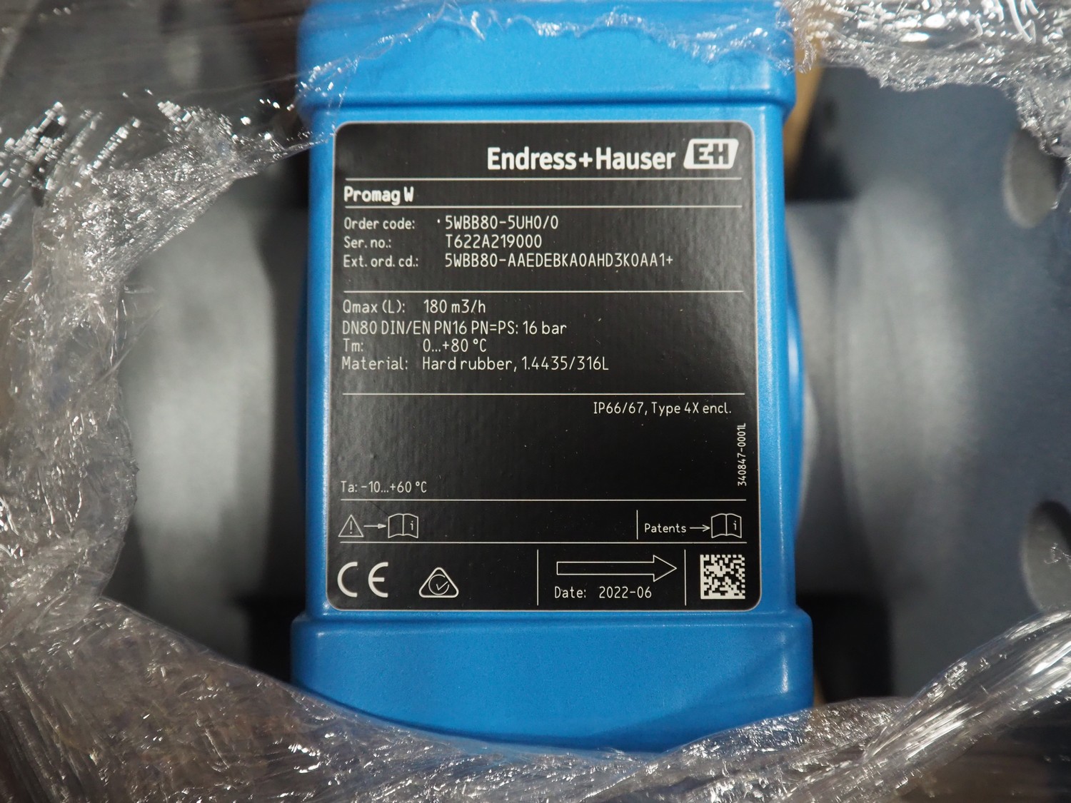 Endress + Hauser flowmeter, model: Promag W, serial number: T622A219000, DN 80, Q-maximum: 180 m³ per hour.