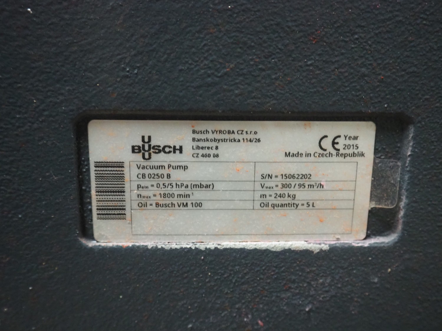 Busch vacuum pump, type: CB 0250, serial number: 15062202, year of construction: 2015, capacity: 300 m³/h, dimensions: 1150 mm x 450 mm x 550 mm.