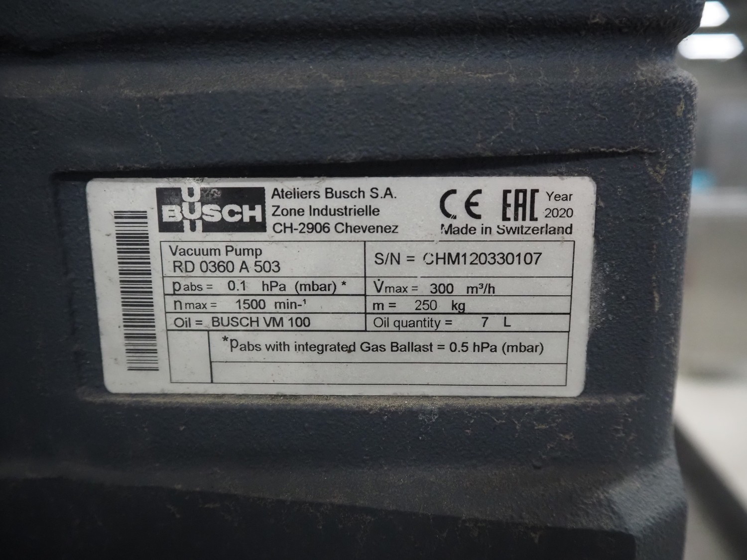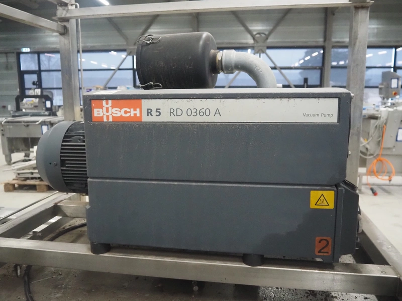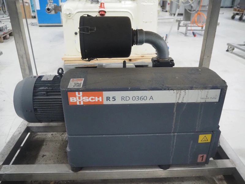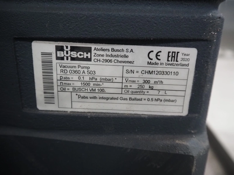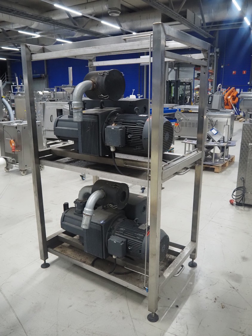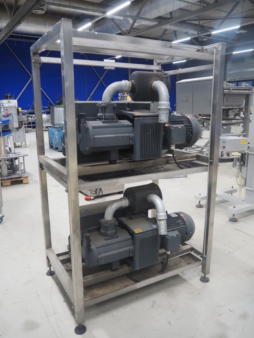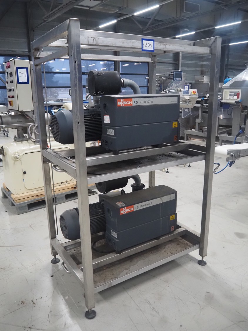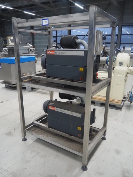 S/s rack with 2 Busch vacuum pumps, type: (2x) RD 0360 A 503, serial number: CHM120330107 / CHM120330110, year of construction: 2020, capacity: (2x) 300 m³ per hour, total dimensions: 1150 mm x 800 mm x 1850 mm.